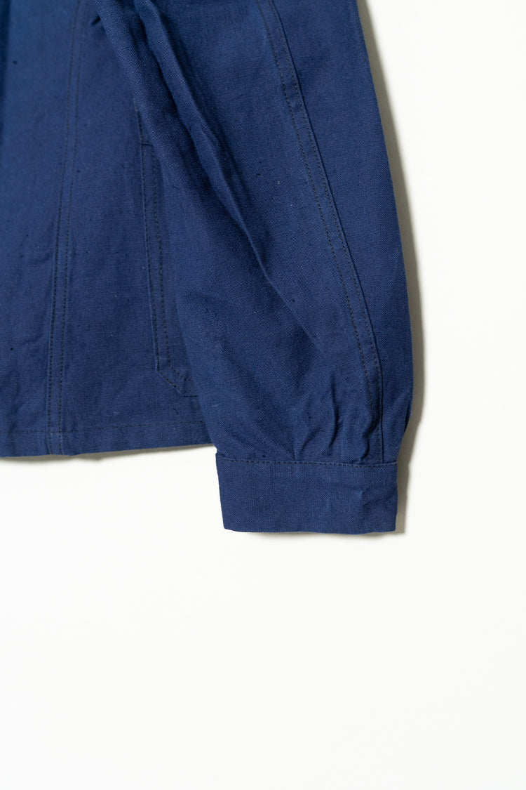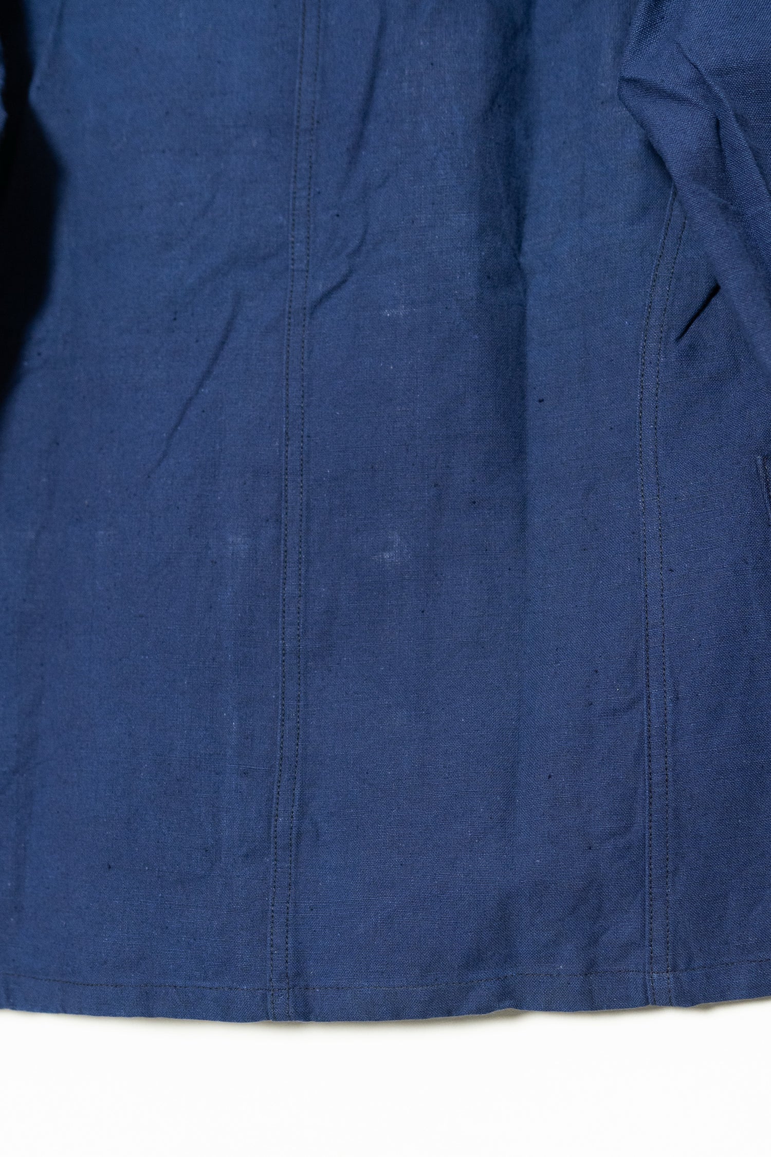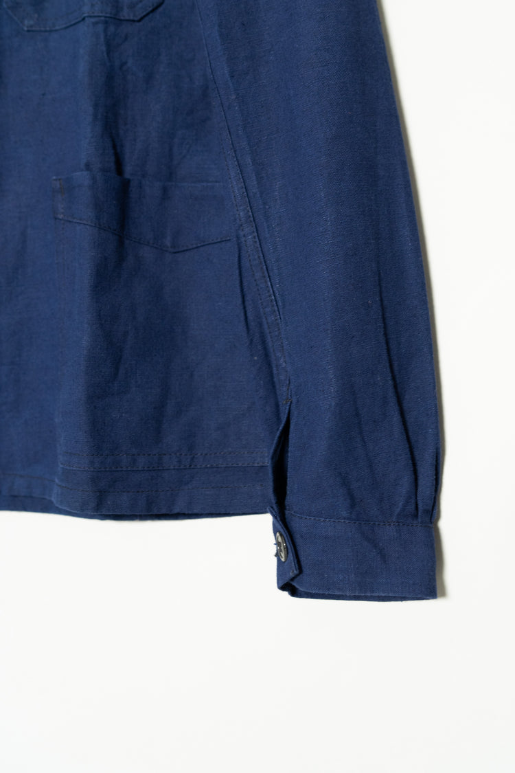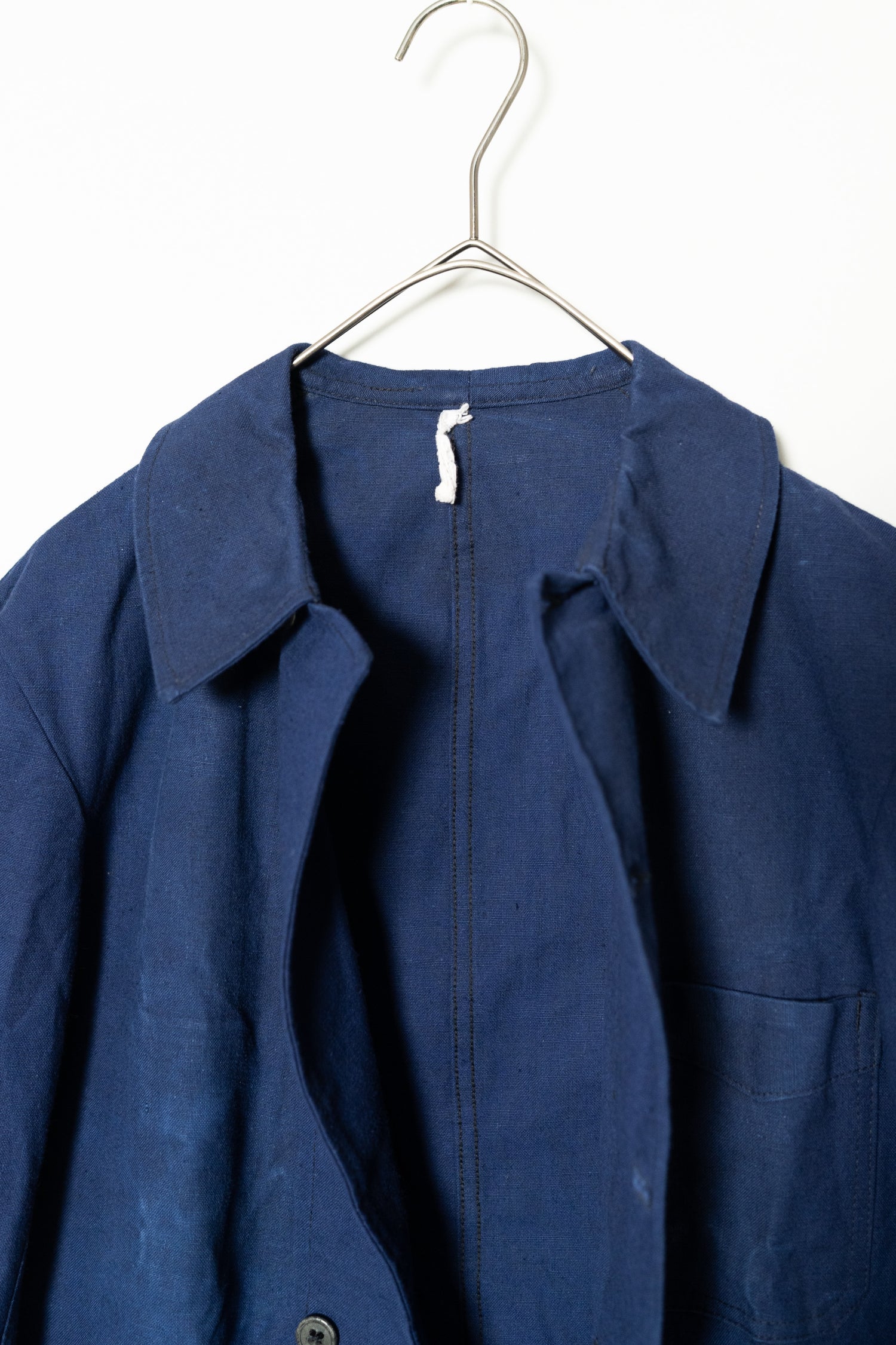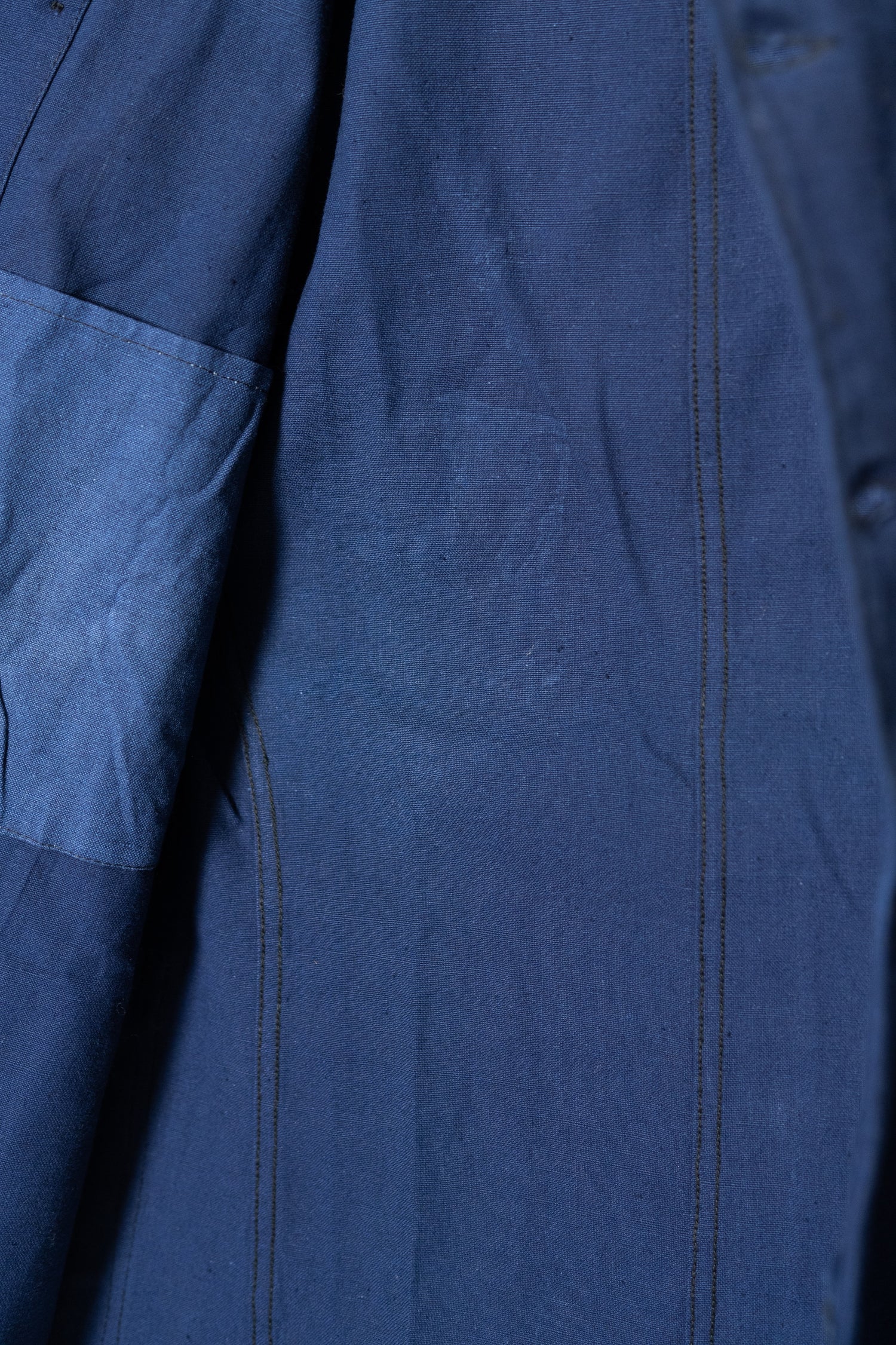 リネンの強靭さと通気性、コットンの柔らかさと馴染みの良さを兼ね備えたこの素材は、当時のワークウェアやユニフォームに多く採用されていました。特に本品のようにインディゴ染めを施したタイプは、経年変化が美しく、時とともに深みを増す独特の青が魅力です。現在の視点から見れば、この「リネンコットンのインディゴ混紡」は、サステナブル素材の先駆けとも言えるもの。耐久性と機能性、そして審美性を高い次元で両立させた、当時のフランスの職人技の結晶です。