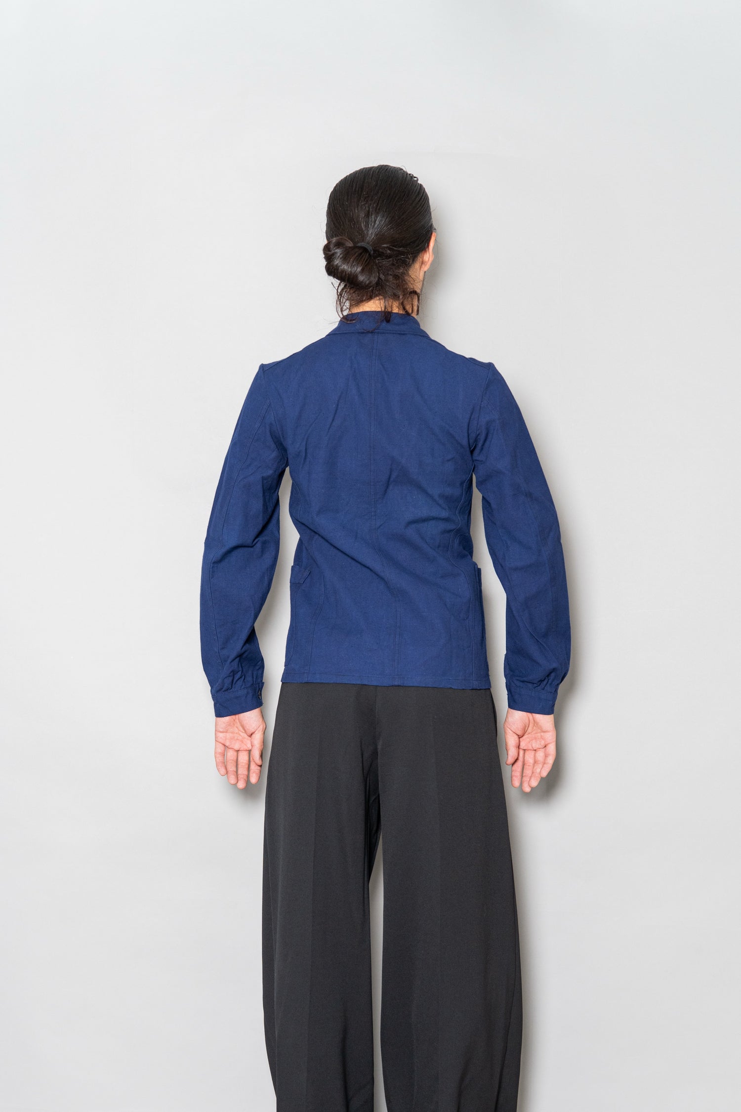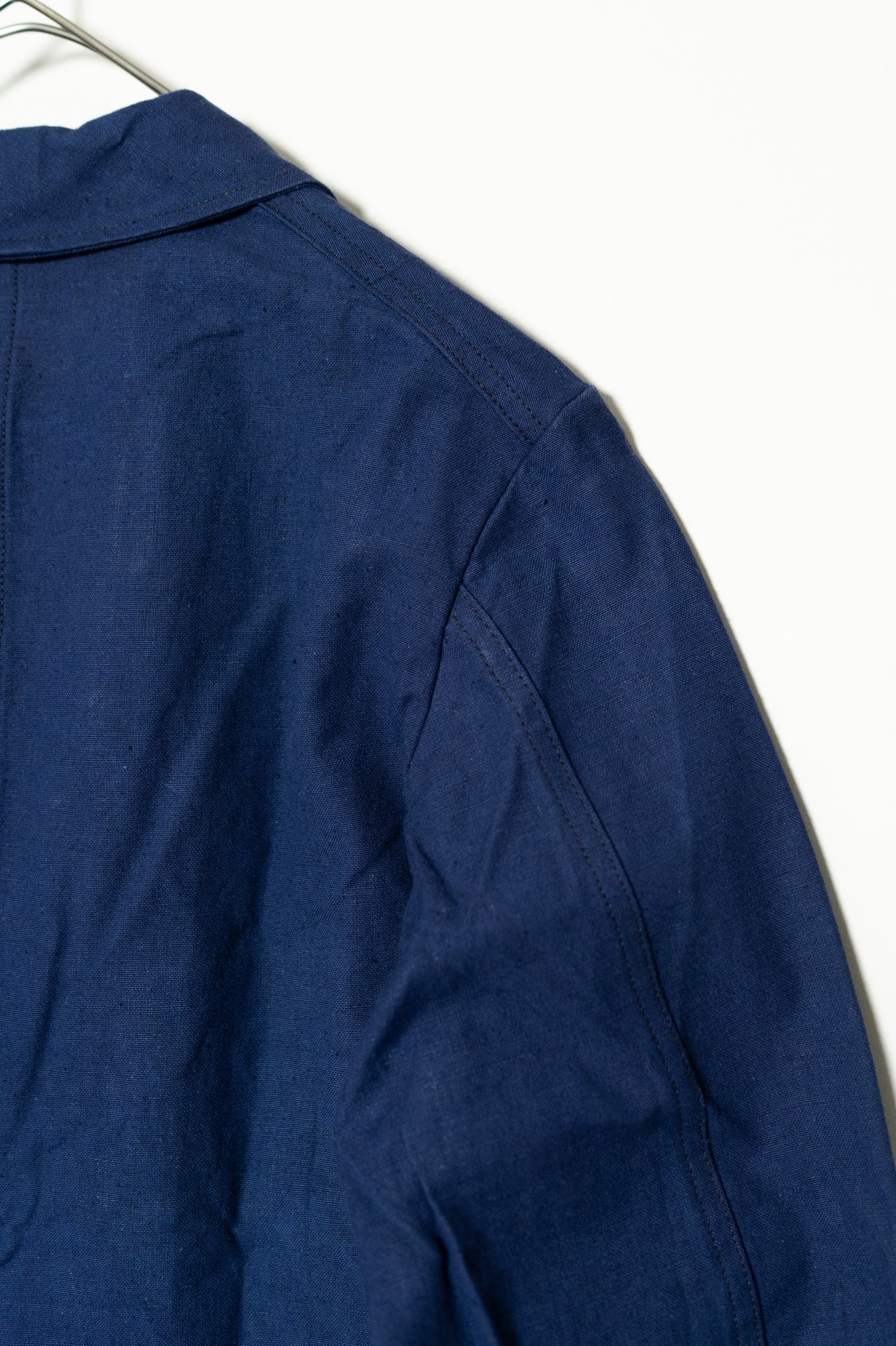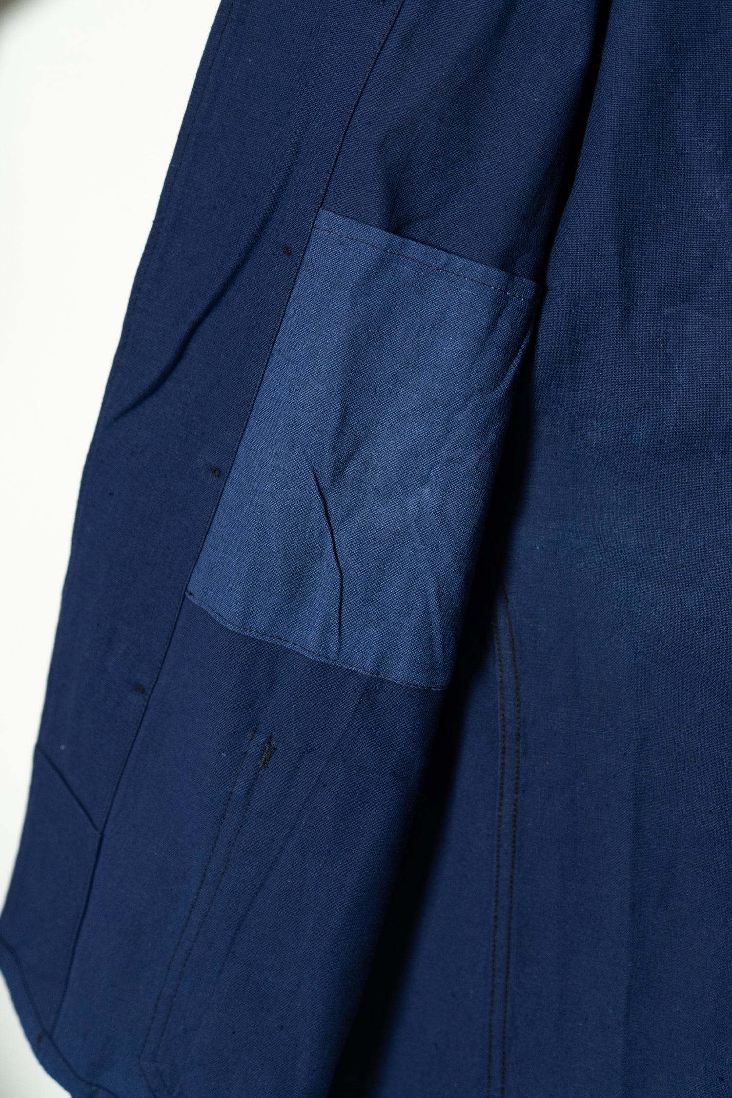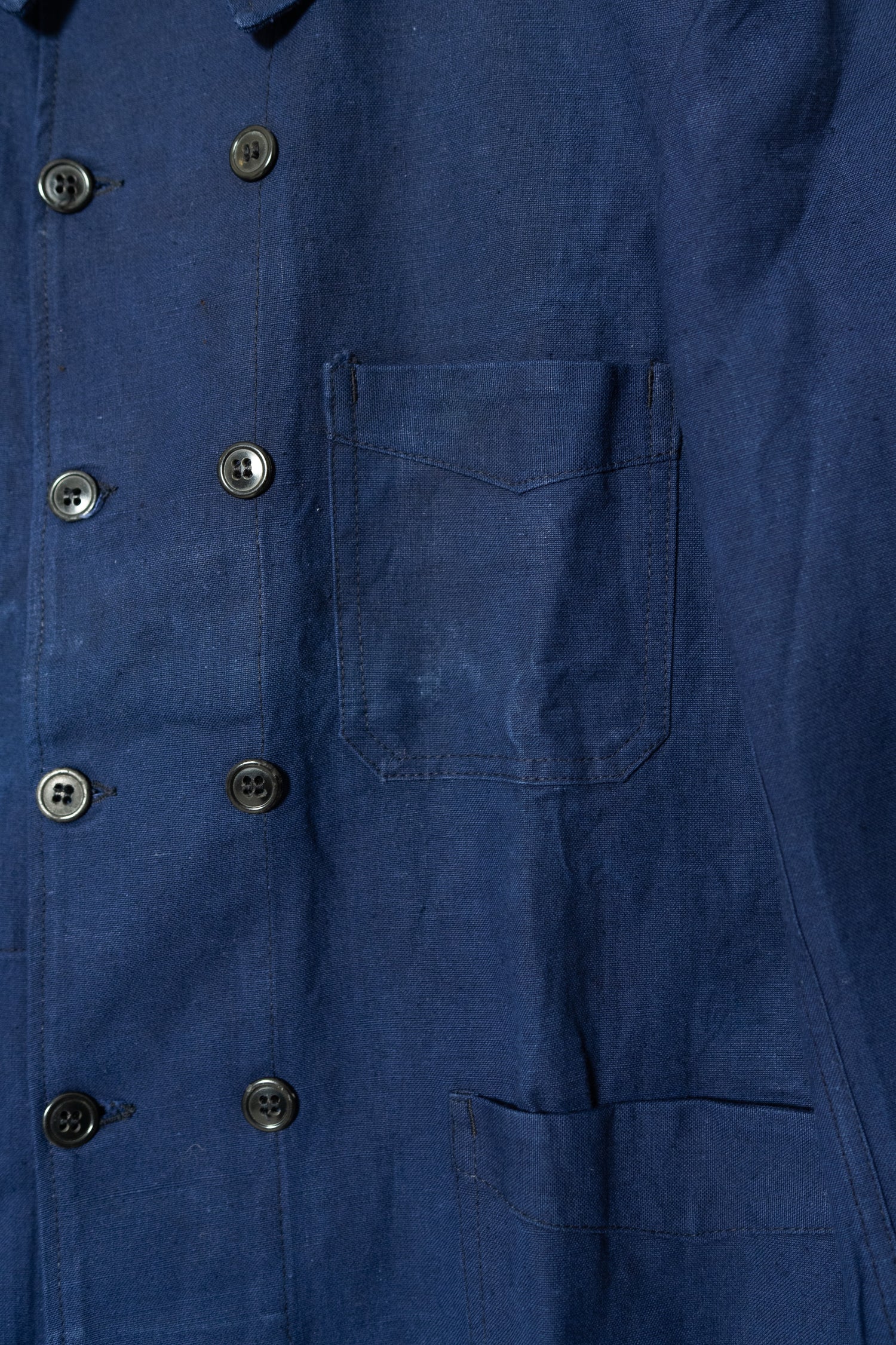 リネンの強靭さと通気性、コットンの柔らかさと馴染みの良さを兼ね備えたこの素材は、当時のワークウェアやユニフォームに多く採用されていました。特に本品のようにインディゴ染めを施したタイプは、経年変化が美しく、時とともに深みを増す独特の青が魅力です。現在の視点から見れば、この「リネンコットンのインディゴ混紡」は、サステナブル素材の先駆けとも言えるもの。耐久性と機能性、そして審美性を高い次元で両立させた、当時のフランスの職人技の結晶です。