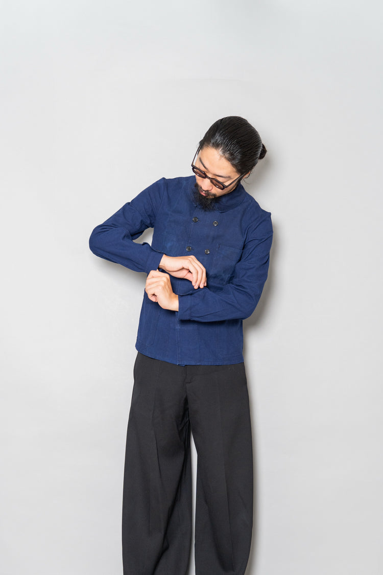 一般的なフレンチワークジャケットはシングル仕様が主流でしたが、このモデルは軍用や港湾労働者、鉄道職員など、特定の職域向けに支給されたスペシャルピースとされています。前合わせを二重にすることで風の侵入を防ぎ、保温性と耐久性を高めるという、機能面から生まれた意匠。それでいて、細部にはフランスらしいエレガンスが漂い、ワークウェアでありながらどこか品の良さを感じさせる佇まいが魅力です。
