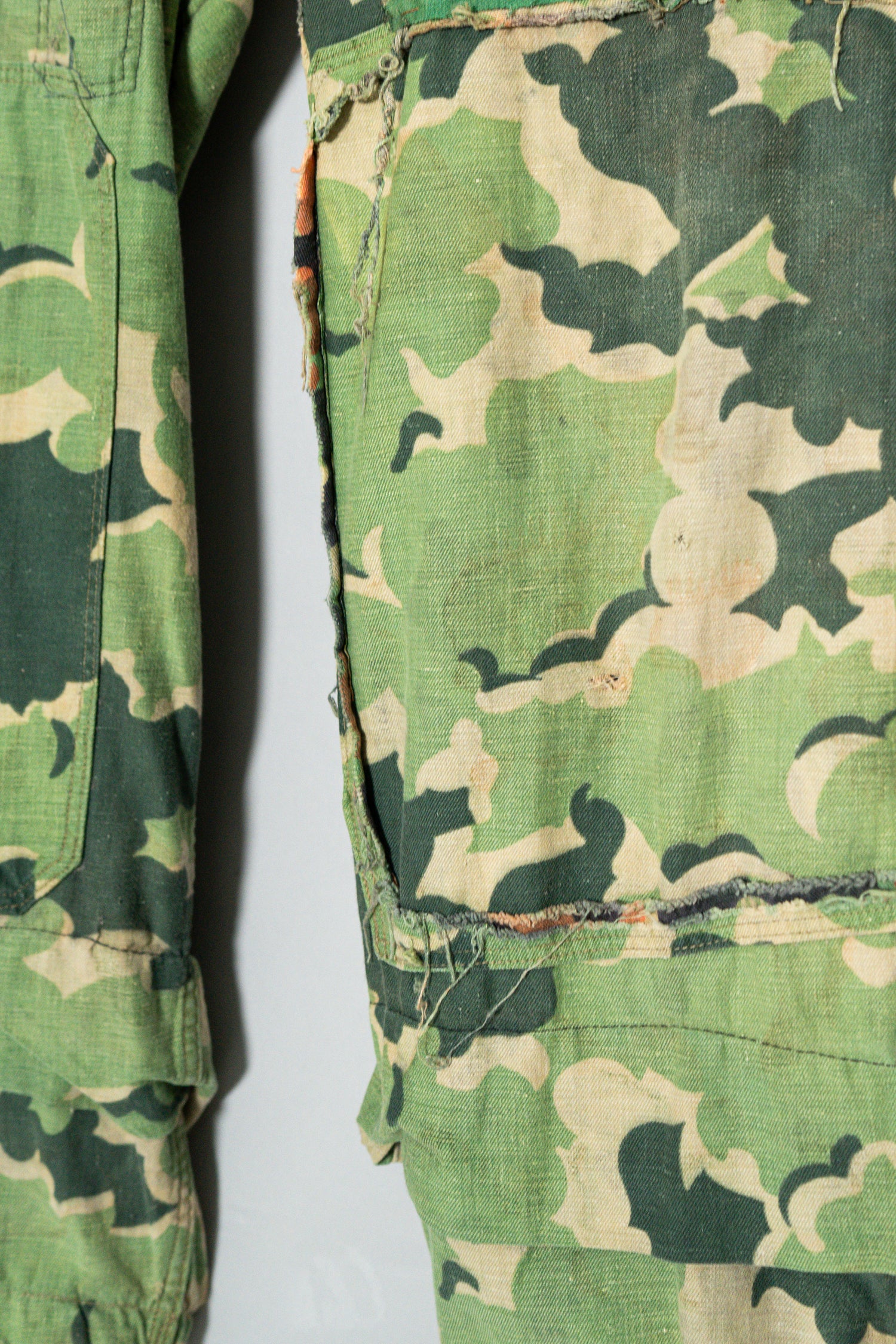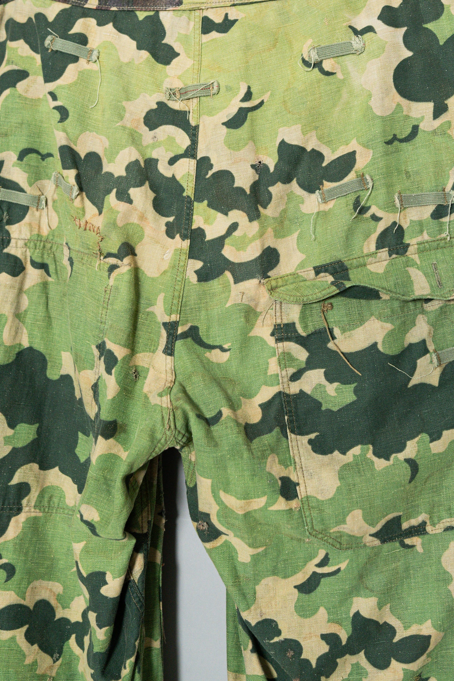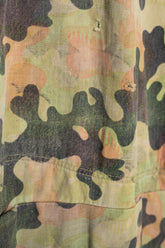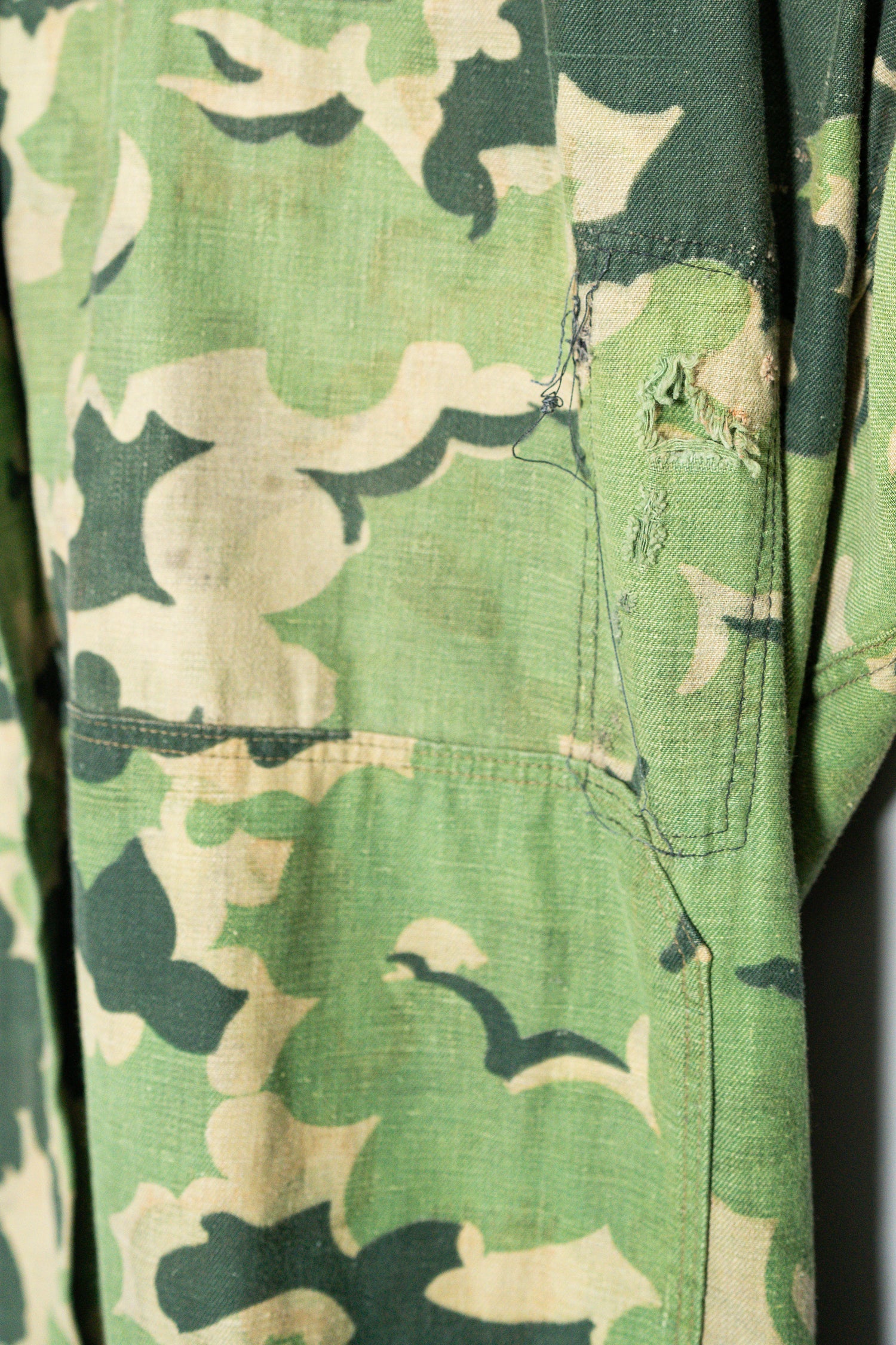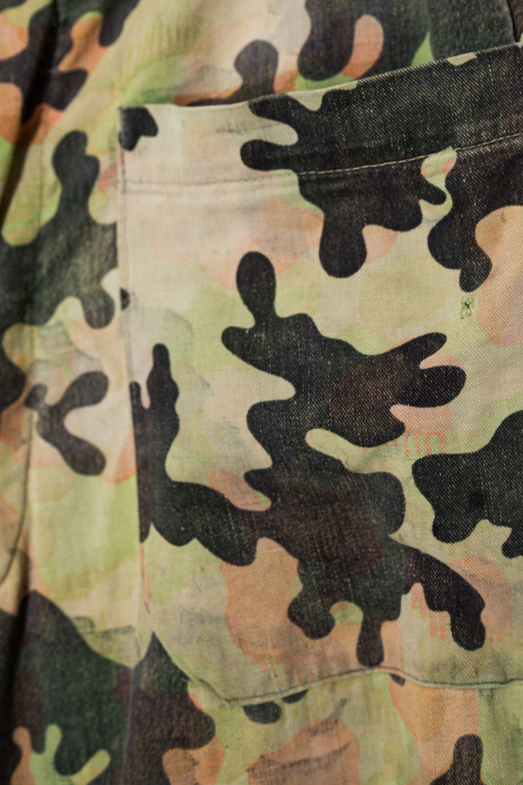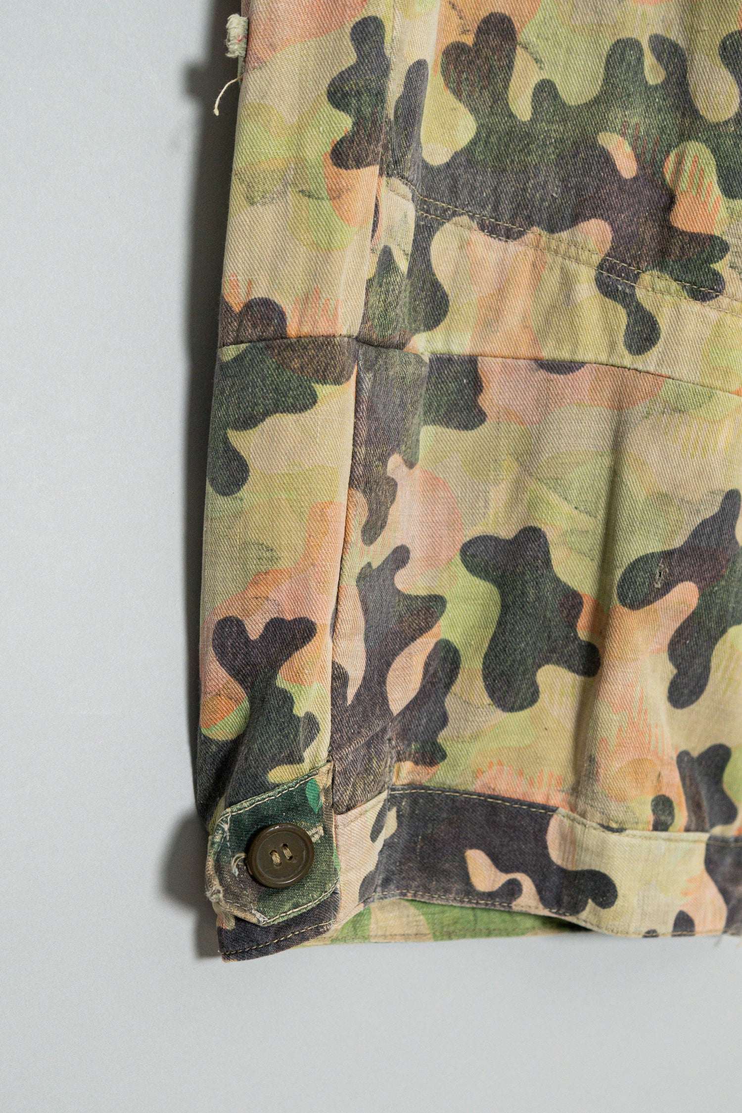 日光によるフェード、洗濯による僅かな縮み、生地の柔らかい落ち感。新品では見ることのできない“時間のレイヤー”が迷彩の抽象性と重なり、まるで絵画のエイジングのように深みを増しています。カモ柄の輪郭が淡く滲み、トーンが落ち着くことで、自然と現代服にも馴染む洗練された表情へと変貌しているのです。