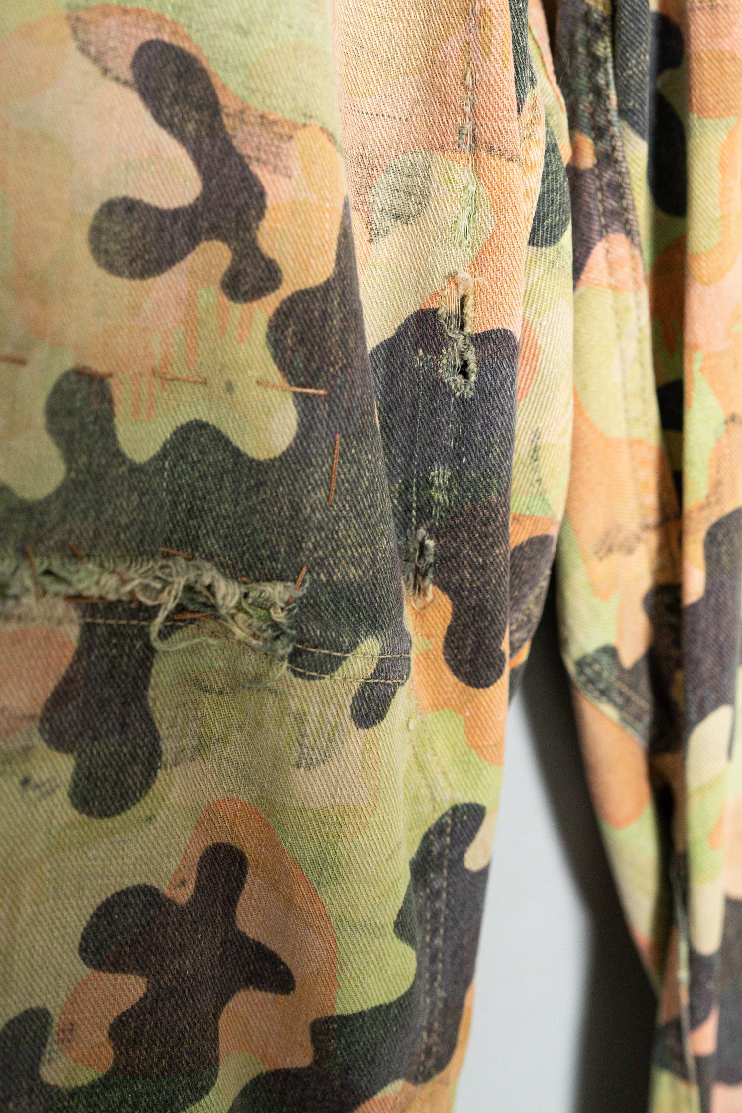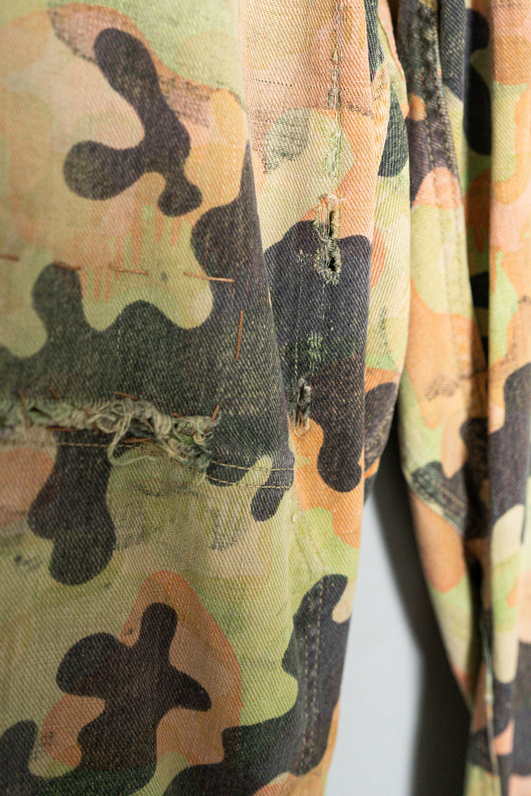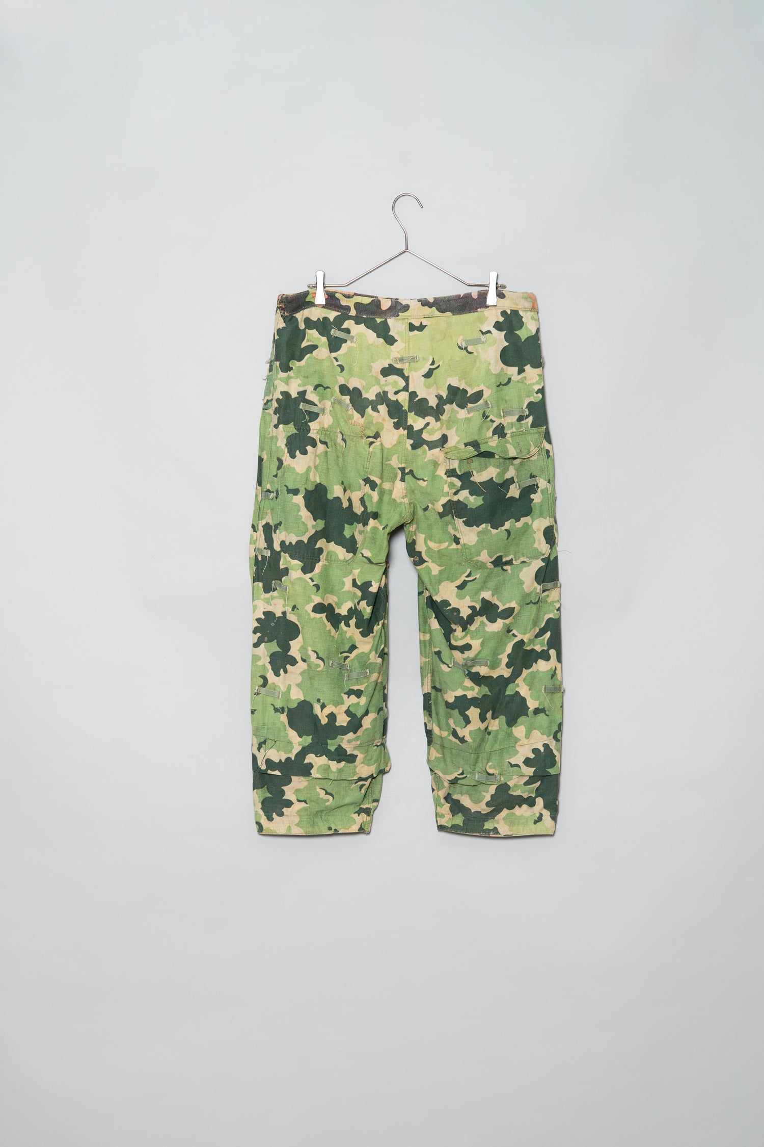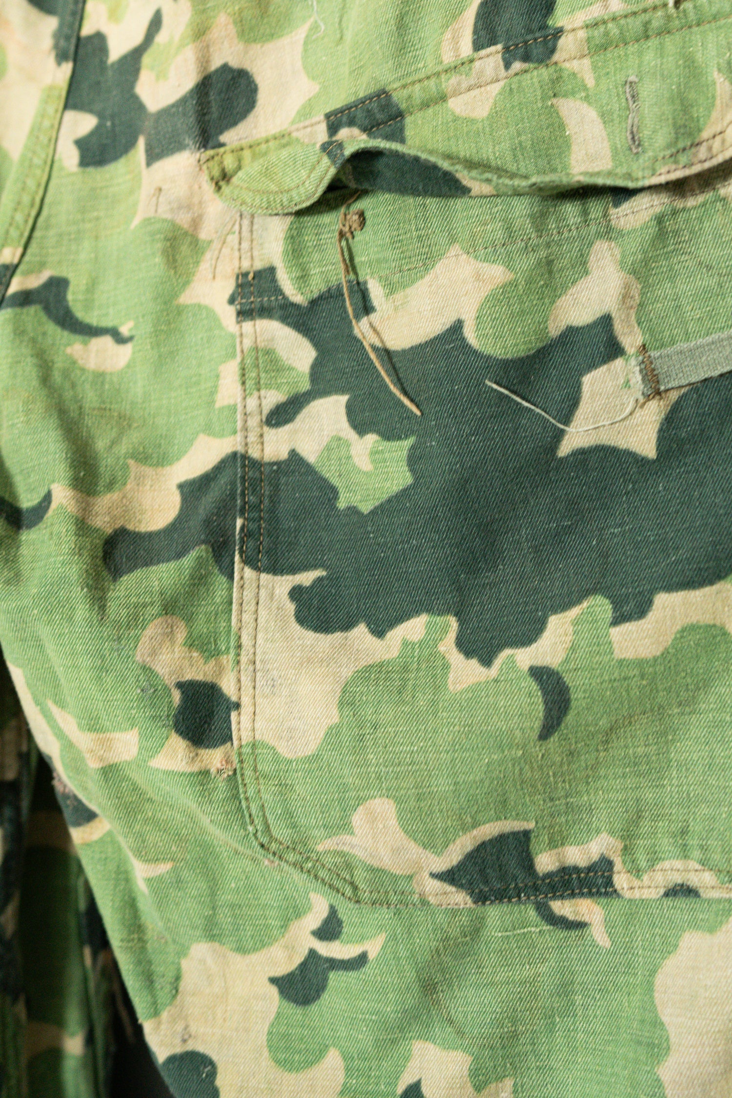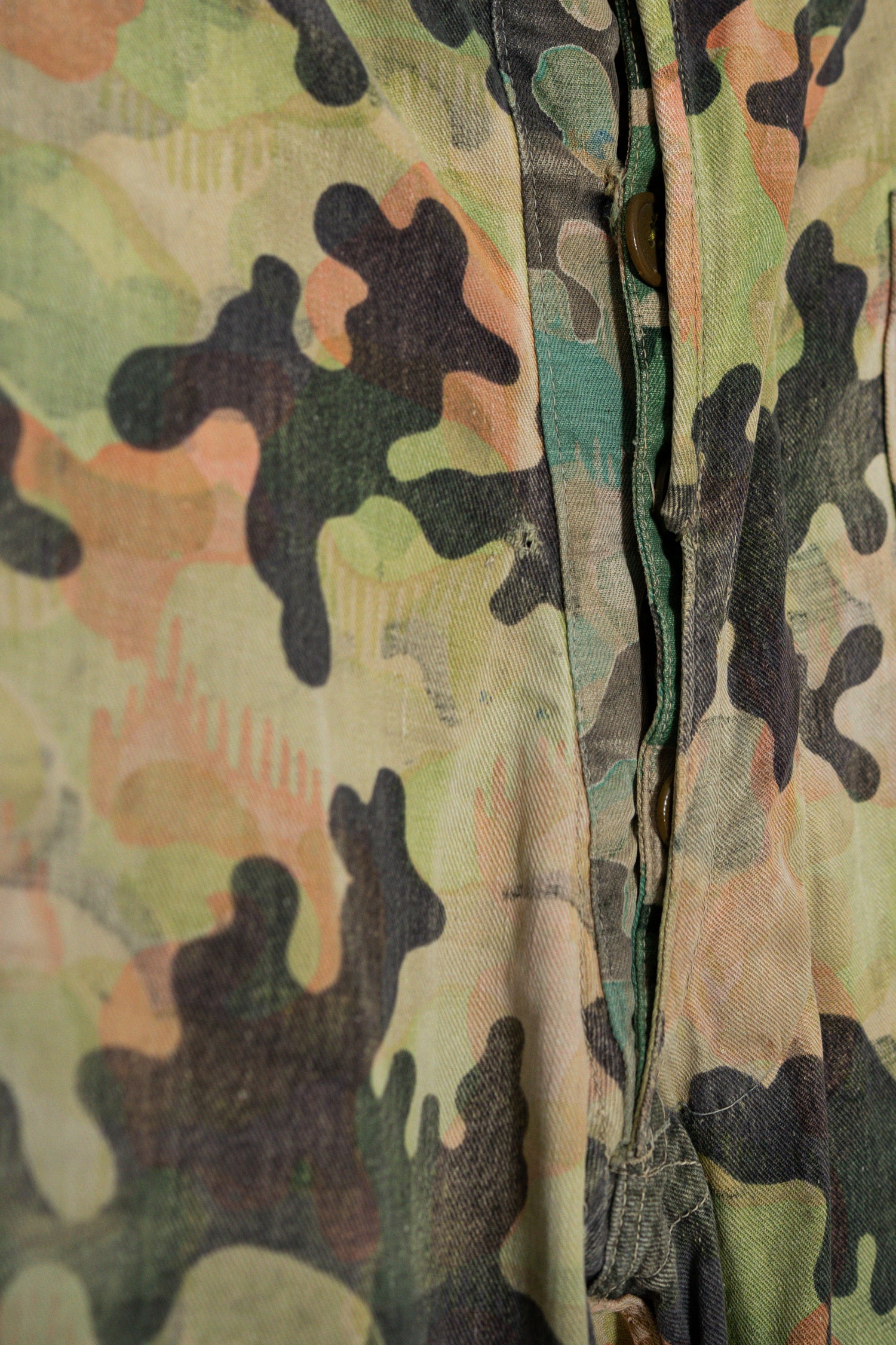 日光によるフェード、洗濯による僅かな縮み、生地の柔らかい落ち感。新品では見ることのできない“時間のレイヤー”が迷彩の抽象性と重なり、まるで絵画のエイジングのように深みを増しています。カモ柄の輪郭が淡く滲み、トーンが落ち着くことで、自然と現代服にも馴染む洗練された表情へと変貌しているのです。