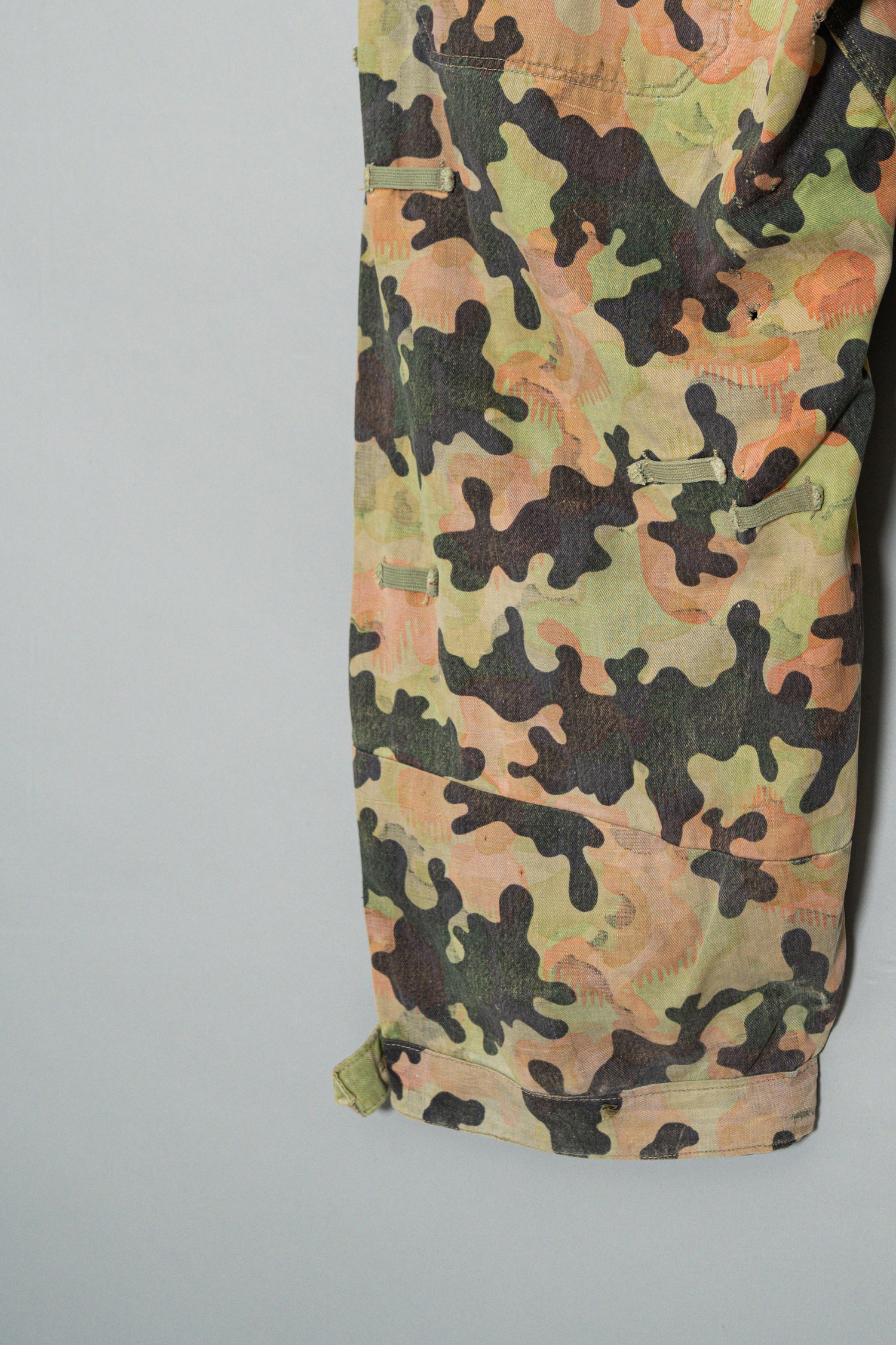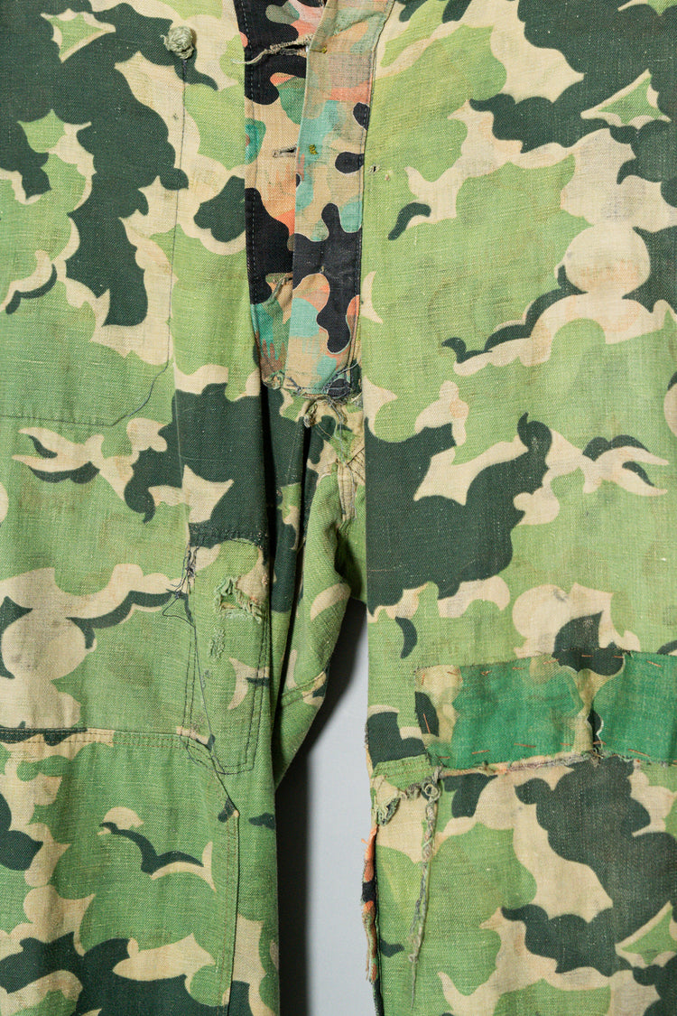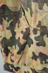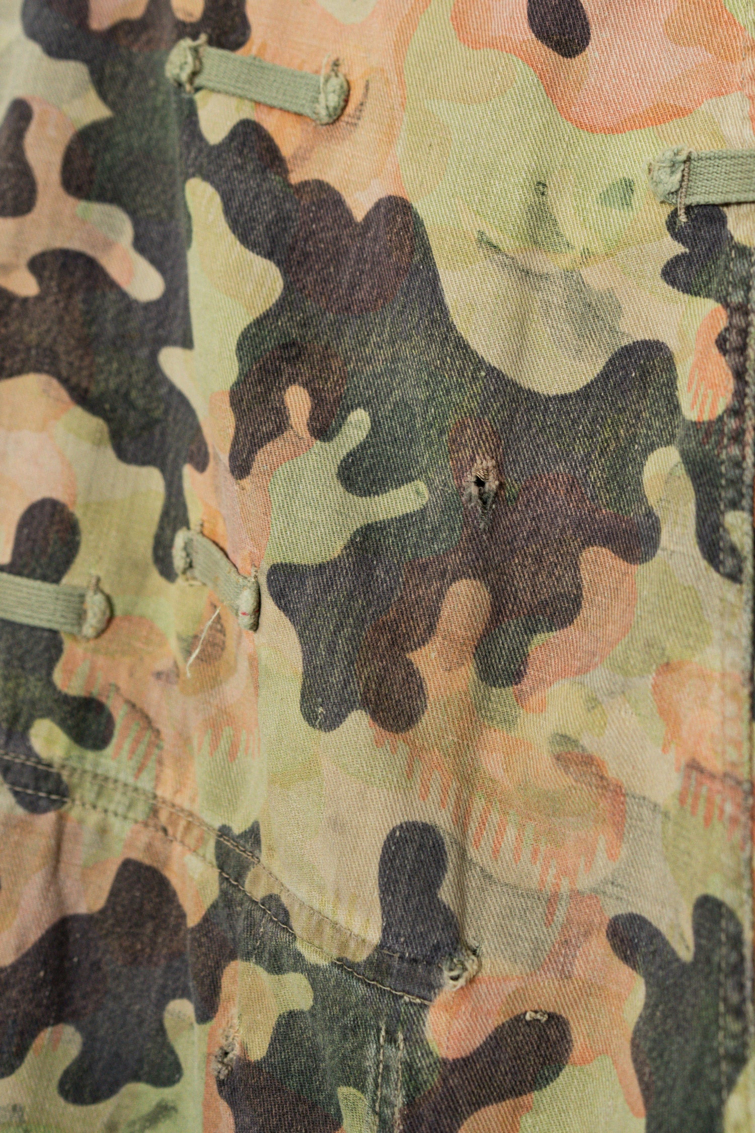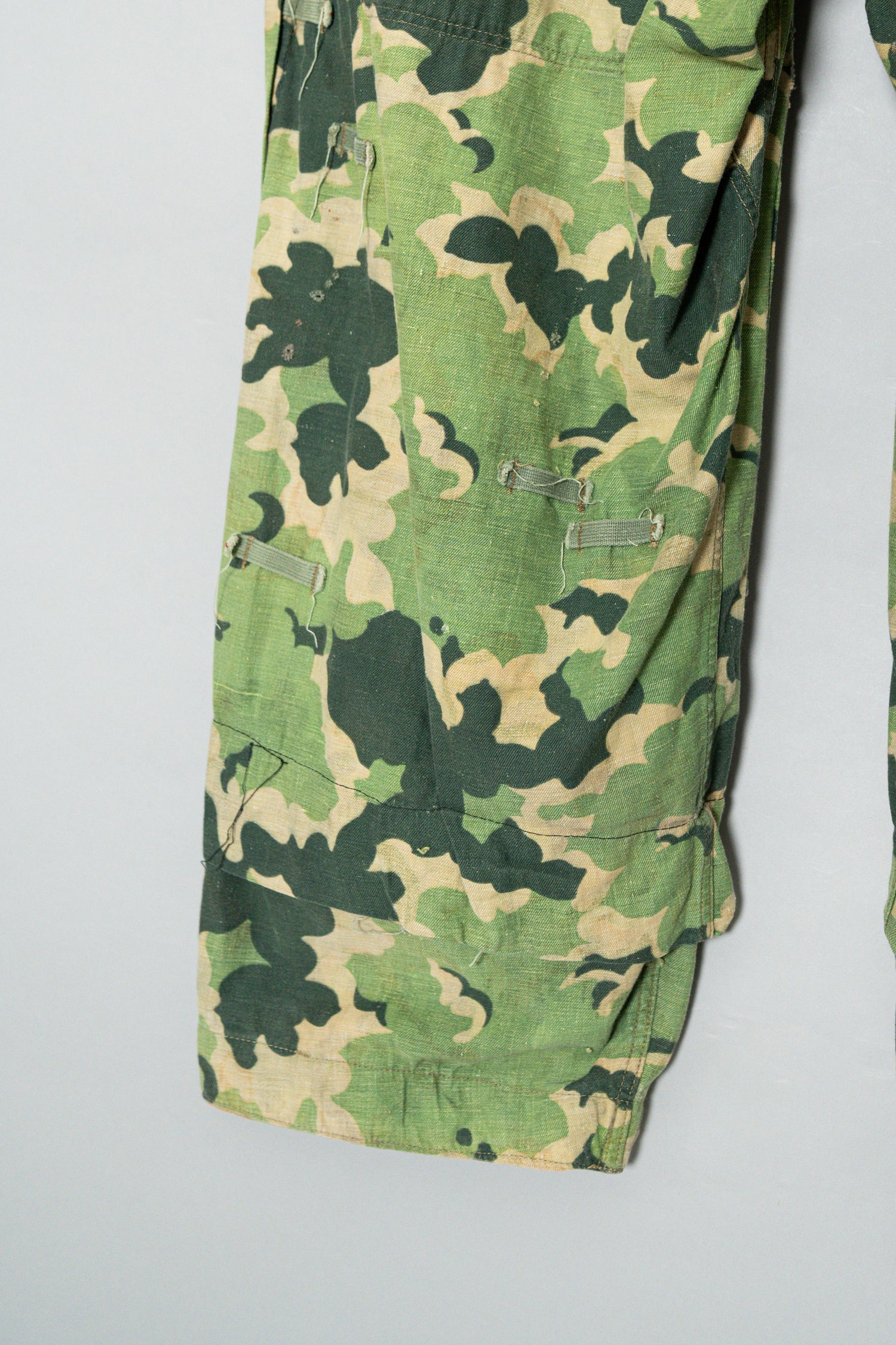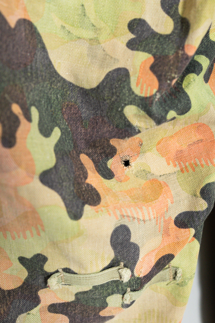 日光によるフェード、洗濯による僅かな縮み、生地の柔らかい落ち感。新品では見ることのできない“時間のレイヤー”が迷彩の抽象性と重なり、まるで絵画のエイジングのように深みを増しています。カモ柄の輪郭が淡く滲み、トーンが落ち着くことで、自然と現代服にも馴染む洗練された表情へと変貌しているのです。