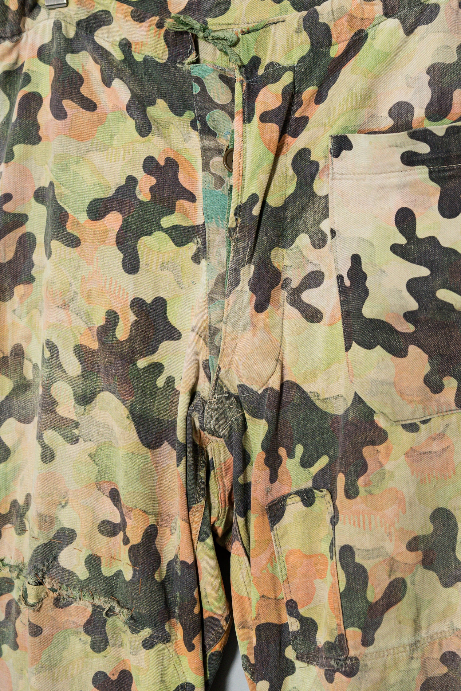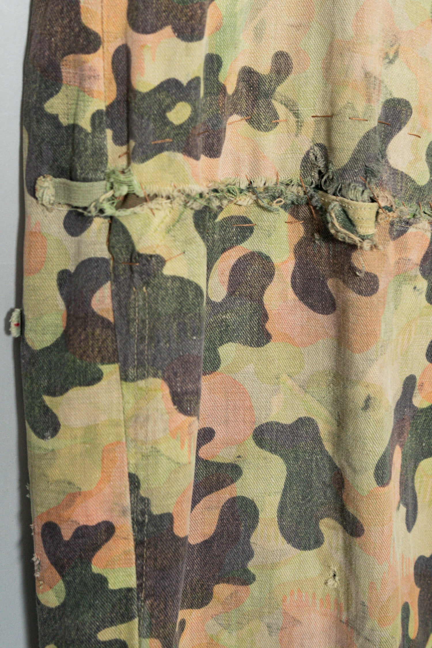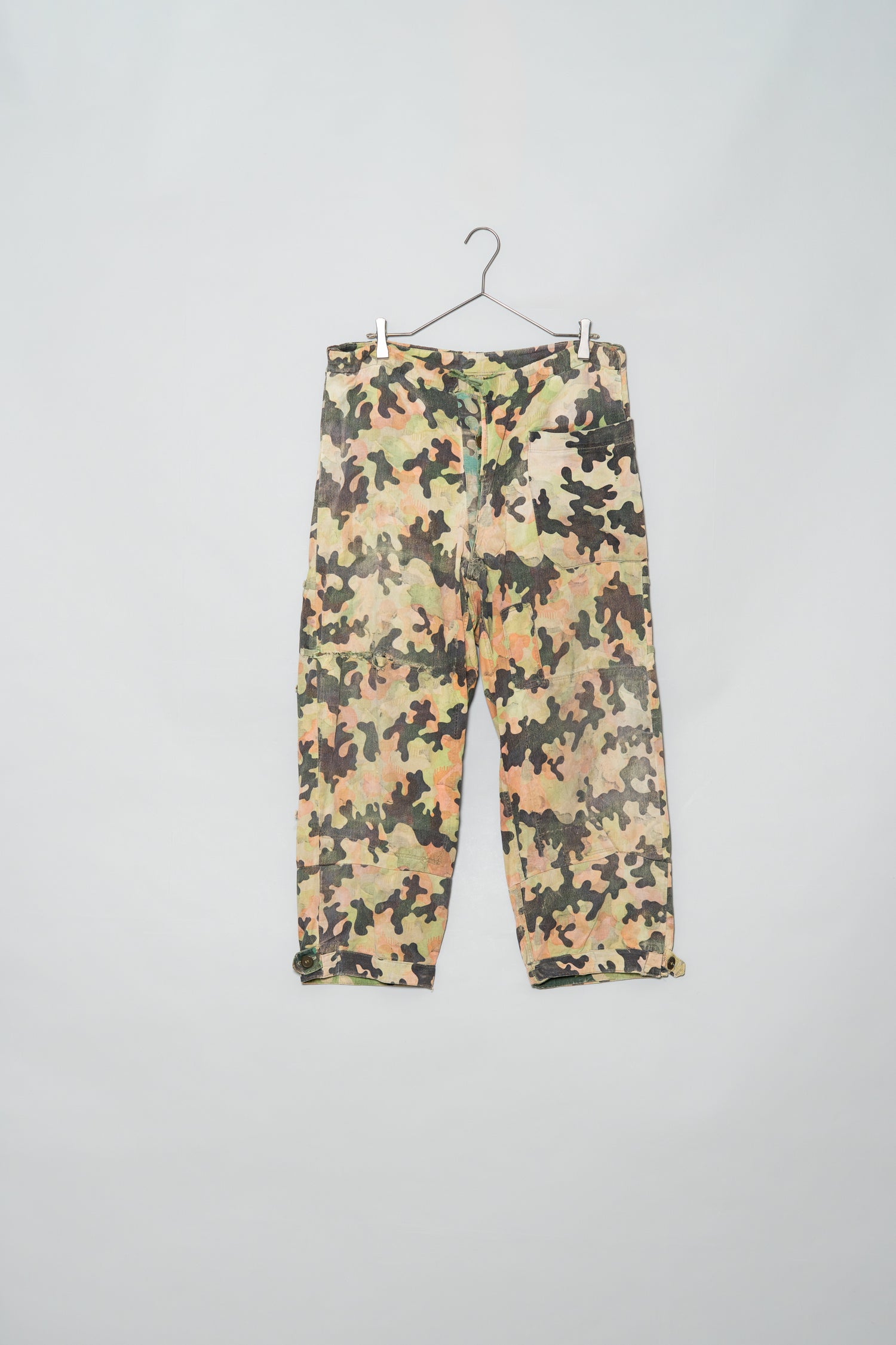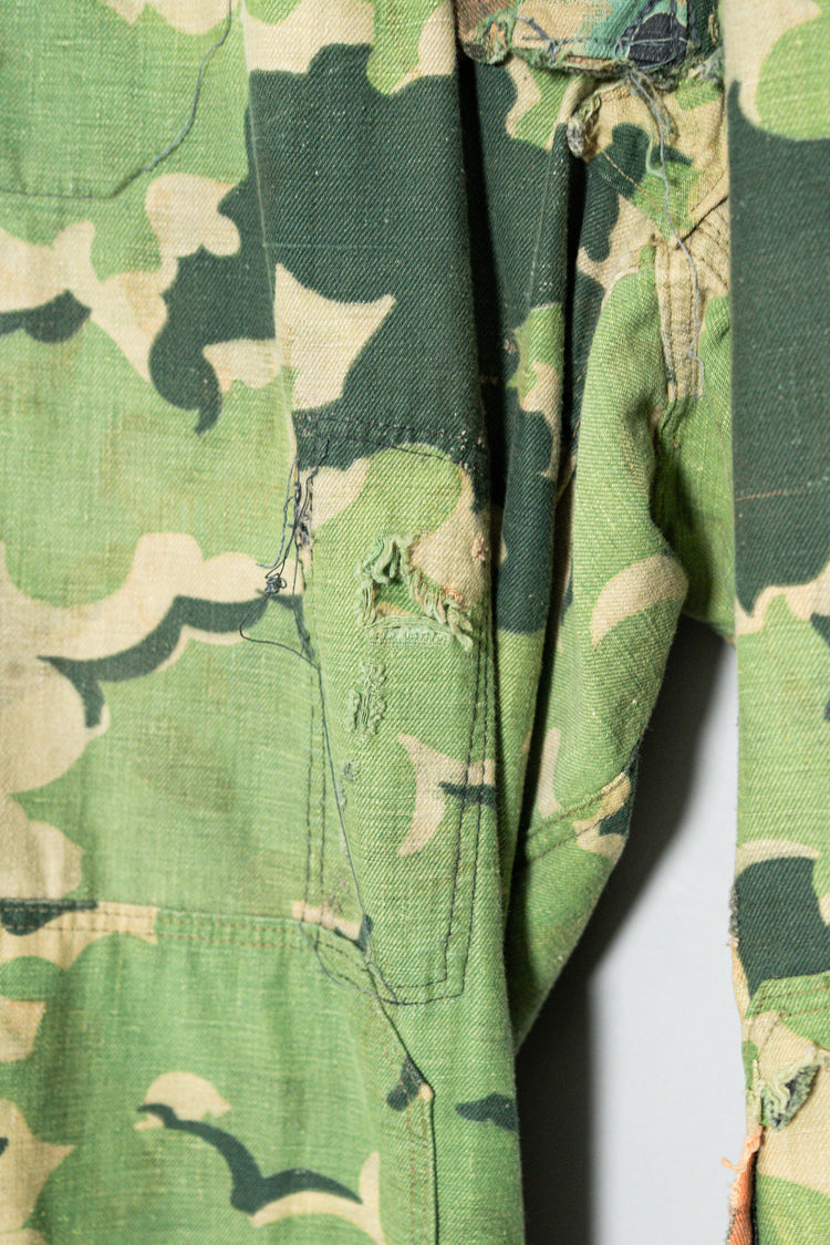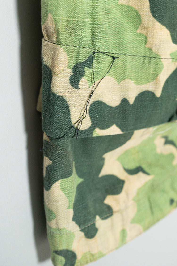 日光によるフェード、洗濯による僅かな縮み、生地の柔らかい落ち感。新品では見ることのできない“時間のレイヤー”が迷彩の抽象性と重なり、まるで絵画のエイジングのように深みを増しています。カモ柄の輪郭が淡く滲み、トーンが落ち着くことで、自然と現代服にも馴染む洗練された表情へと変貌しているのです。