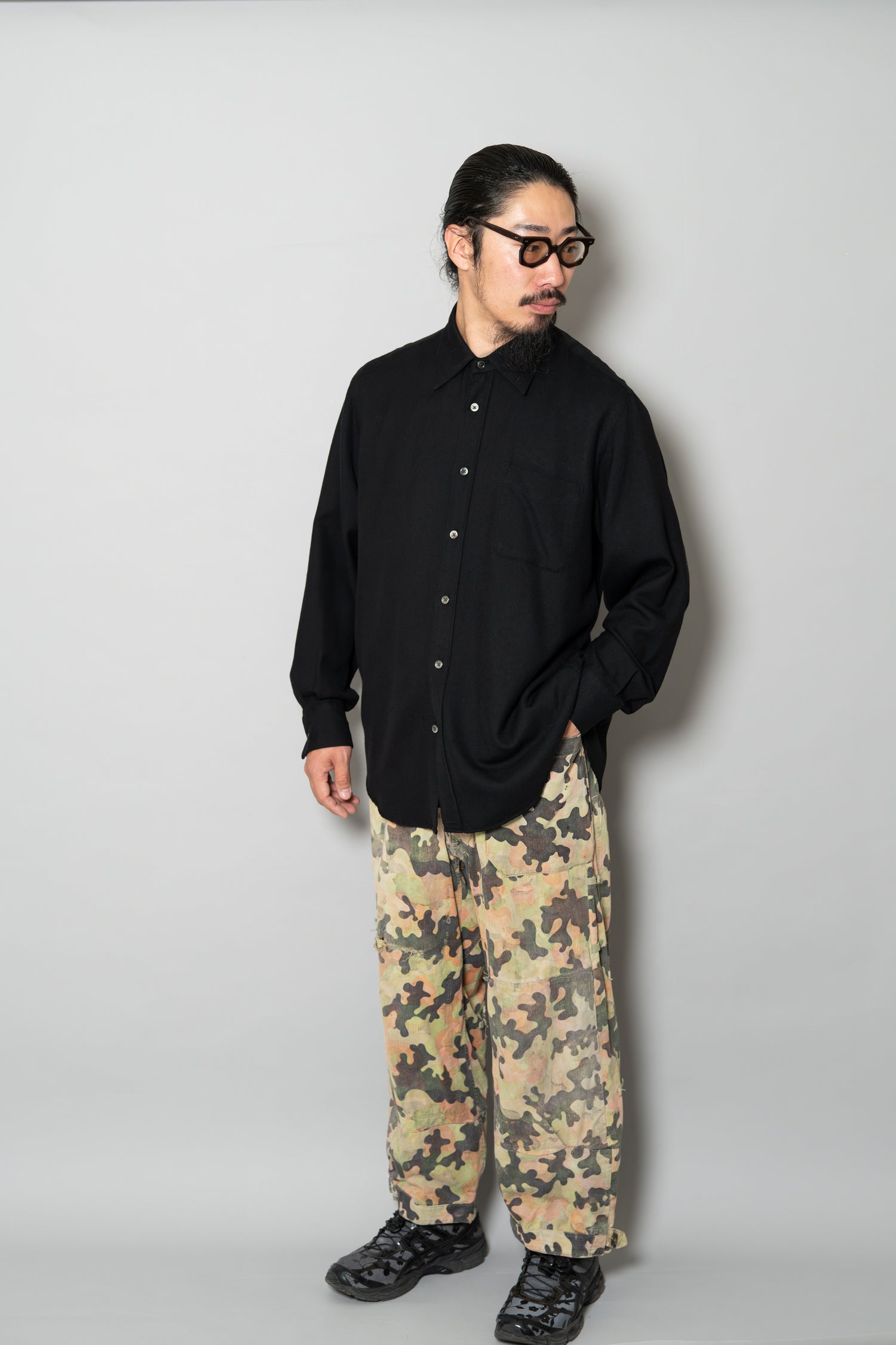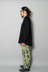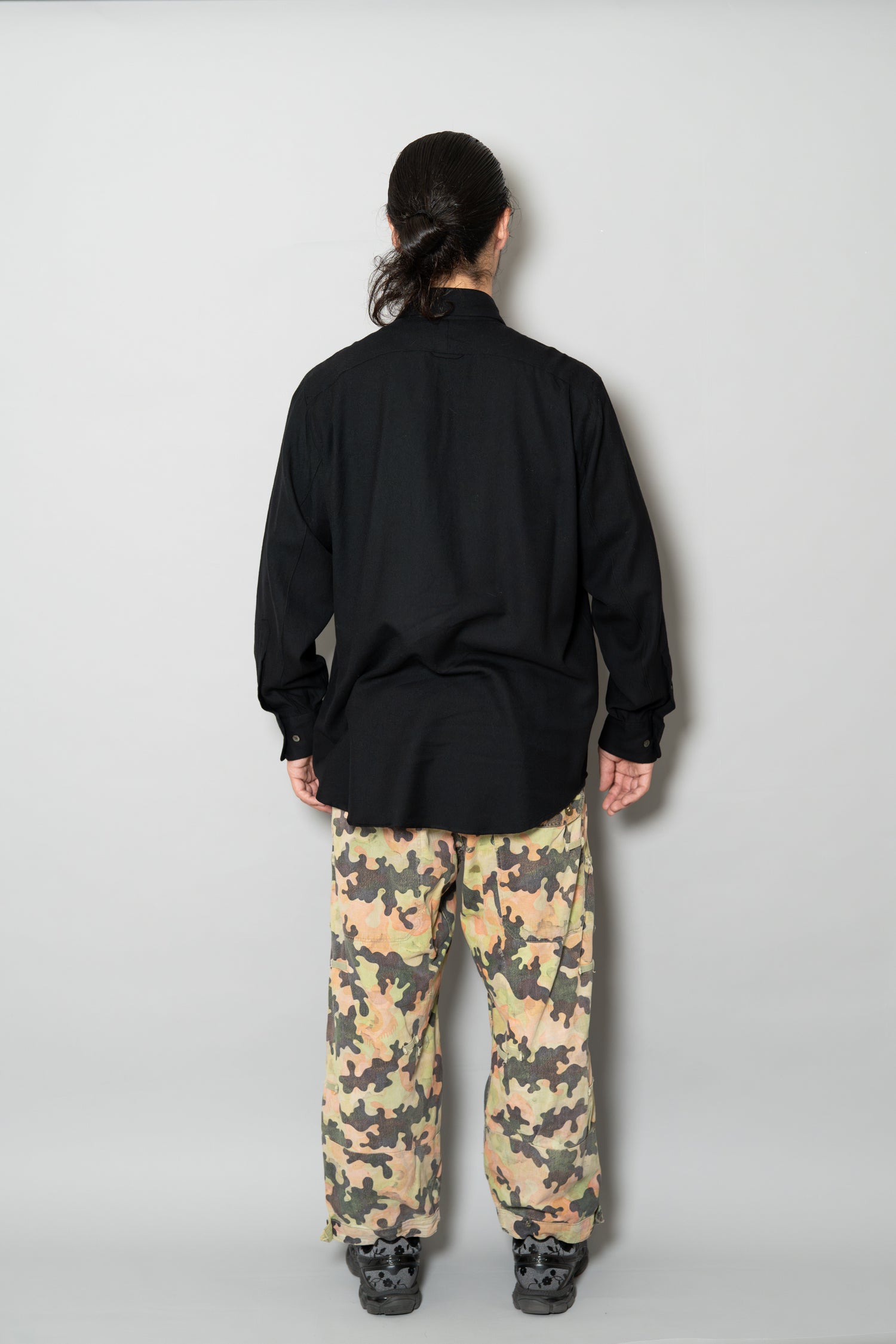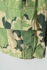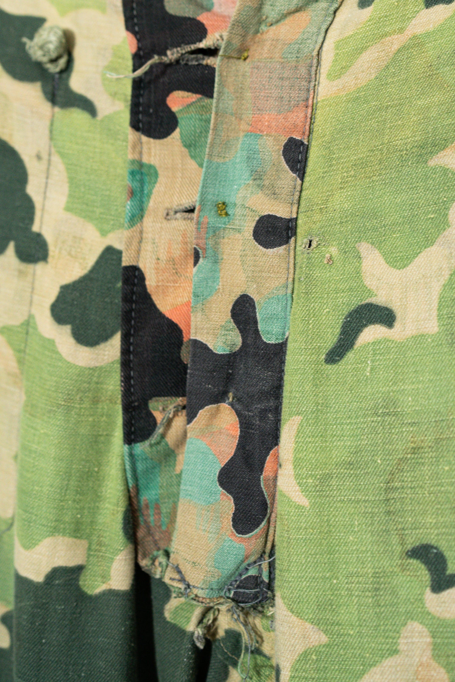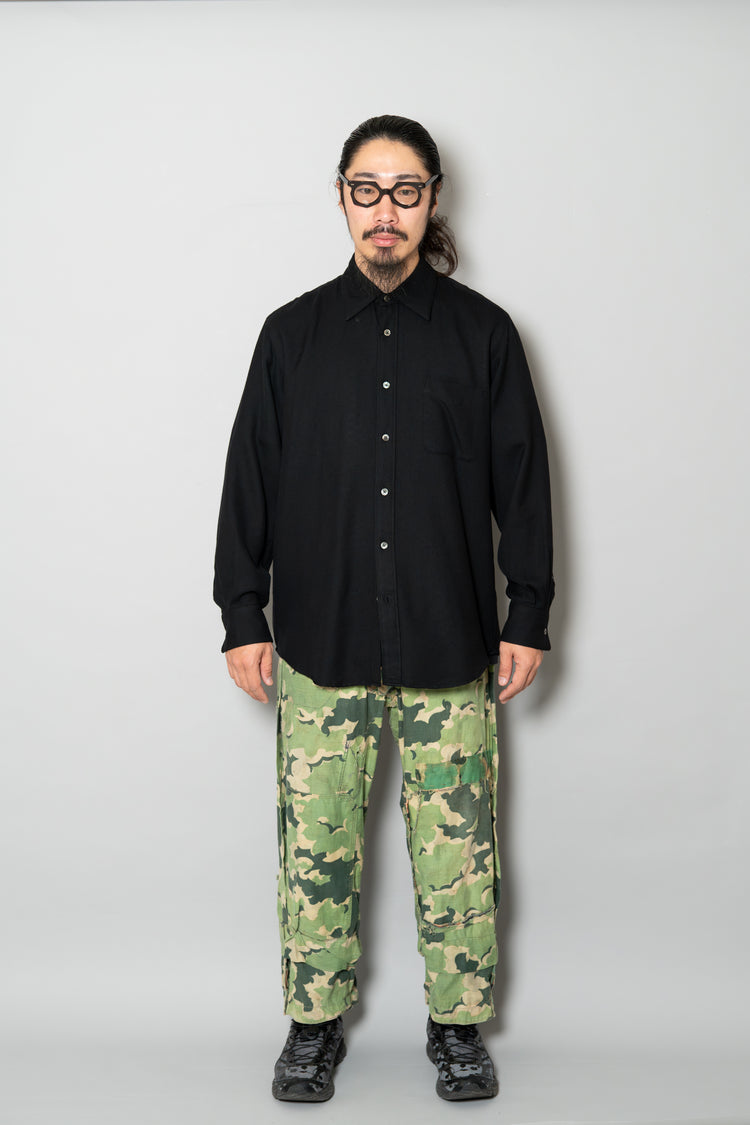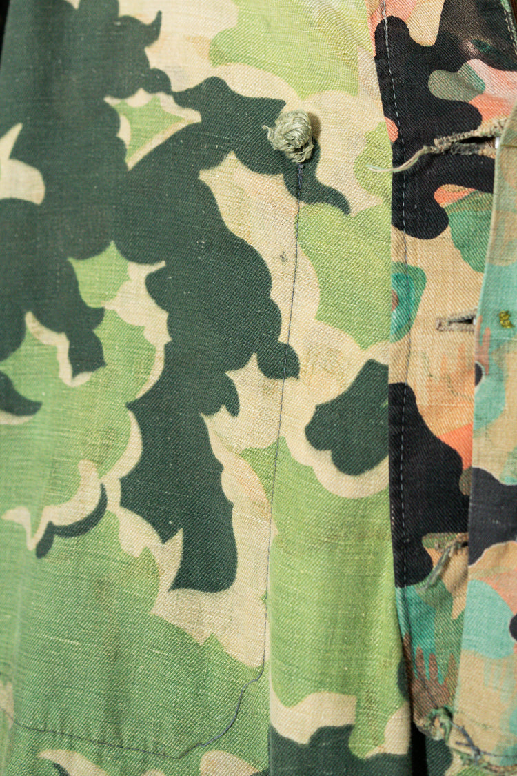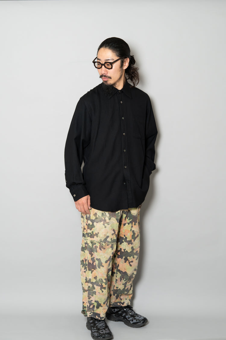 日光によるフェード、洗濯による僅かな縮み、生地の柔らかい落ち感。新品では見ることのできない“時間のレイヤー”が迷彩の抽象性と重なり、まるで絵画のエイジングのように深みを増しています。カモ柄の輪郭が淡く滲み、トーンが落ち着くことで、自然と現代服にも馴染む洗練された表情へと変貌しているのです。