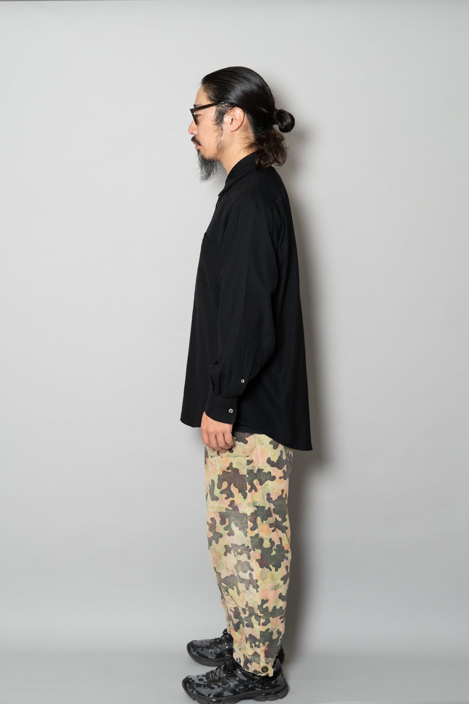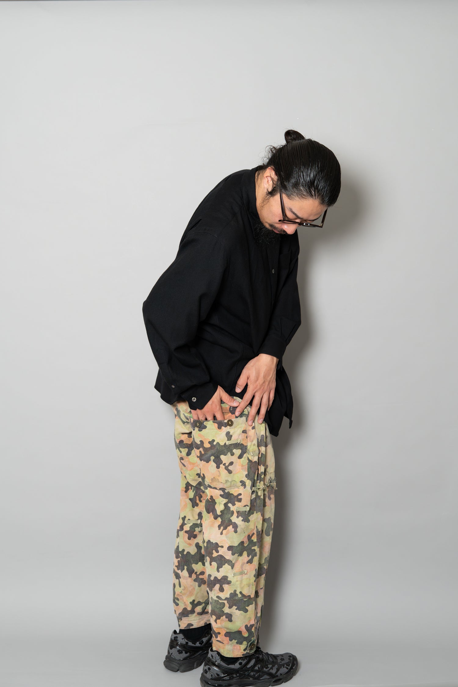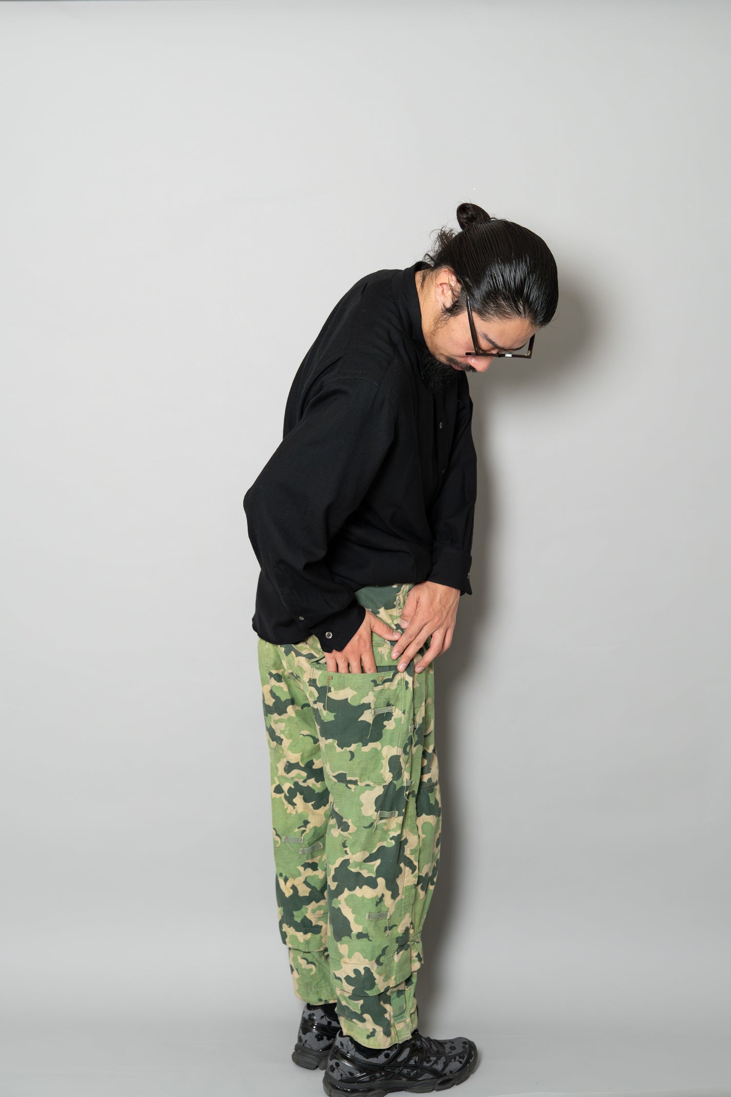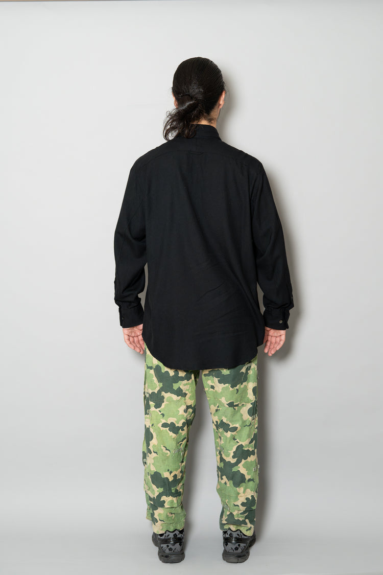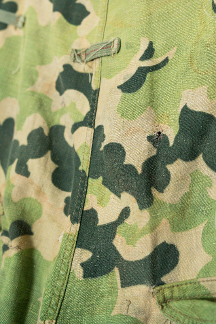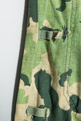 日光によるフェード、洗濯による僅かな縮み、生地の柔らかい落ち感。新品では見ることのできない“時間のレイヤー”が迷彩の抽象性と重なり、まるで絵画のエイジングのように深みを増しています。カモ柄の輪郭が淡く滲み、トーンが落ち着くことで、自然と現代服にも馴染む洗練された表情へと変貌しているのです。