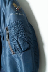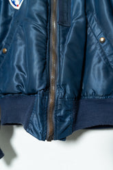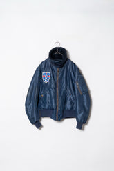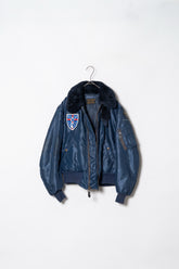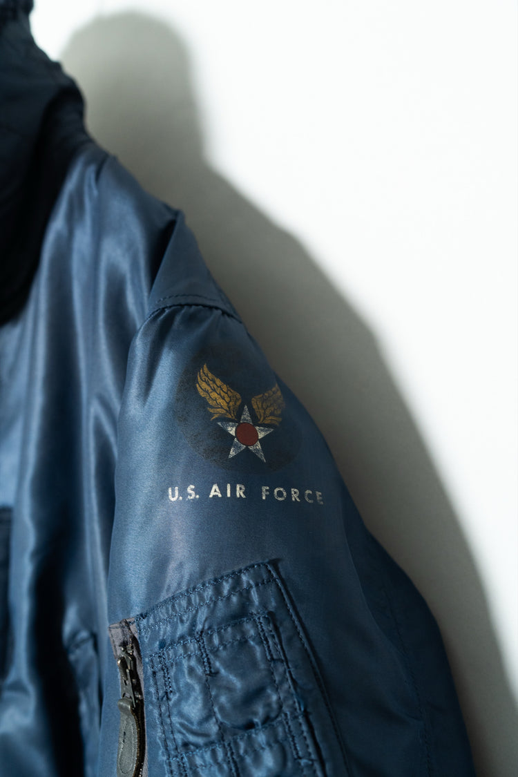 B-15C フライトジャケットは、従来のオリーブドラブではなく、空軍独自のアイデンティティを象徴する「エアフォースブルー」を採用しています。冷戦の始まりとともに、陸軍航空隊から独立したアメリカ空軍が、空を支配する時代の象徴として生み出したこのカラーは、金属的な光沢を帯びたナイロンの質感と相まって、空の色をそのまま纏ったかのような美しさを放ちます。わずか数年しか存在しなかったこのブルーは、戦場の空と兵士の誇りを映した色。その希少性はもちろん、今もなお視覚的に強烈な印象を残す特別な色です。