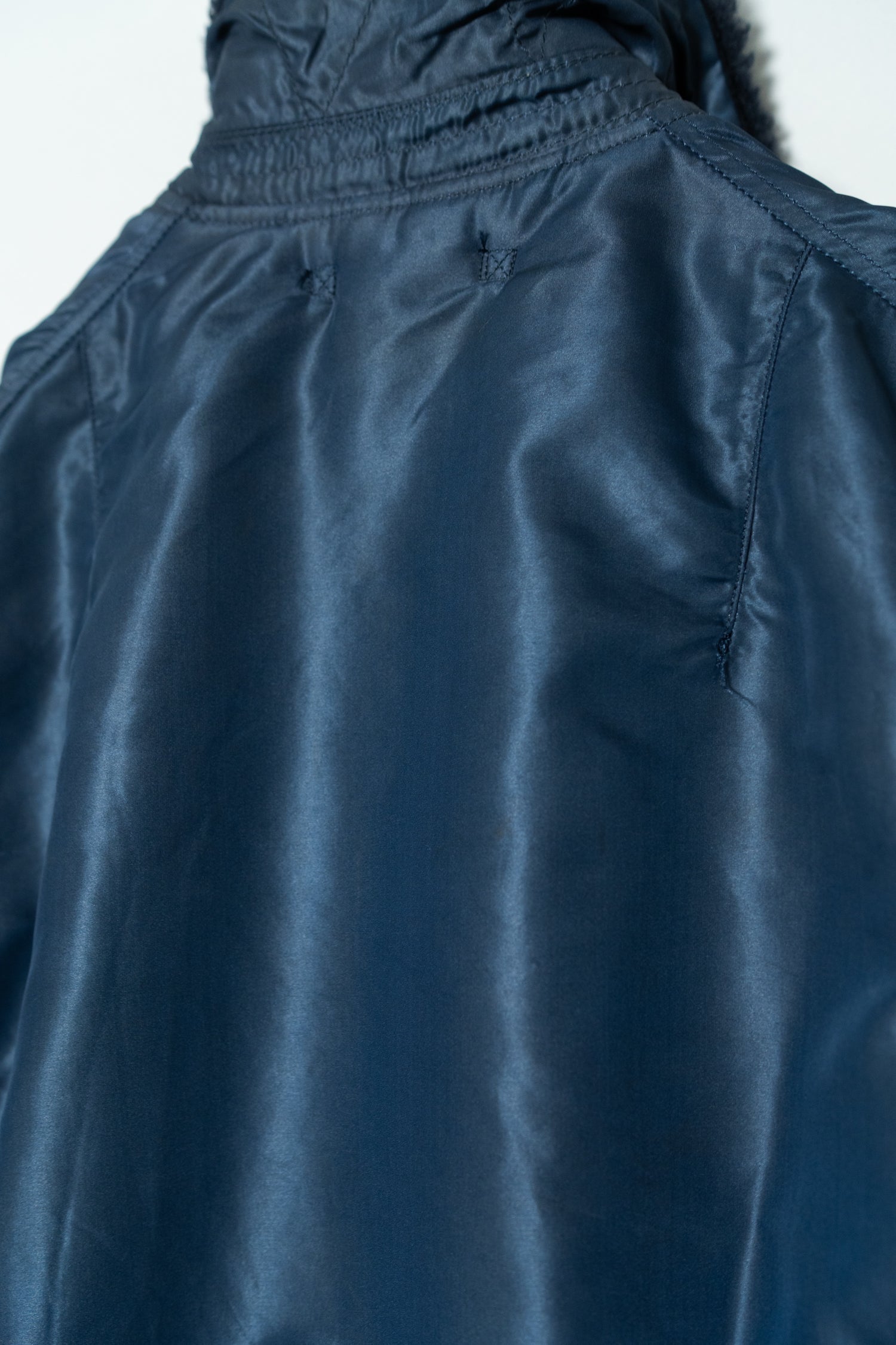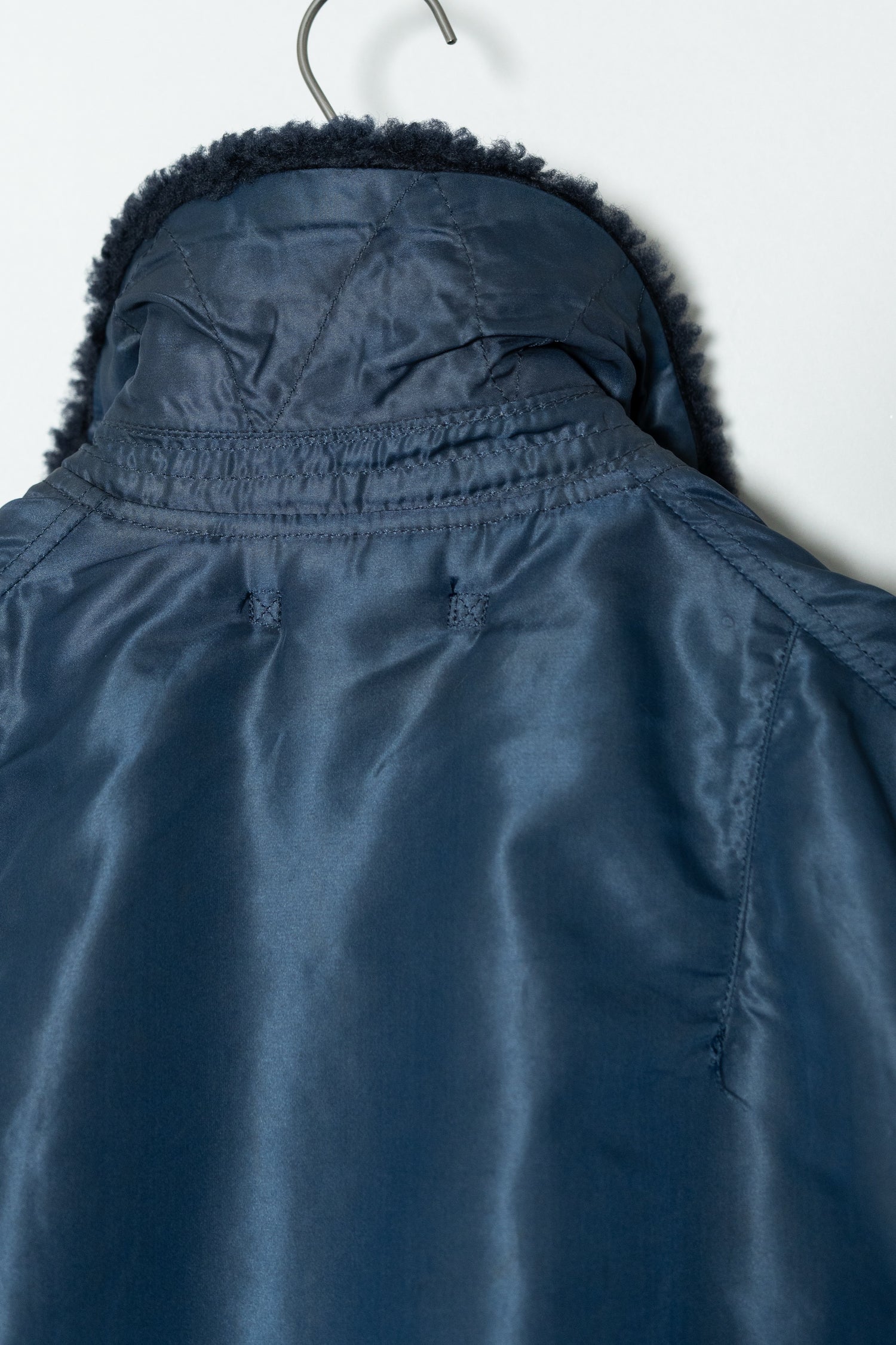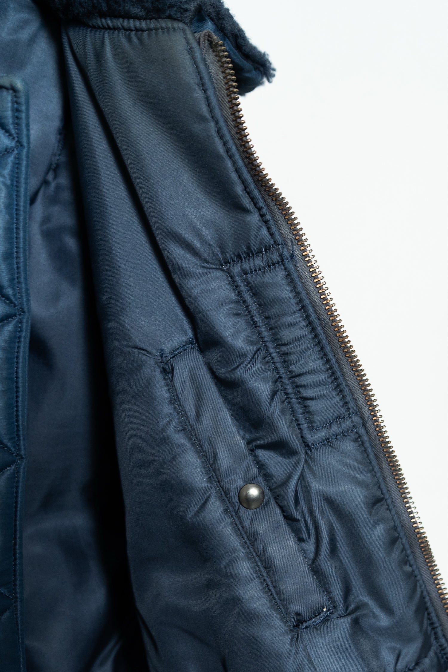 外装には高密度ナイロンシェルを使用。ムートン襟はフライト中の防寒と防風を兼ね、チンストラップを留めることで冷気を完全に遮断します。ボディの膨らみと袖のバランスは完璧で、羽織るだけで立体的なフォルムを描く。これこそ、機能性から生まれた“美”と言えるでしょう。現代のファッションブランドがどれだけこの構造を再解釈しても、当時のオリジナルが持つ重量感と存在感には到底及びません。