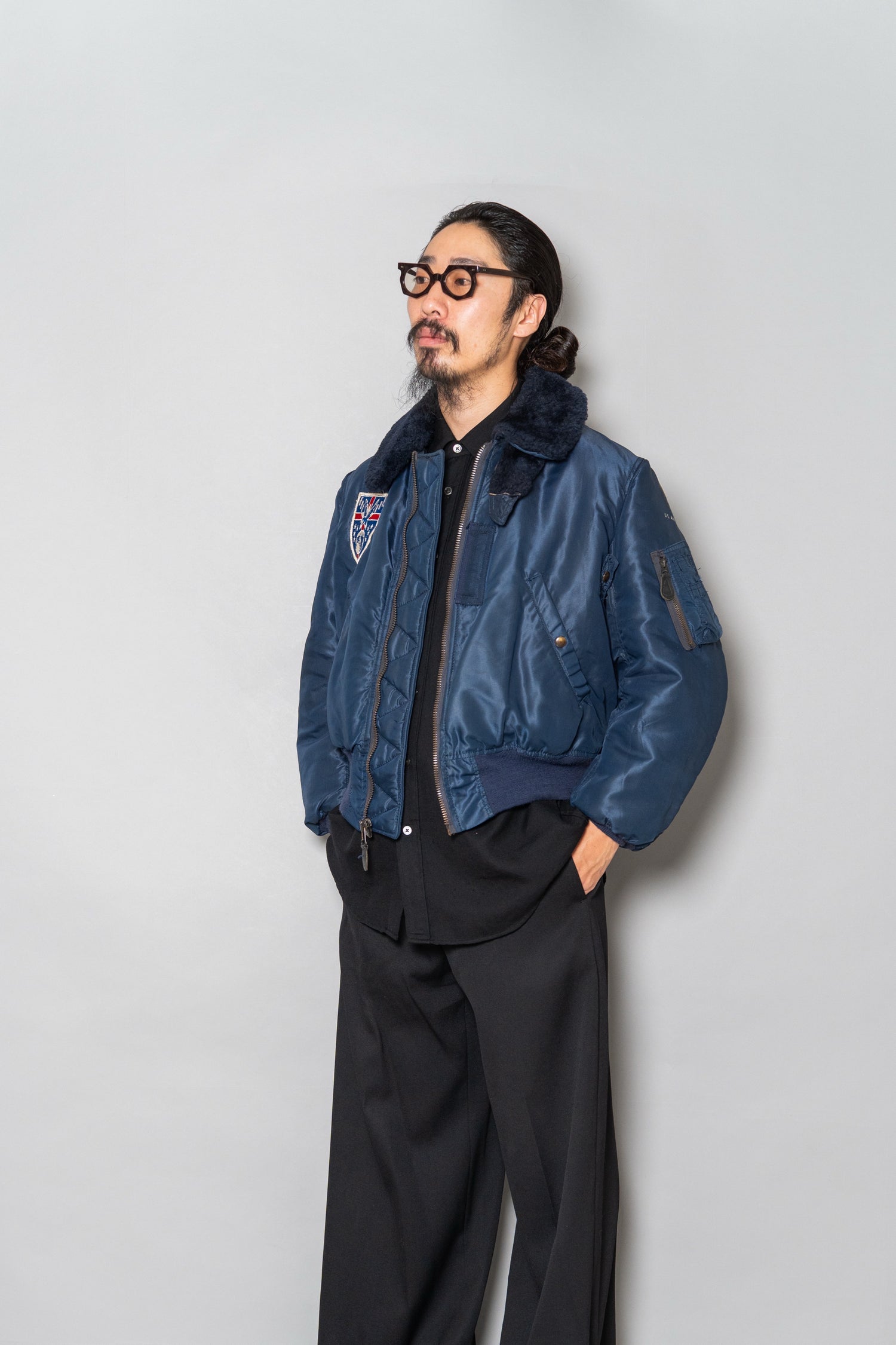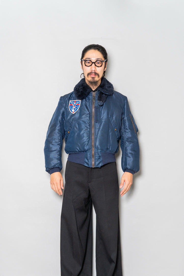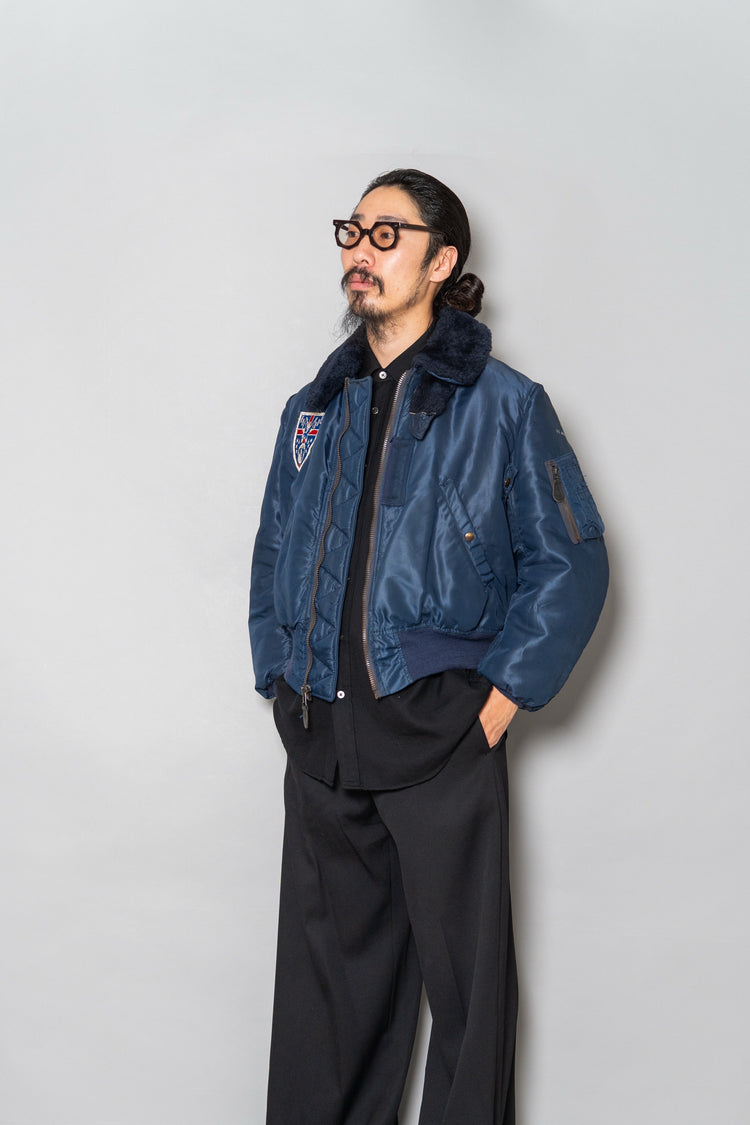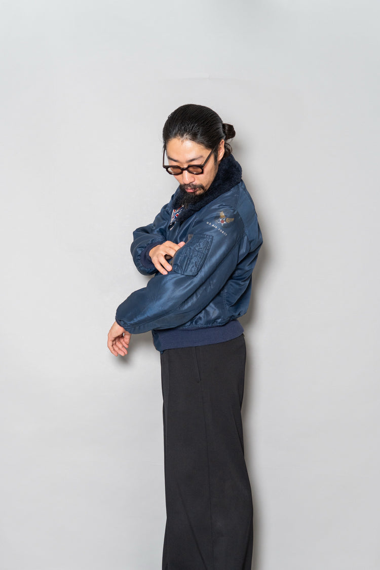 着用すると、立体的なショルダーラインが自然に体を包み込み、やや短めの着丈が抜群のバランスを作ります。ジッパーを閉じれば力強く、開ければ余裕のある佇まいへ。襟のムートンが首元を柔らかく縁取り、エアフォースブルーの深みが光を受けて表情を変える。無骨さと上品さを併せ持つこのジャケットは、ヴィンテージを超えて、まさに「完成されたデザイン」と呼ぶにふさわしい。