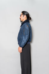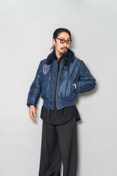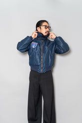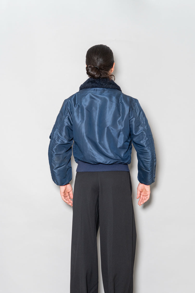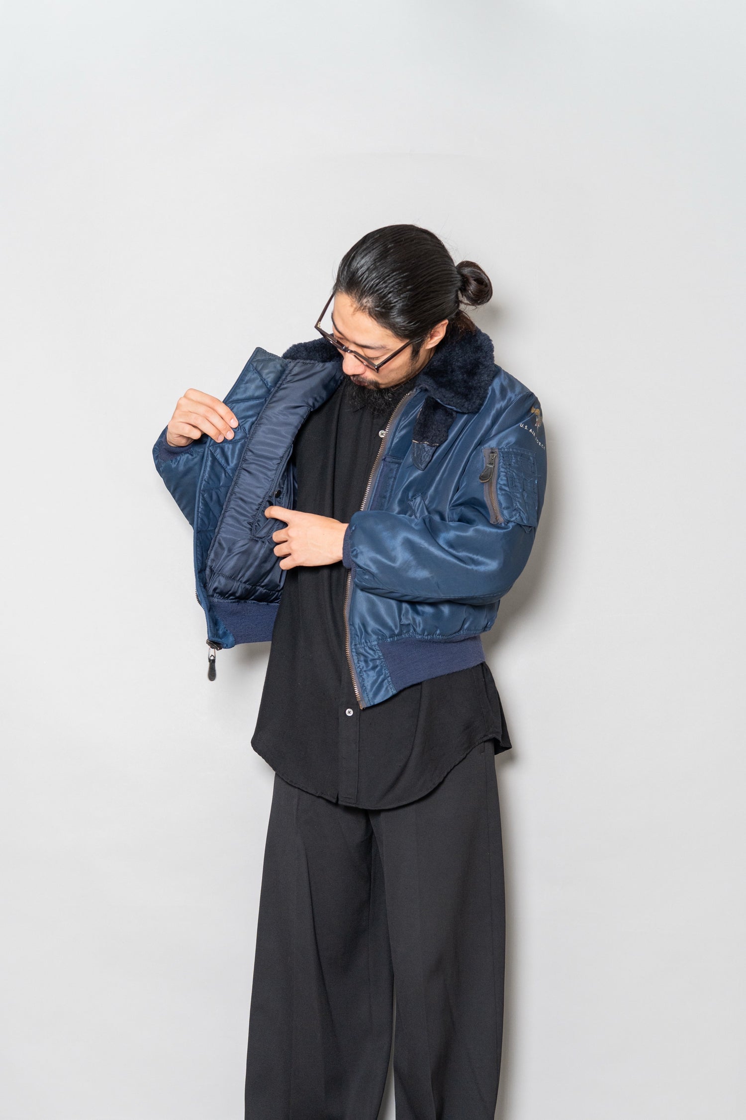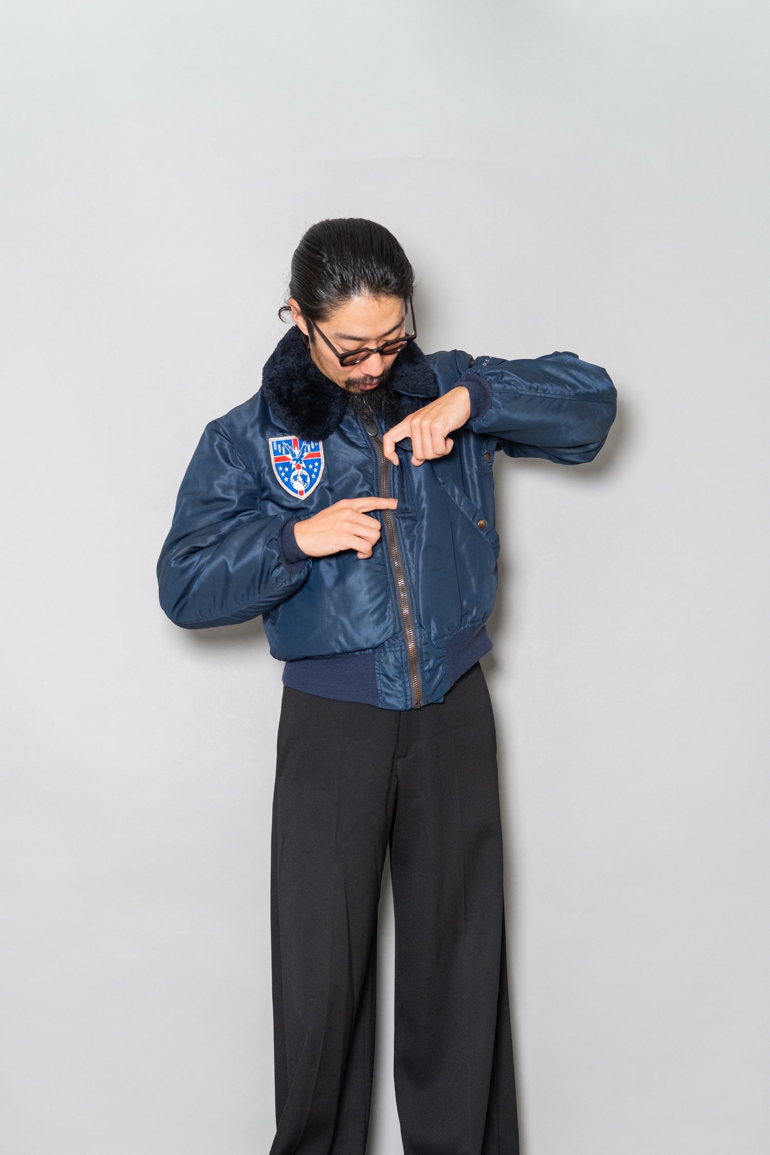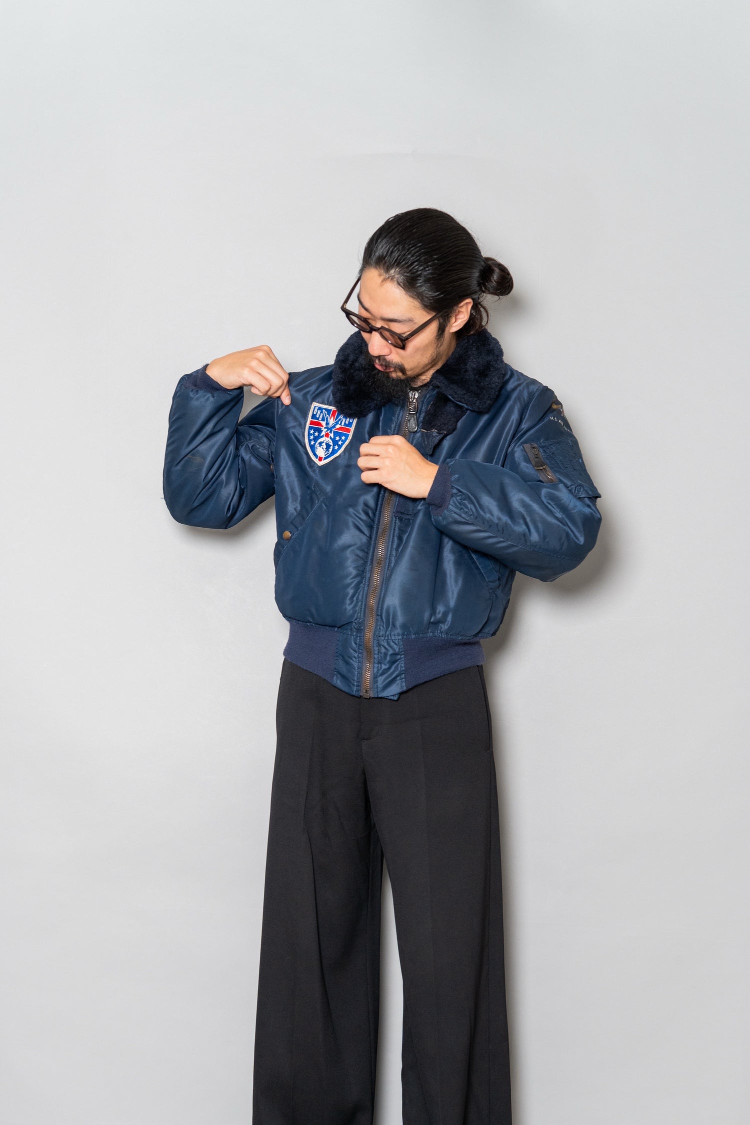 着用すると、立体的なショルダーラインが自然に体を包み込み、やや短めの着丈が抜群のバランスを作ります。ジッパーを閉じれば力強く、開ければ余裕のある佇まいへ。襟のムートンが首元を柔らかく縁取り、エアフォースブルーの深みが光を受けて表情を変える。無骨さと上品さを併せ持つこのジャケットは、ヴィンテージを超えて、まさに「完成されたデザイン」と呼ぶにふさわしい。