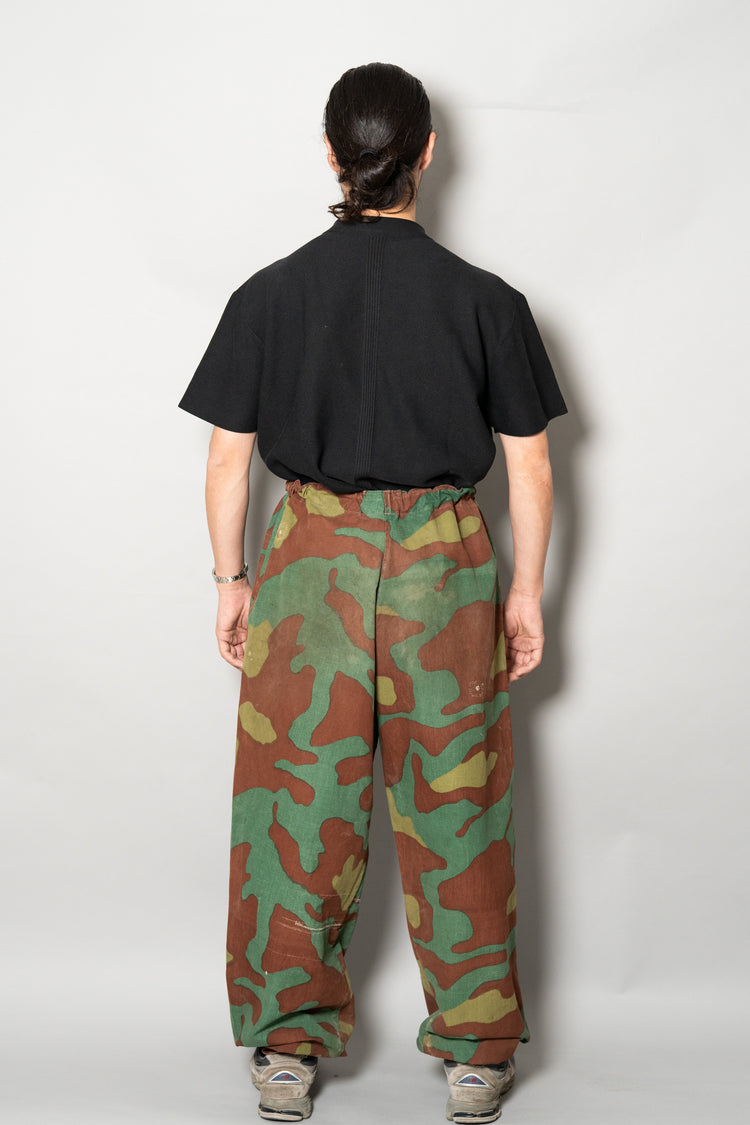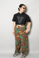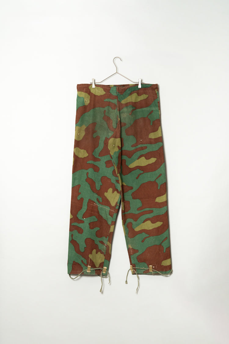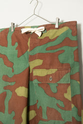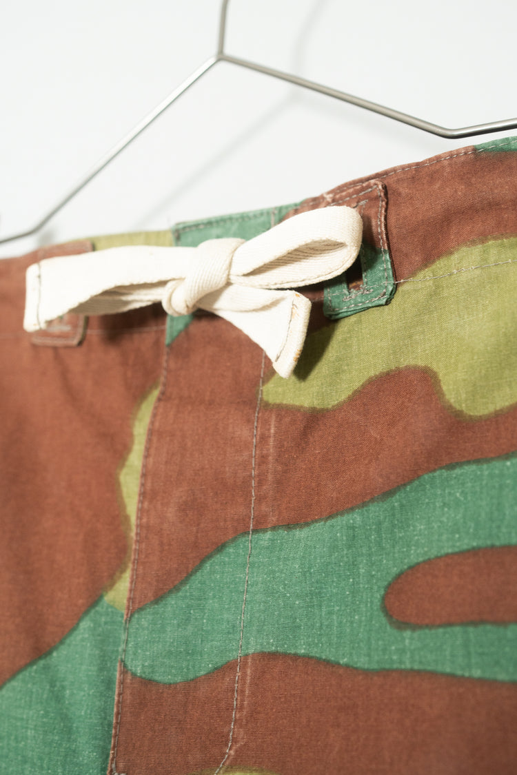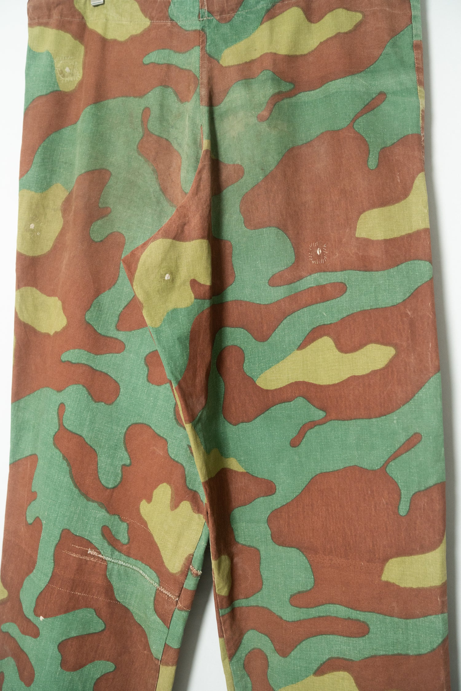 1960年代頃、イタリア軍にて使用されていたとされる“サンマルコカモ”パンツ。その中でも、本個体は明らかに通常流通している官給品とは異なる特異な存在です。おそらく当時の軍用テント生地を転用し、オリジナルで仕立てられたと推測される極めて珍しい一本。ミリタリーウェアの枠を超え、資料的・文化的価値すら感じさせる希少なピースです。