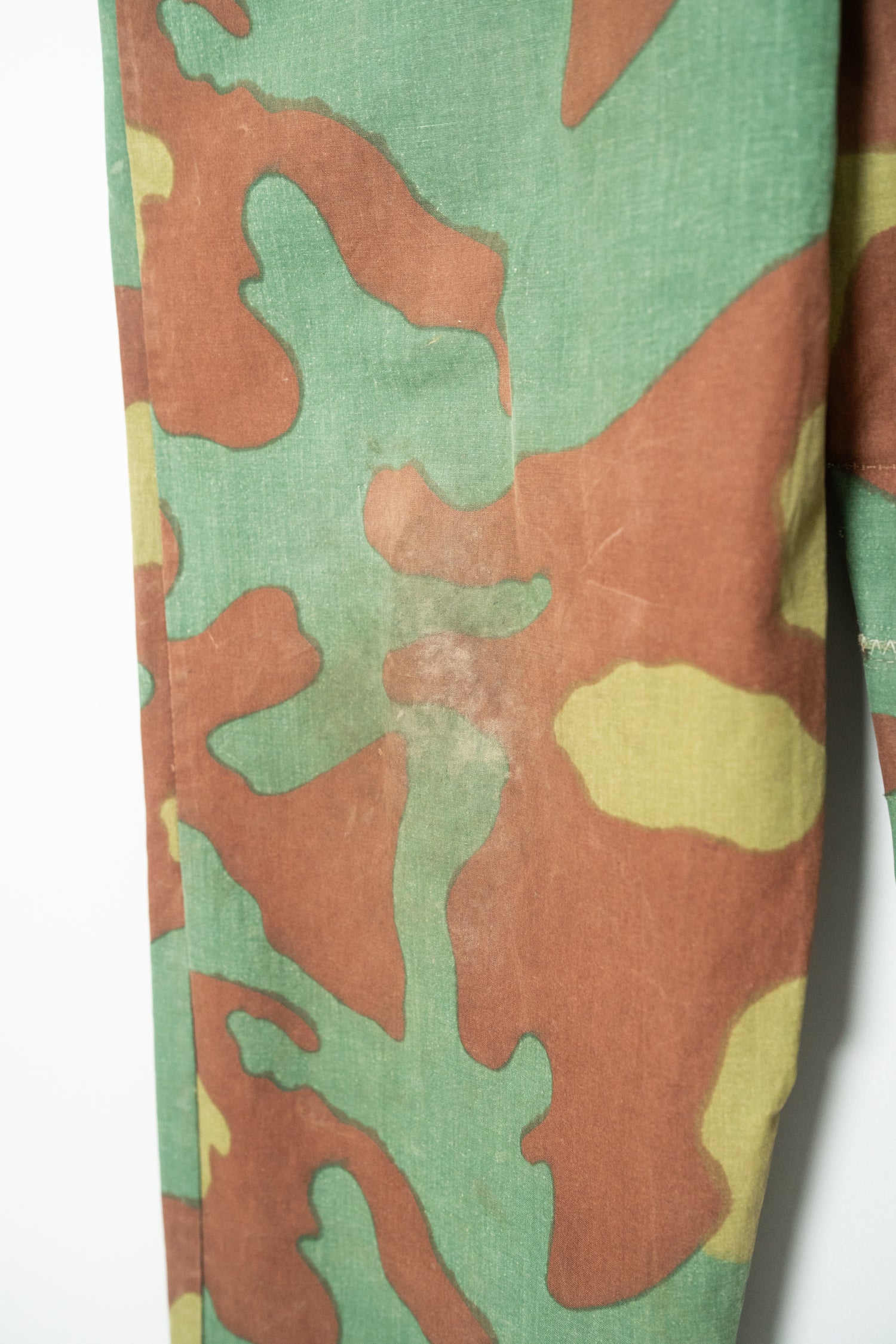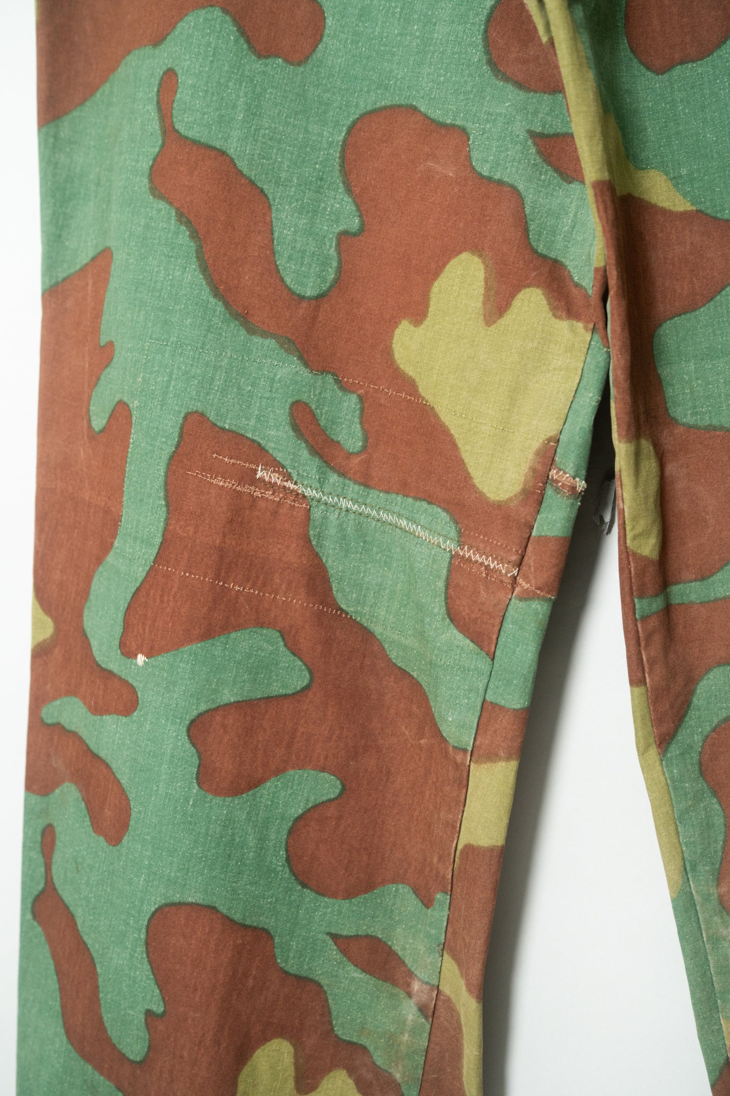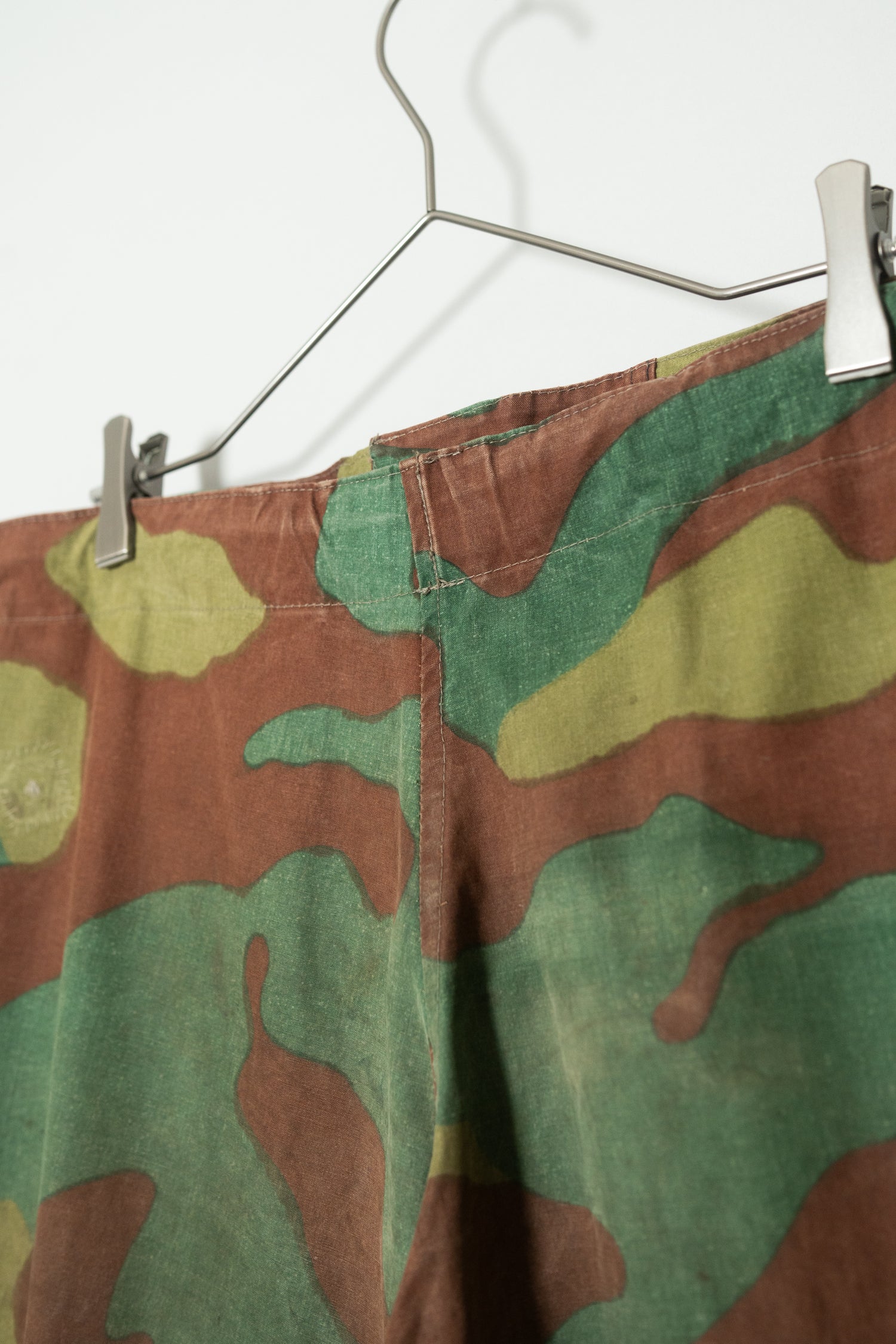 生地感も特筆すべきポイントです。一般的なサンマルコカモのボトムに見られるような厚手のコットンキャンバスではなく、より薄く、より軽量。SASオーバーパンツに近い軽快な質感でありながら、芯のあるハリを失っていないのが特徴です。風に揺れるような軽さと、軍用品らしいタフさを同時に感じさせる不思議なバランスは、この個体ならではの魅力と言えるでしょう。