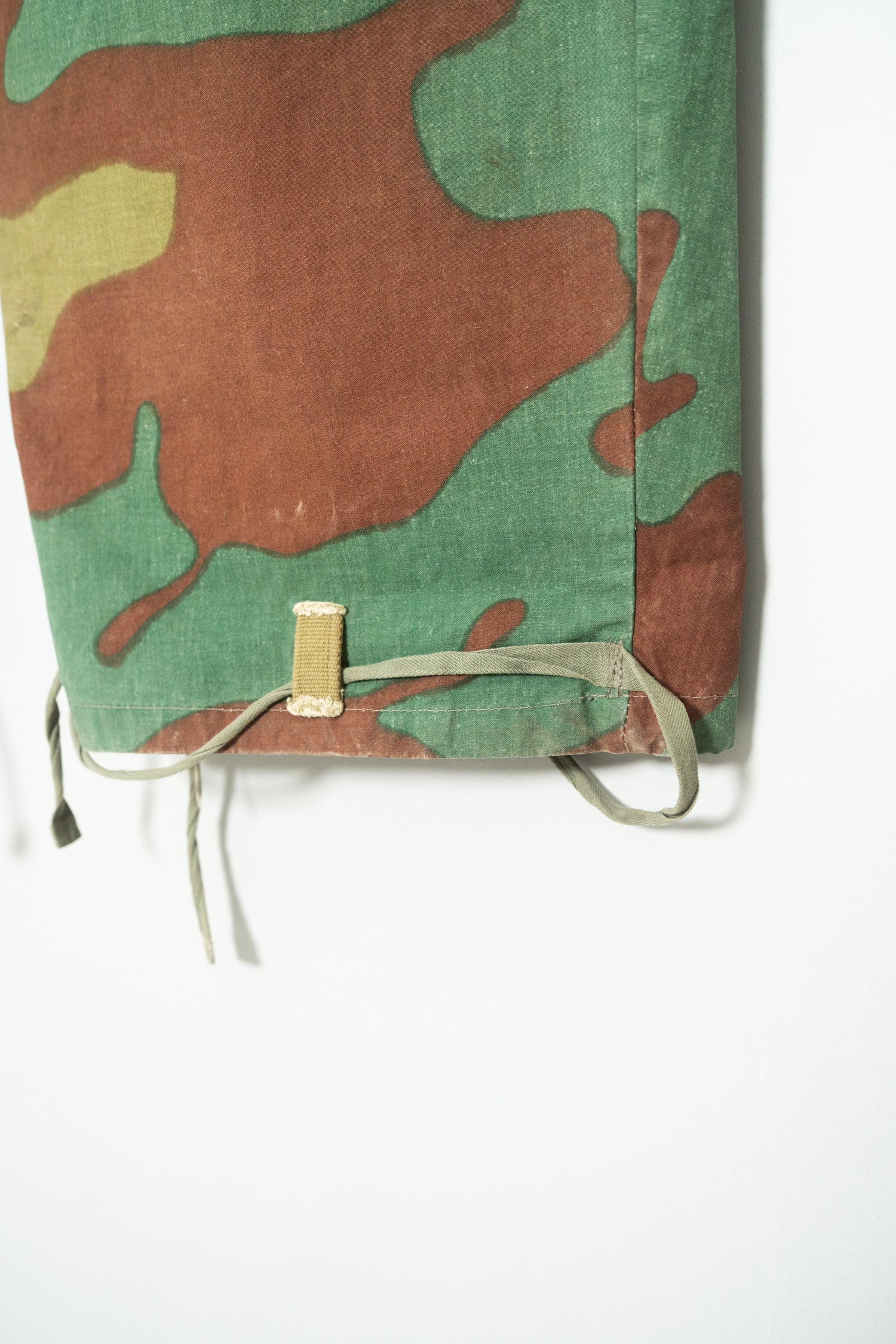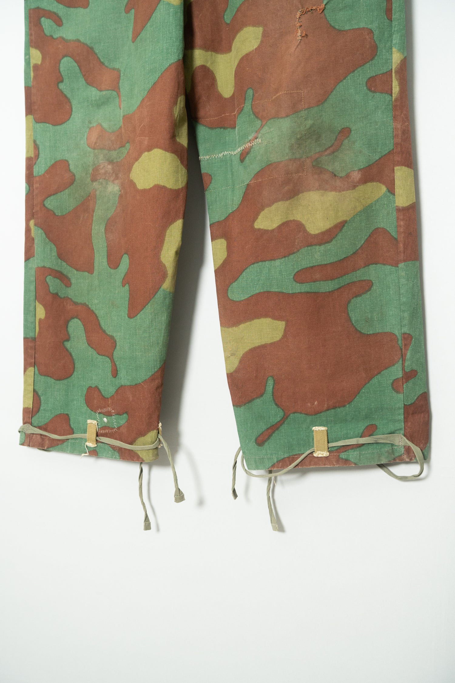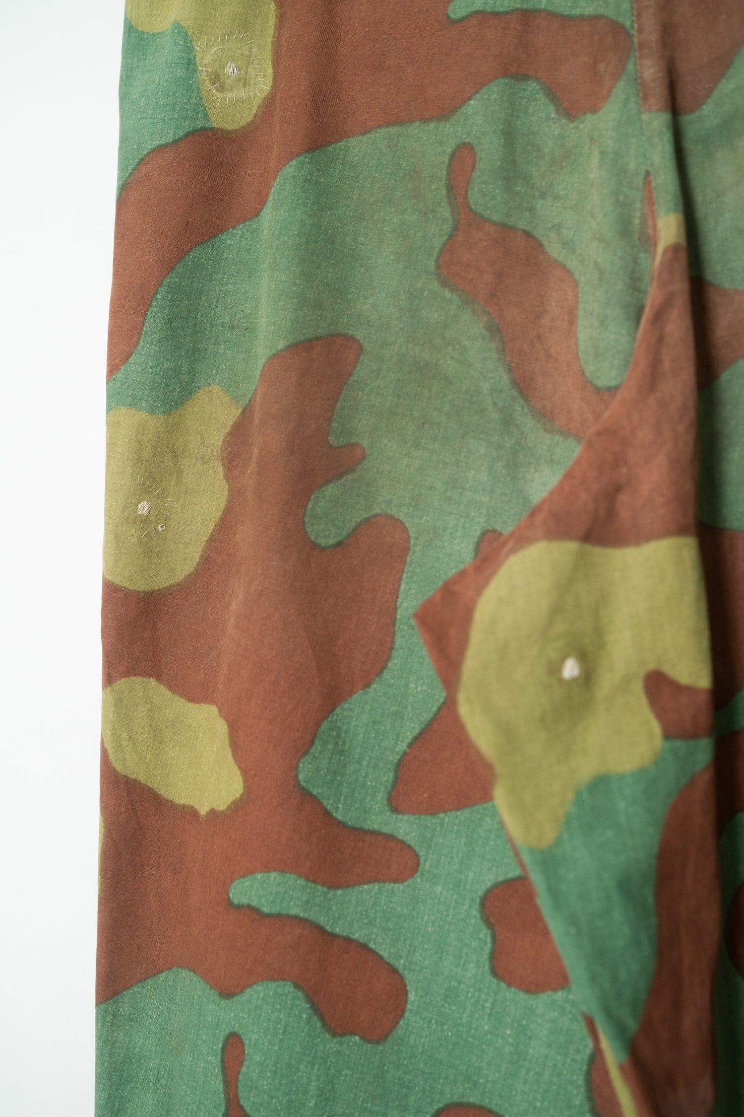 生地感も特筆すべきポイントです。一般的なサンマルコカモのボトムに見られるような厚手のコットンキャンバスではなく、より薄く、より軽量。SASオーバーパンツに近い軽快な質感でありながら、芯のあるハリを失っていないのが特徴です。風に揺れるような軽さと、軍用品らしいタフさを同時に感じさせる不思議なバランスは、この個体ならではの魅力と言えるでしょう。
