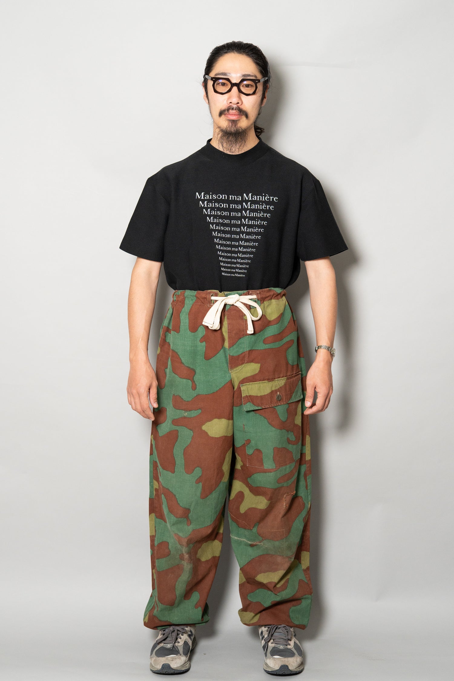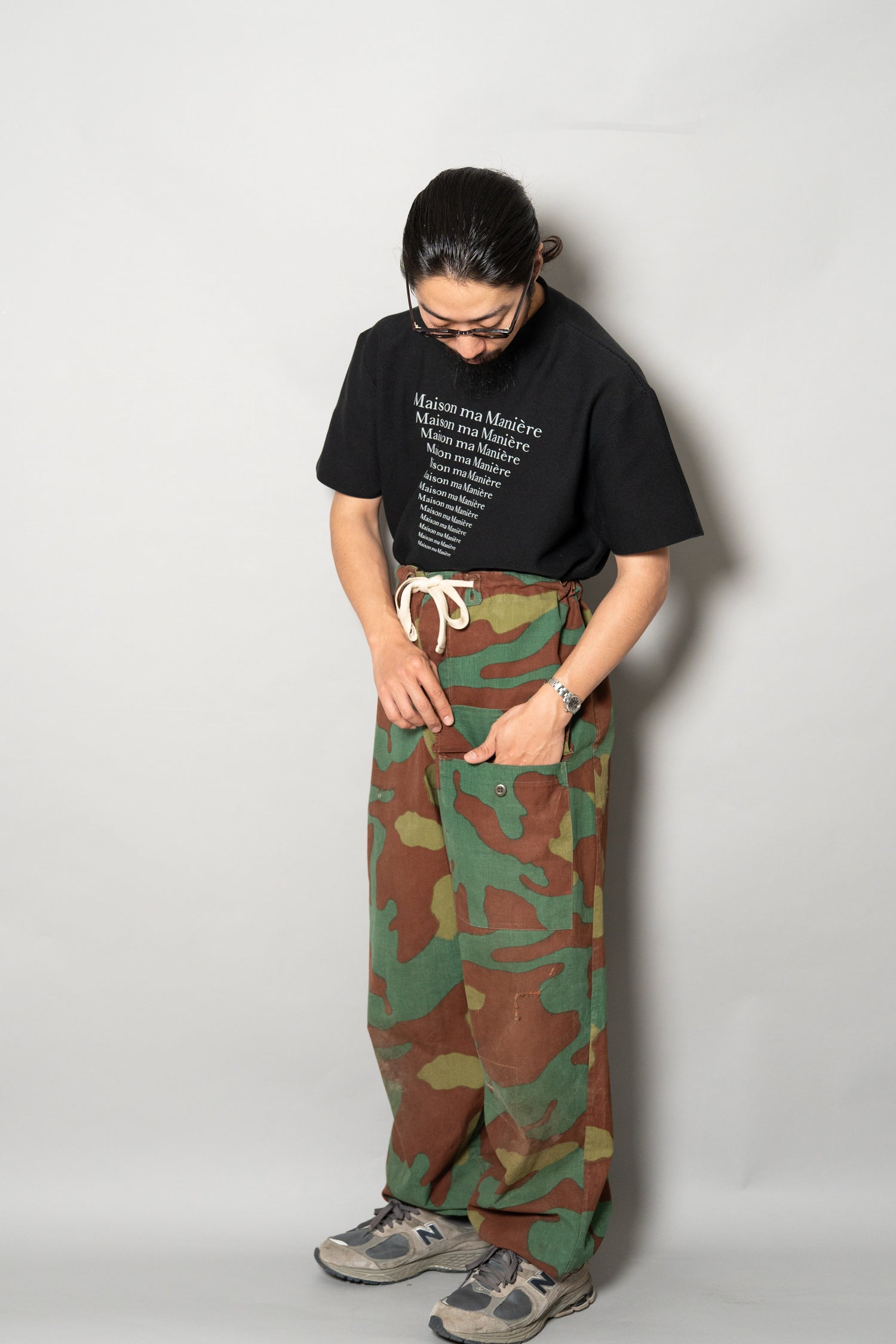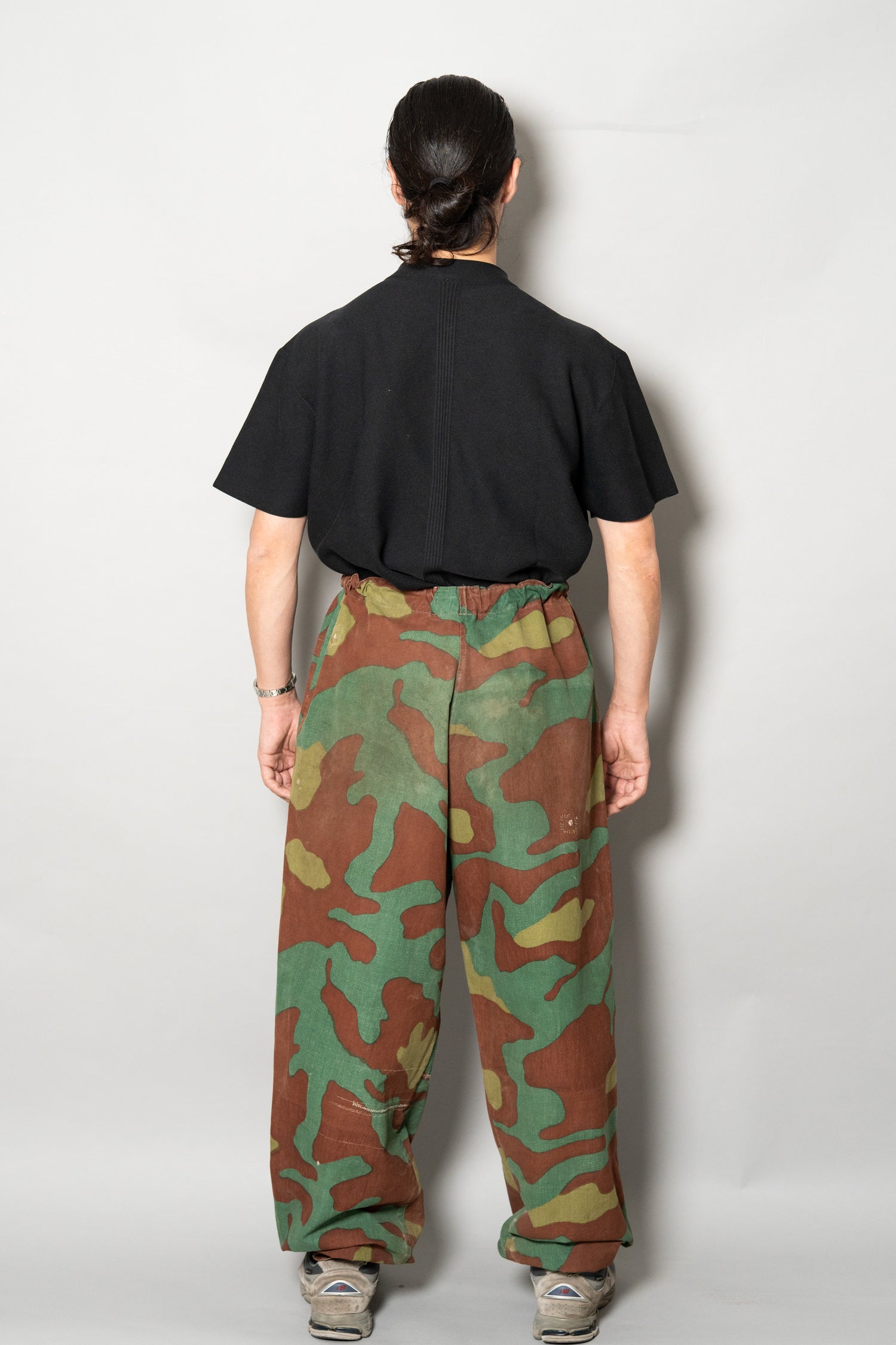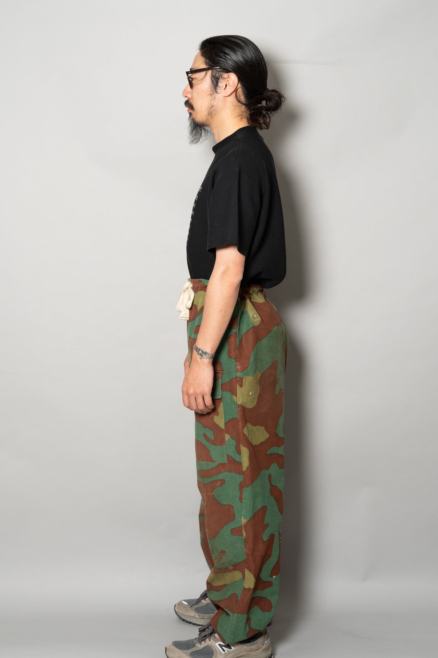 全体のシルエットは、ルーズすぎず、タイトすぎない絶妙な設計。ミリタリーパンツでありながら、現代的なワードローブにも自然に溶け込みます。無地のシャツやシンプルなニットと合わせれば洗練された印象に、無骨なヴィンテージジャケットと組み合わせれば重厚な世界観を演出できます。主張の強い迷彩柄でありながら、不思議とスタイリング全体を引き締めてくれる、完成度の高い一本です。