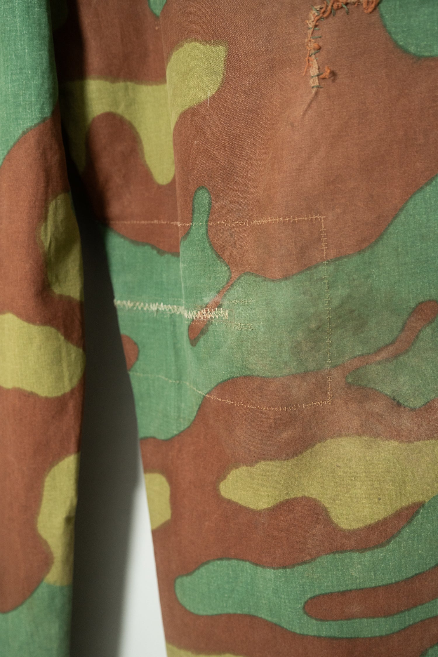 サンマルコカモ特有の、有機的で不規則なブラウン、グリーン、オリーブのパターンは、イタリア軍らしい美意識を色濃く反映した迷彩として知られています。本個体はその色味の出方が非常に深く、単調になりがちなカモ柄とは一線を画す奥行きを持っています。特にテント生地由来と思われる独特の織り感と経年による風合いが重なり合い、まるで一点物のアートピースのような存在感を放ちます。