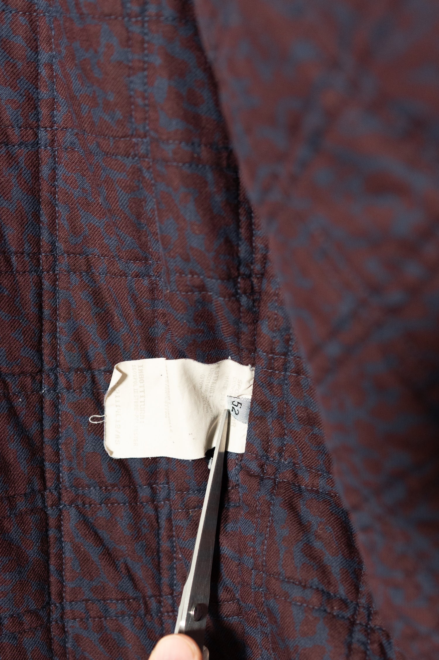 シルエットはゆったりとしたボックス型で、肩にかけて自然に落ちるラインが美しい。フロントのボタンをすべて留めればミニマルなスタンドカラー、ラペルを折り返せばテーラードジャケットのような表情へと変化します。つまりこの一着は、スタンドカラーとテーラードの二面性を備えたデザイン。ワークウェアの機能性とドレスの品格を同居させた、極めて完成度の高い構造美を持っています。これほどまでにバランスの取れたデザインは、当時のC.P.の中でも稀有な存在でした。