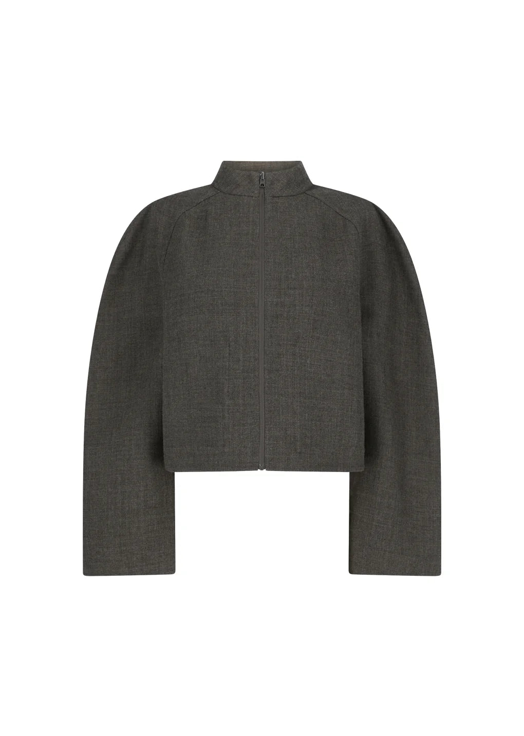スタンドカラーとラウンドラグランスリーブの構造的なシルエット