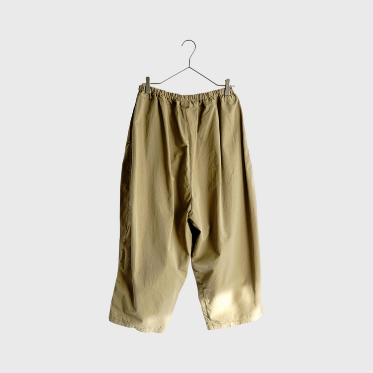 裾にかけてバルーンシルエットにテーパードした、ボールのような丸みのあるボールパンツ。40番単糸を高密度に綾織に織り上げた生地を採用し、バイオウォッシュを施し軽い生地感です。薄手で生地に動きがあり、歩くたびに表情が変化するところも特徴的。ウエストはゴム仕様に加え、ドローコードで調節が可能。ラクな着心地も嬉しいポイントです。股上がたっぷりと深く、ゆったりシルエットでヒップや脚のラインも拾いません。リラックスした履き心地ながら、シャツやシンプルなTシャツと合わせても雰囲気の出るアイテムです。