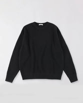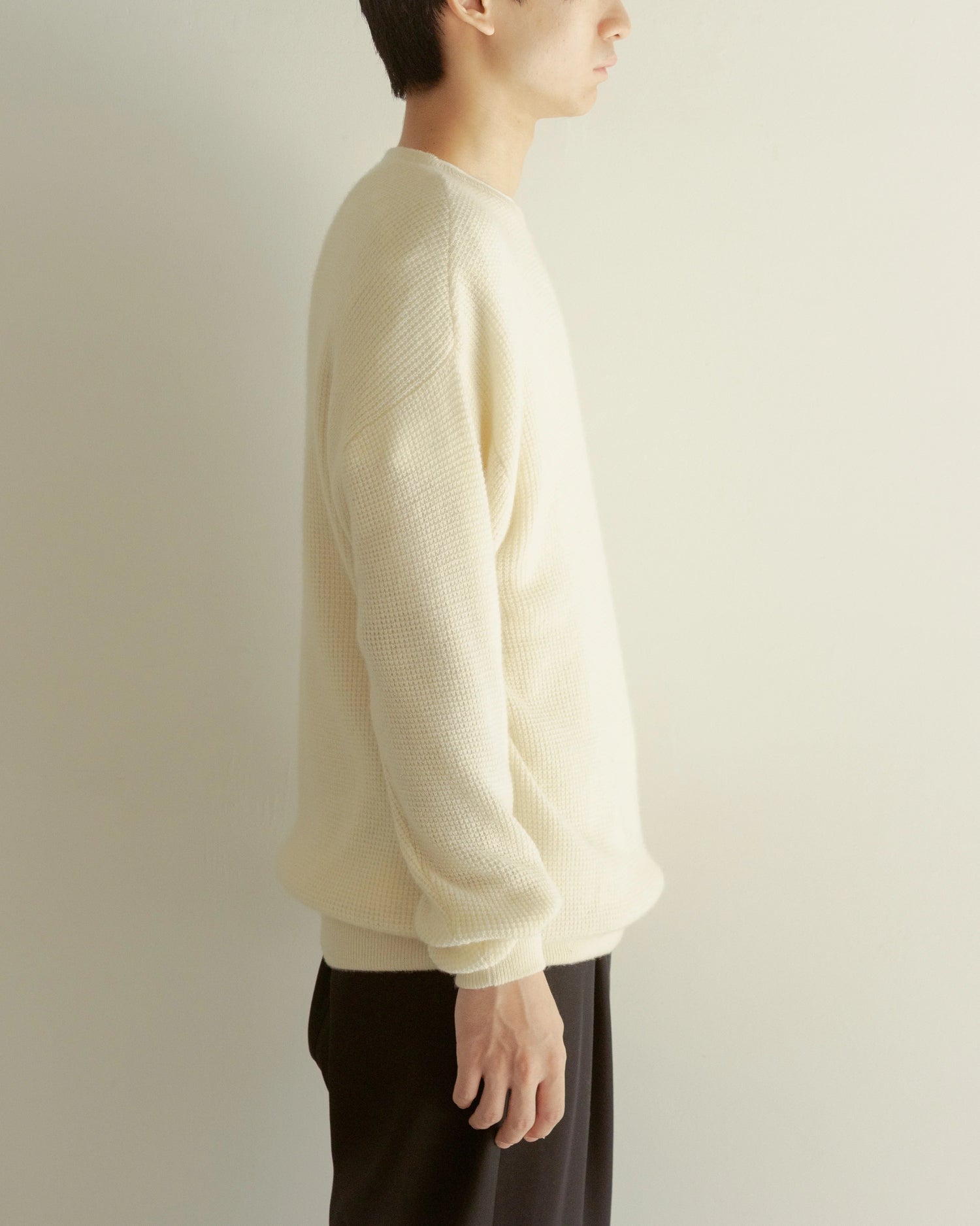100%カシミヤによる、梳毛糸(=長く細い強度のある糸)のみを選定したオリジナルハイゲージニットスウェット。ロンT以上スウェット未満を目指し、様々な環境下でも一枚で完結するオールラウンドなアイテムです。程良く肉感を持ちながら重さを感じさせず、常に身体を常温に保つ機能性は、レイヤーの一枚にとても重宝します。カシミヤ本来の性質により経年変化による劣化も少ないため、長く愛用し続けられる一品。着るほどにカシミヤに風合いが生まれ、柔らかく身体に馴染んでいきます。ヴィンテージスウェットをベースにしたデザインは、アスレティックラグランスリーブ、サイドリブ仕様に加え前後差のない襟ぐりなどこだわりのデザインが特徴。