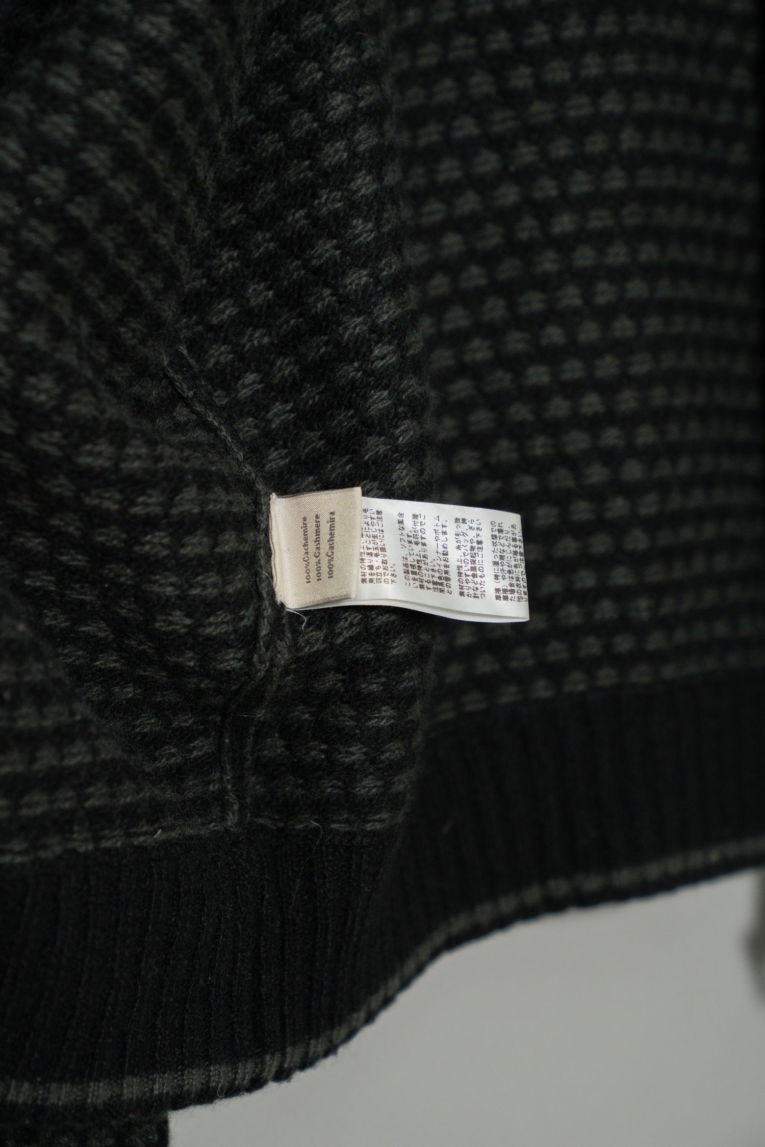 コンディションも良好で、着用に支障のあるダメージは見られません。全体的にわずかな毛玉感がございますが、それは上質なカシミヤ特有の自然な経年変化によるもので、むしろ素材の深みを引き出しています。時間と共に柔らかさが増し、着る人の身体に馴染んでいく過程もまた、この服の魅力の一部と言えるでしょう。