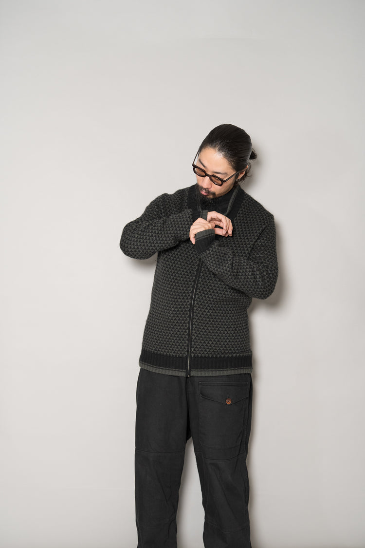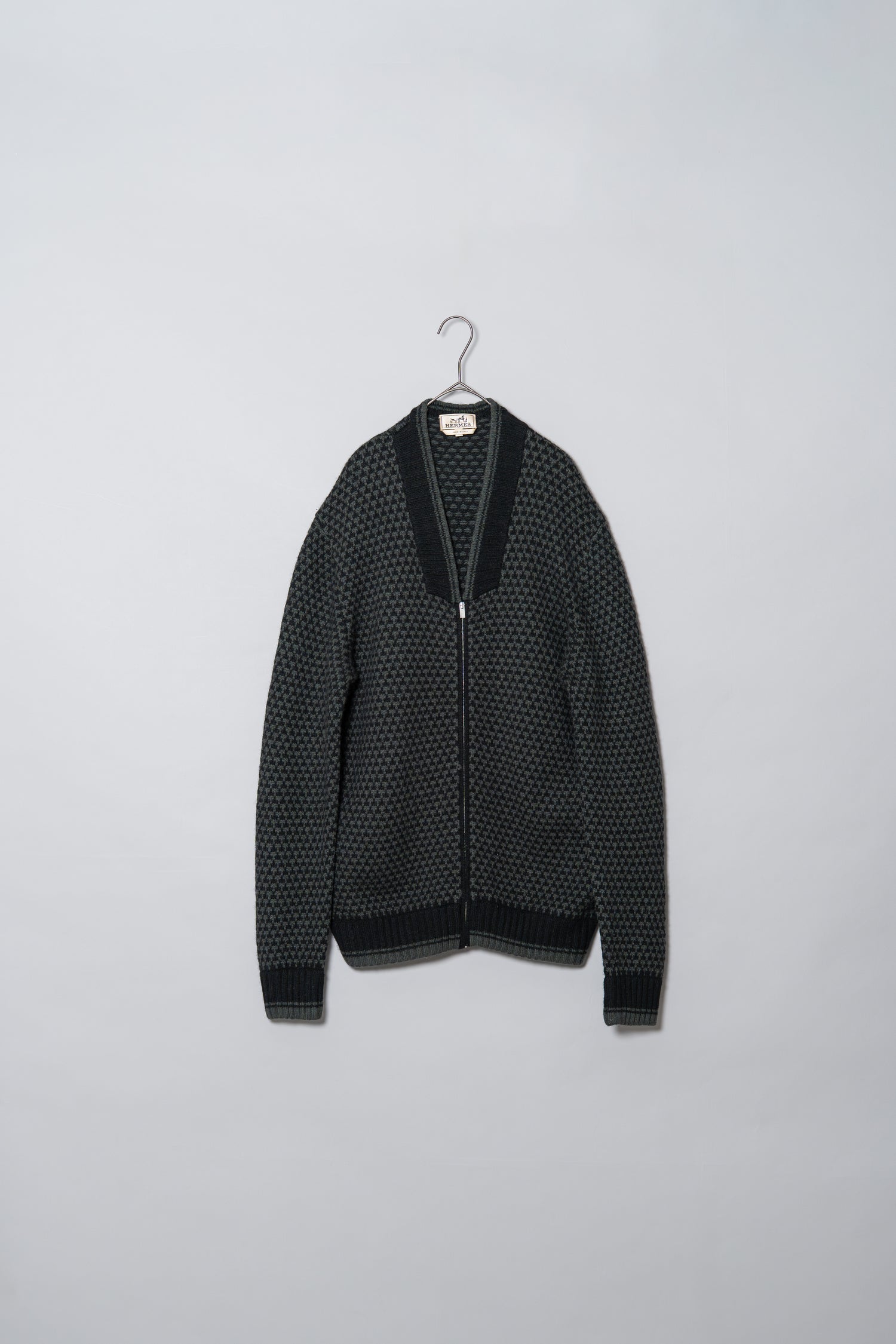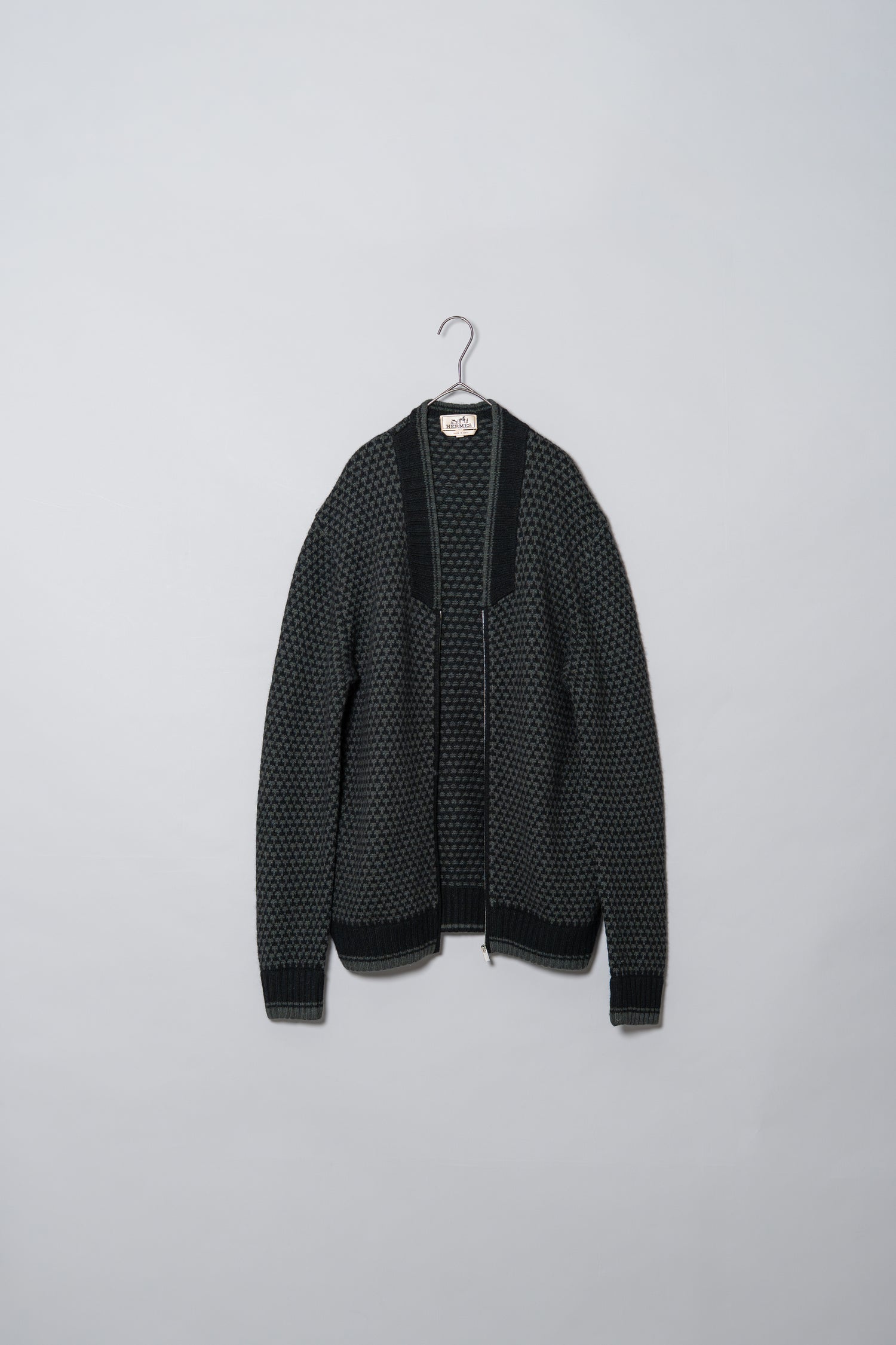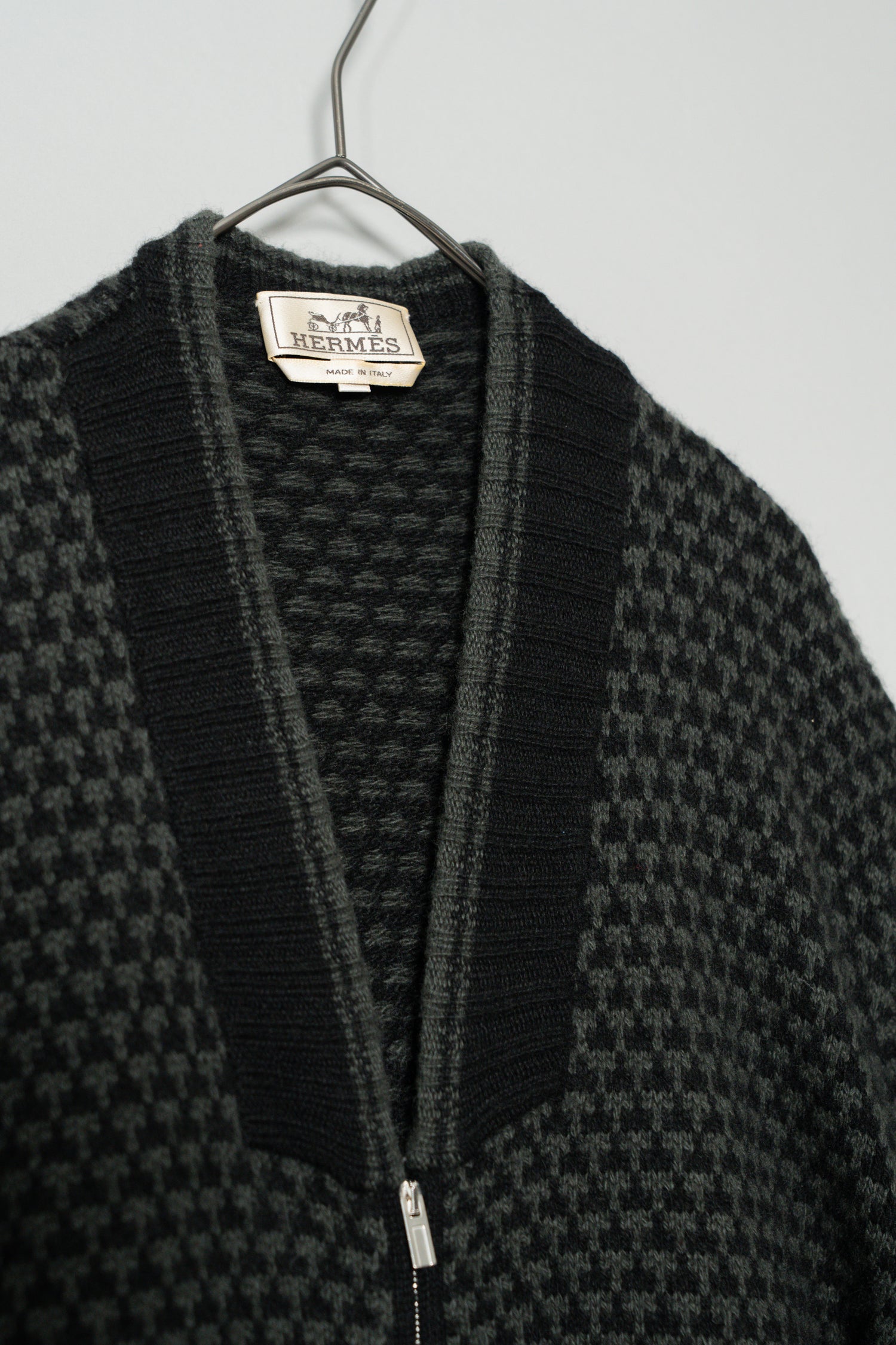 落ち着いた気品と確かな存在感を放つ、エルメスのカシミヤジップブルゾン。クラシカルな千鳥格子柄をベースにしながらも、エルメスらしい上質な素材使いと繊細な構築で、ラグジュアリーでありながらどこか控えめな美しさを感じさせる一着です。