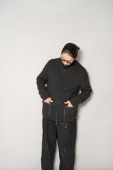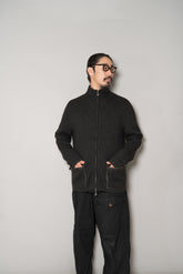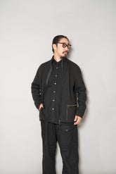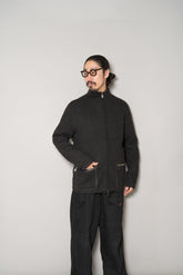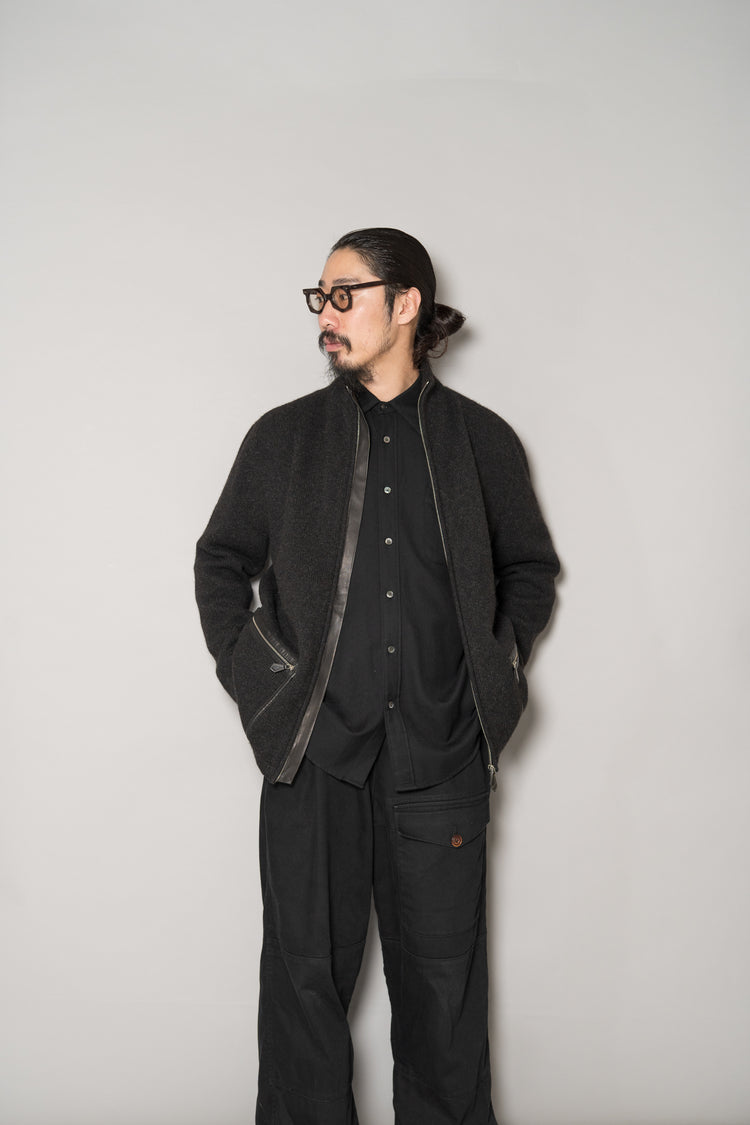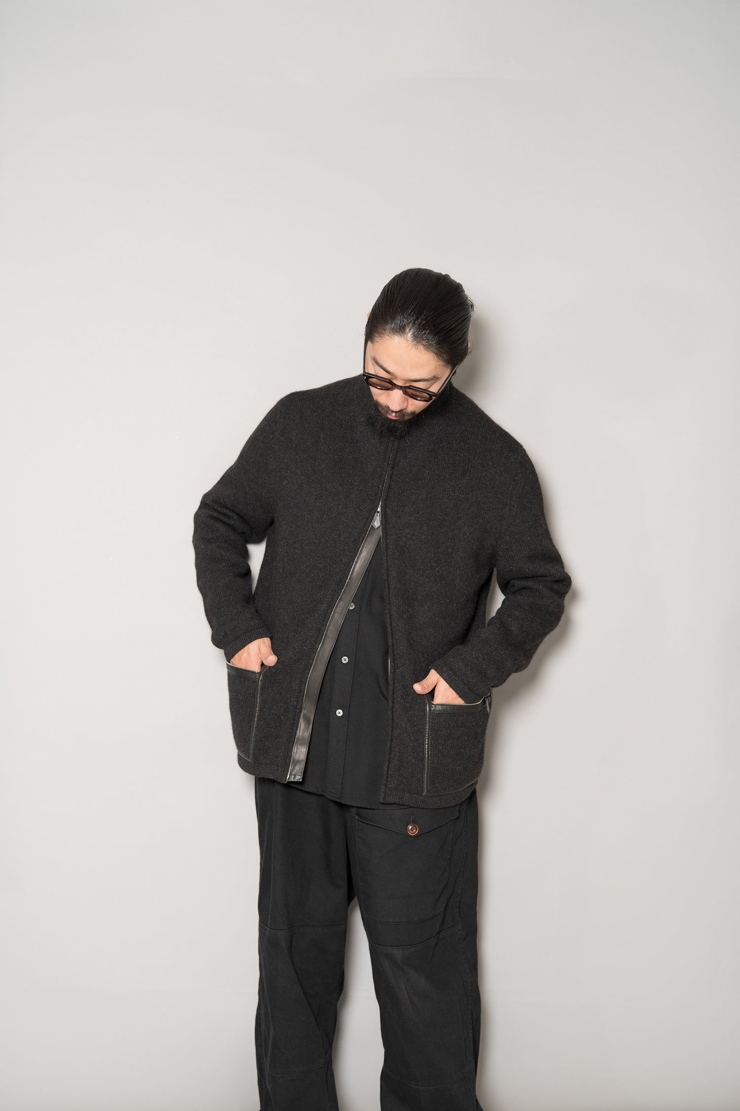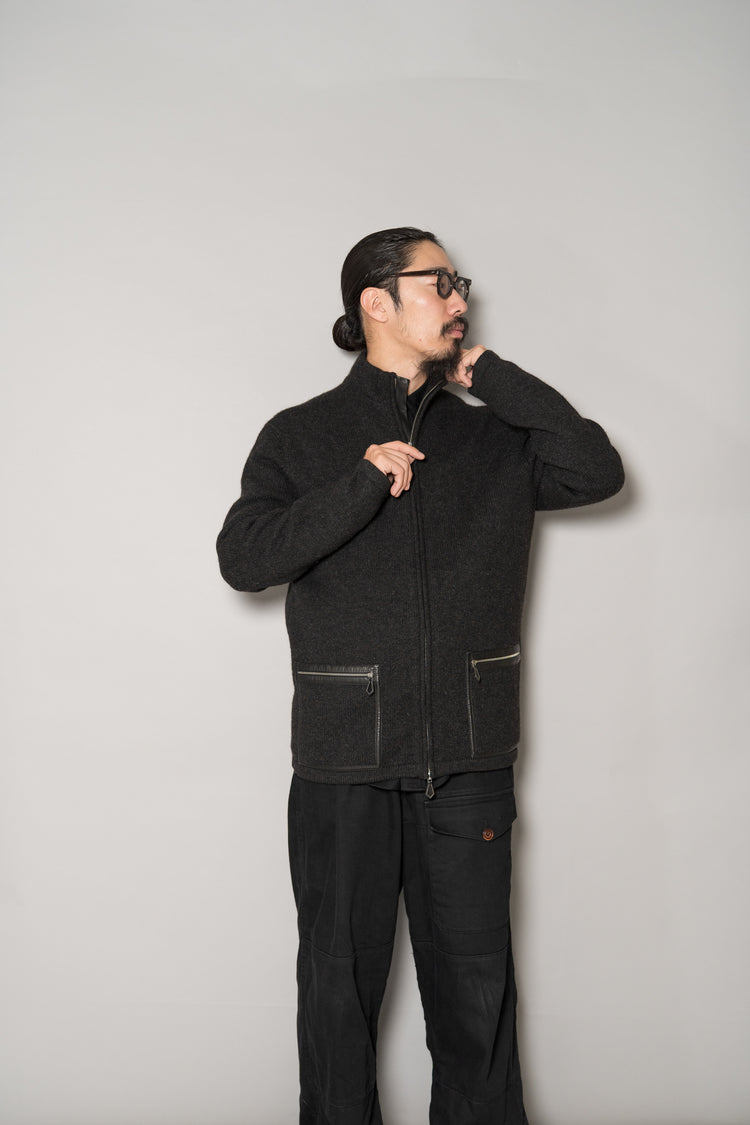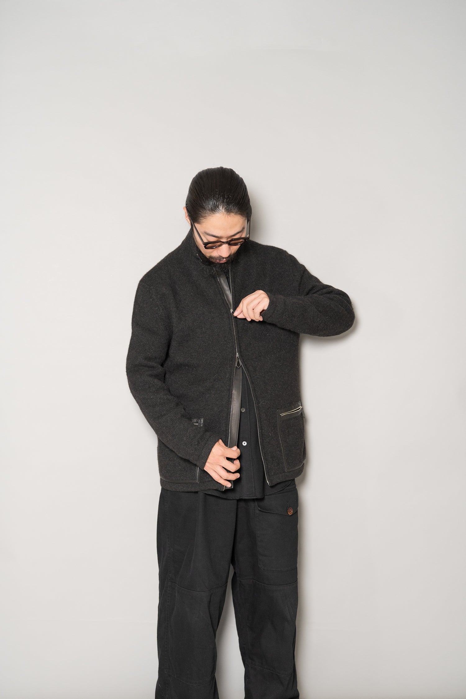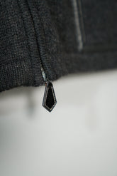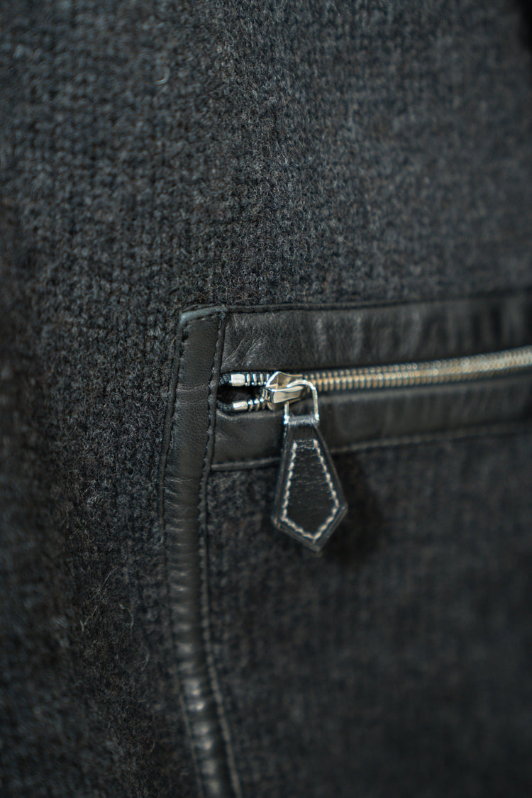 フロントには、ジップ付きのポケットが左右に配置されています。ポケット口には上質なレザーのトリミングが施され、引き手には小さなレザーパーツを採用。ほんの数センチの装飾でありながら、そこに宿るクラフトの精度は驚くほど高く、無駄のないデザインの中に確かな個性を与えています。ステッチの間隔、レザーの縁の処理、ポケットの形状。すべてが均整の取れた美しさを描いており、職人の手による緻密な仕事が見て取れます。