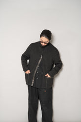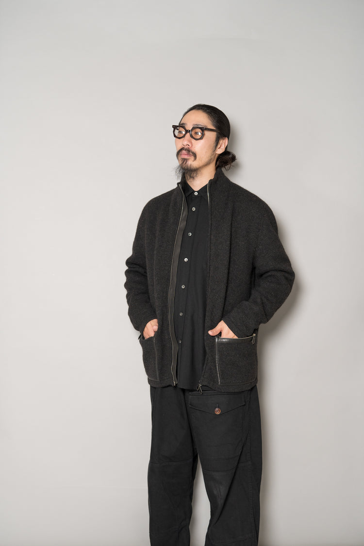また、サイズはXLとゆとりある設計で、現代のリラックスしたスタイルにも自然に馴染みます。アームラインや身幅には余白がありながらも、だらしなく見えないのは、パターン設計の緻密さゆえ。立体的な肩のラインが、美しく自然な落ち感を生み、羽織るだけで絵になるバランスを保ちます。