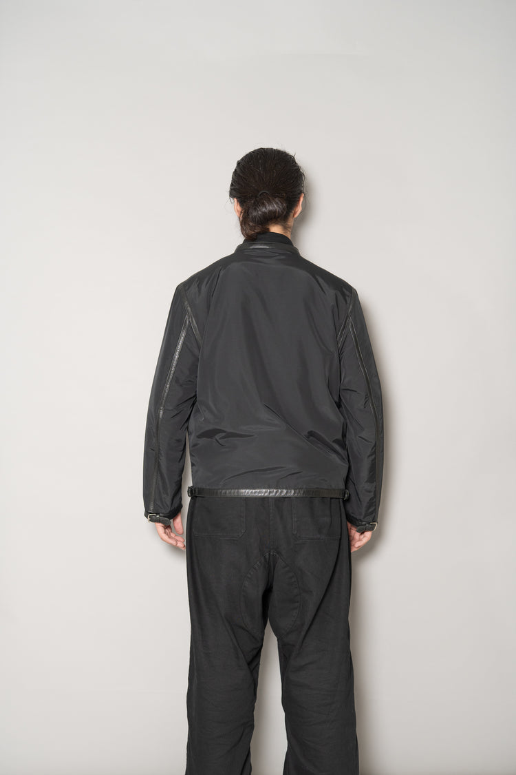 艶やかなブラックのナイロンシェルに、上質なラムレザーでトリミングを施した構築的なデザインは、一見ミニマルでありながら、纏った瞬間に空気が変わるような存在感を放ちます。軽やかでしなやか、そしてどこか冷ややかな美しさが漂うその佇まいは、まさに “静かなラグジュアリー” を体現しています。