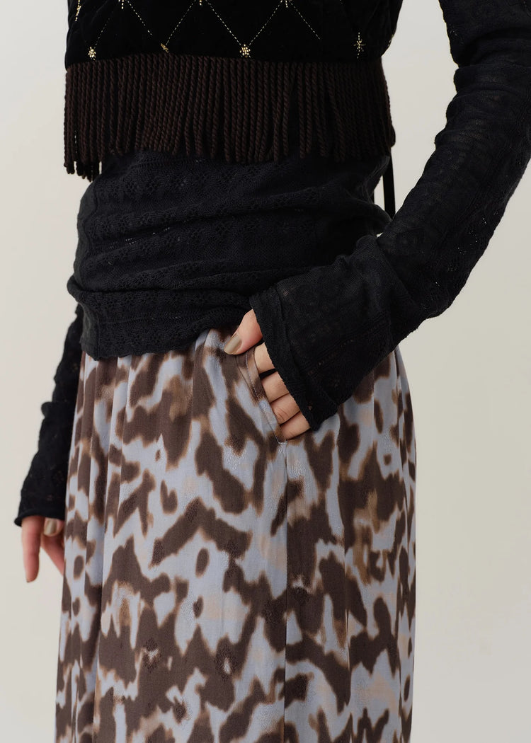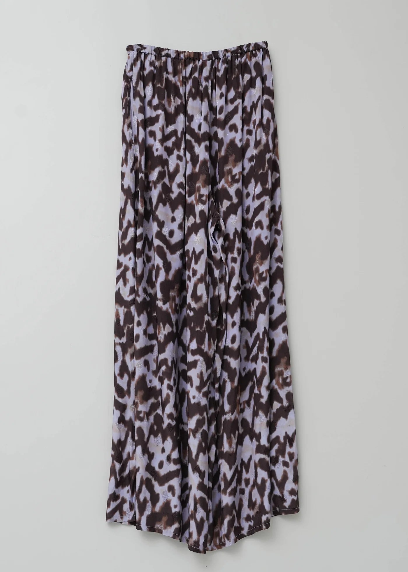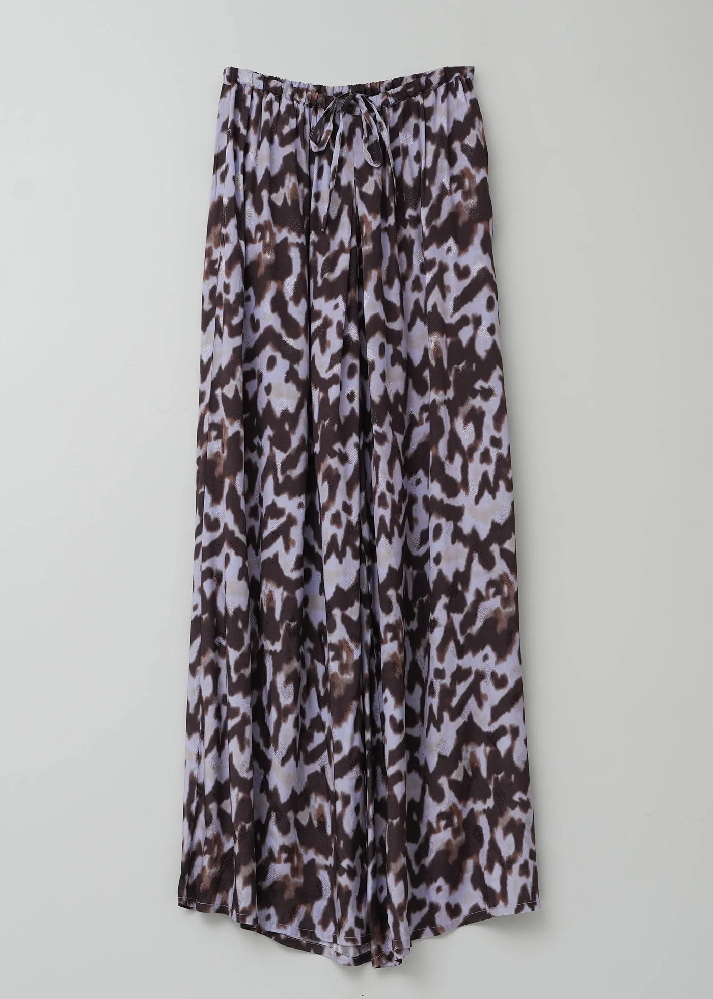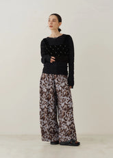 菱形の織りが施されたレーヨンジャガードに、宇宙を思わせるコスミック柄のプリントが映えるワイドパンツ。