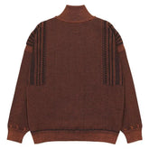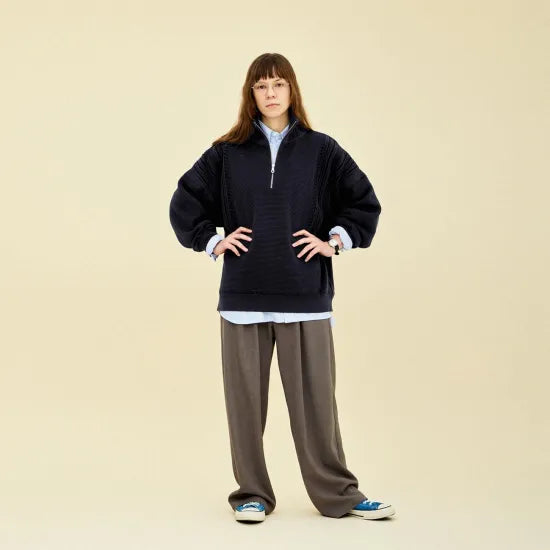 プレーティング編みと言われる表目側と裏目側で異なる糸を編む技法を使用し、表と裏で糸の色を変えて、2色で編むことで奥行きのある表情に仕上げました。