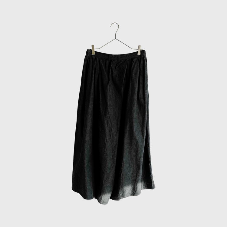 フロントをラップスカートのようにツイストさせたアシンメトリーなデザインが特徴的なパンツで、サルエルパンツのように股上が深く全体的にリラックスして穿いていただけるパンツです。スカートのようにボリューム感のあるこちらは、デニムジャケットなどの着丈の短いアウターにとても合わせやすく、シャツなどとシンプルに合わせていただけるアイテムです。