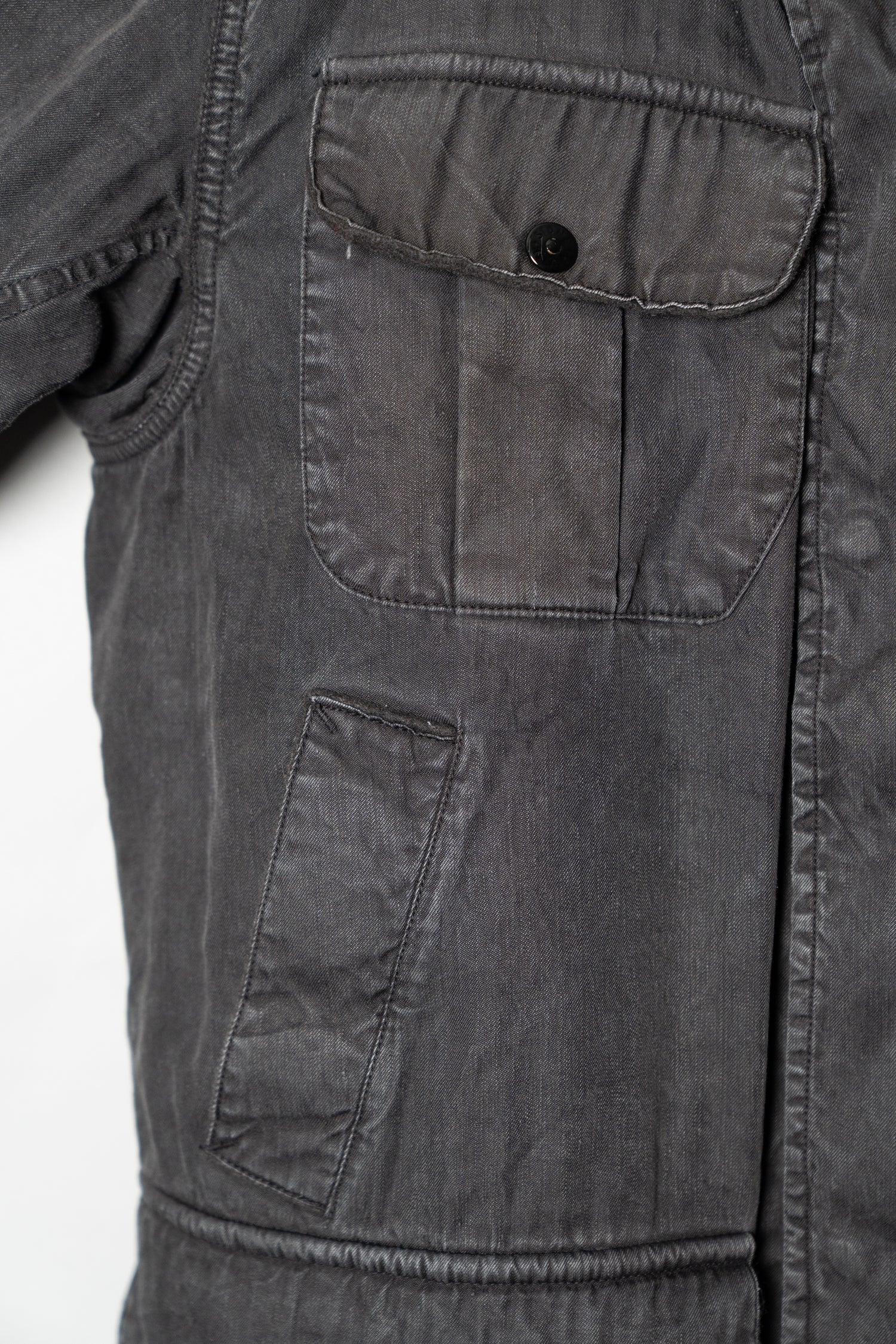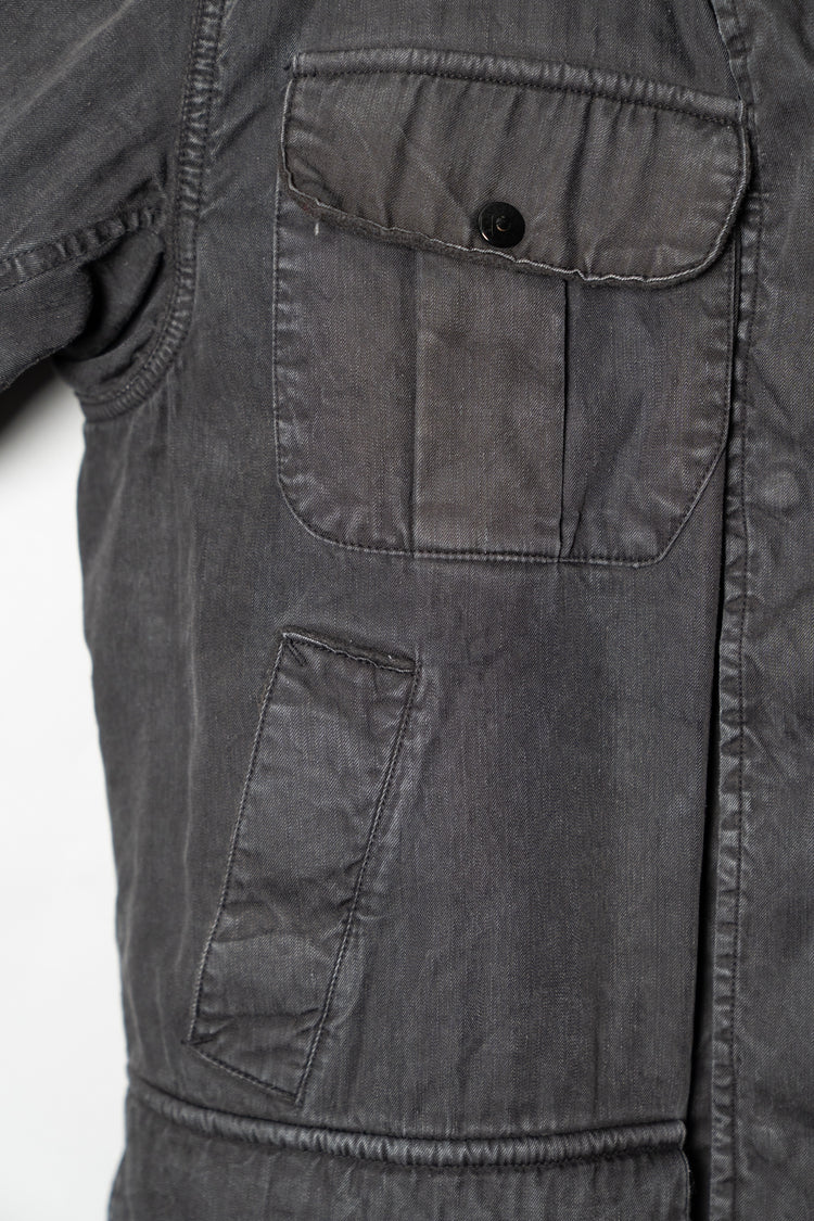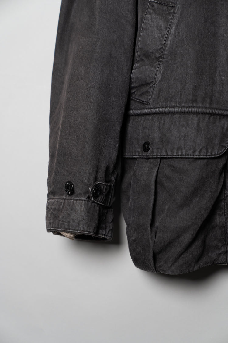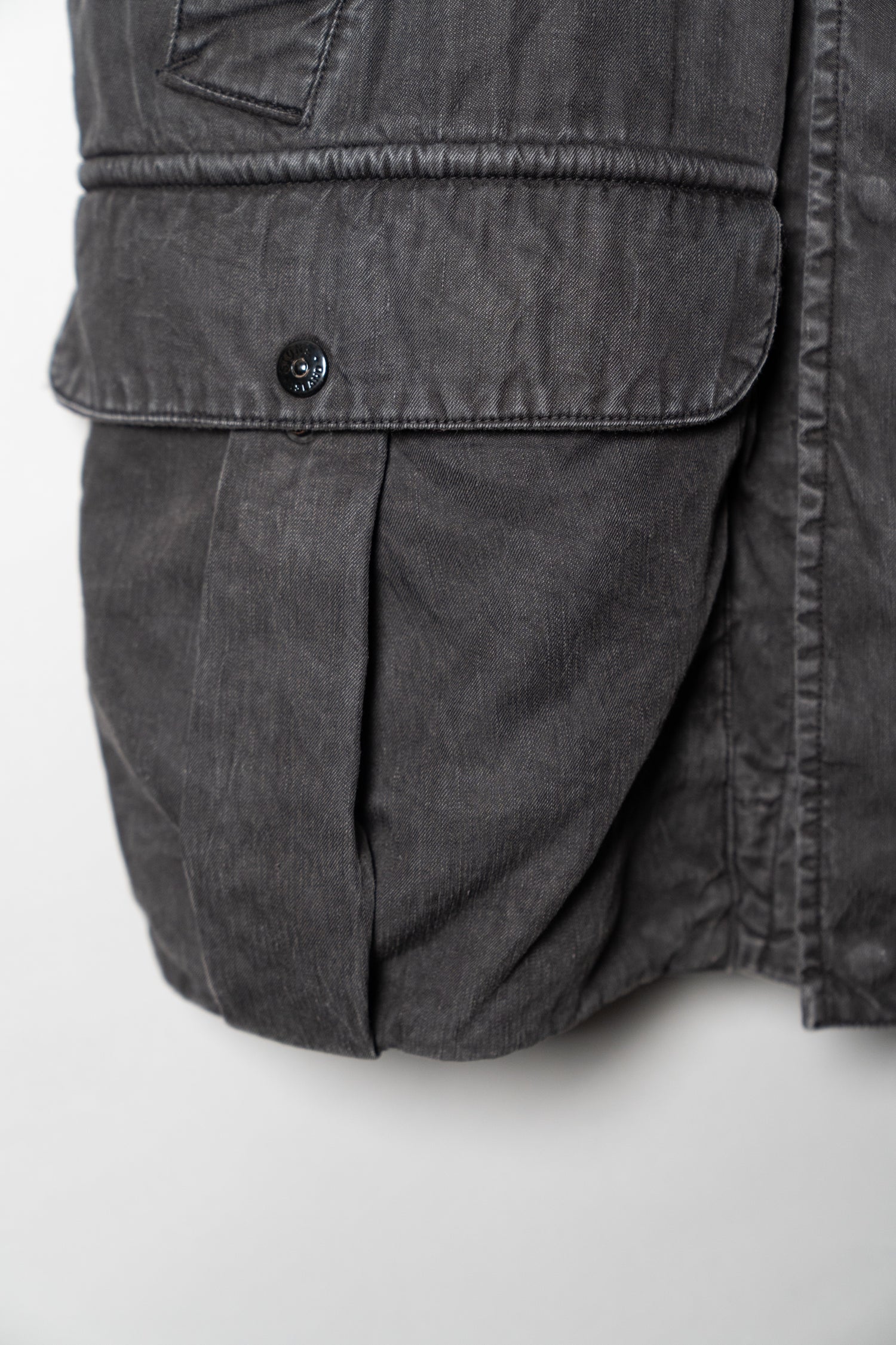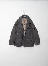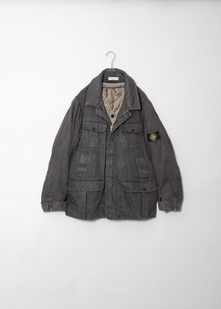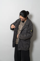 さらにこのモデルには“Quilted Liner(キルティングライナー)”が装備されています。ライナーは取り外しが可能で、単体でも着用できる仕様。当時のSTONE ISLANDが掲げていた「機能服」としての思想が色濃く反映されたディテールであり、寒暖差の激しい秋冬シーズンにおいて多用途に対応可能な設計です。フロントには4つの大容量ポケットが配され、フィールドジャケットを思わせる無骨な佇まい。加えて、立体的に構築された袖のパターンは可動域を広げ、ストレスなく着用できる実用性を備えています。