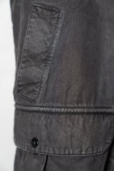Flax Telaの持つ特徴的な質感は、コットンやナイロンにはない奥行きのある表情にあります。リネン特有のざらりとした風合いに、STONE ISLAND独自のガーメントダイ(製品染め)を施すことで、深みのある色合いと経年変化を楽しめる仕上がりに。光の角度によってマットにも、わずかに光沢を帯びたようにも見える独特の表面感は、まさにアーカイブ・ピースとしての価値を裏付けています。