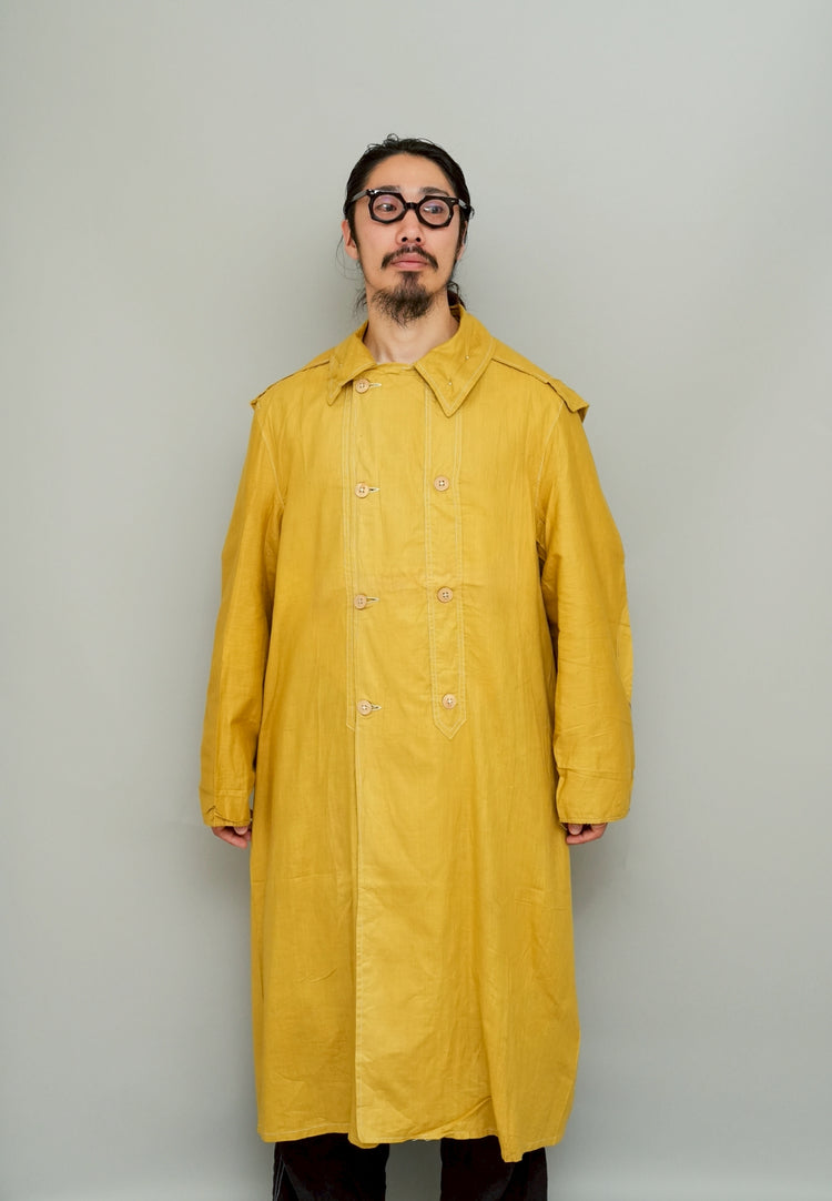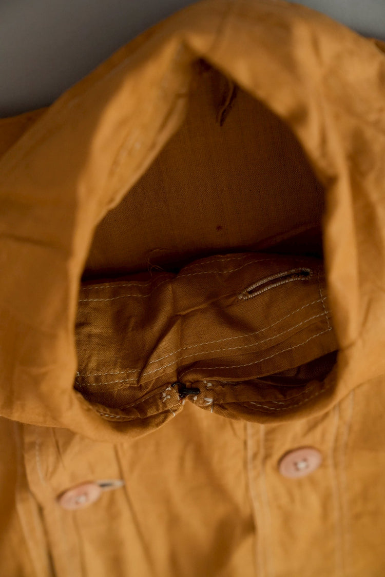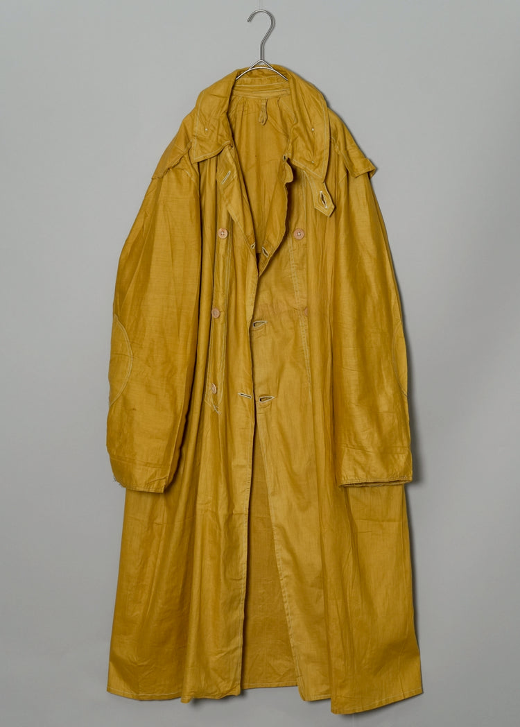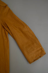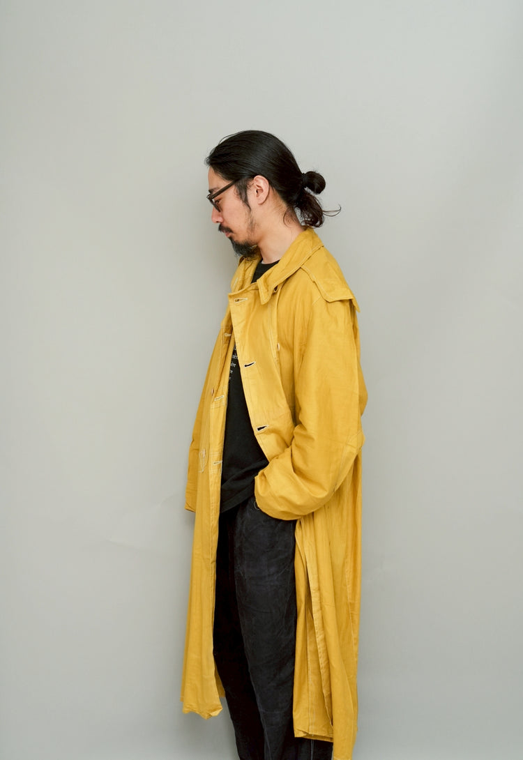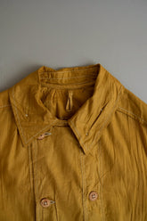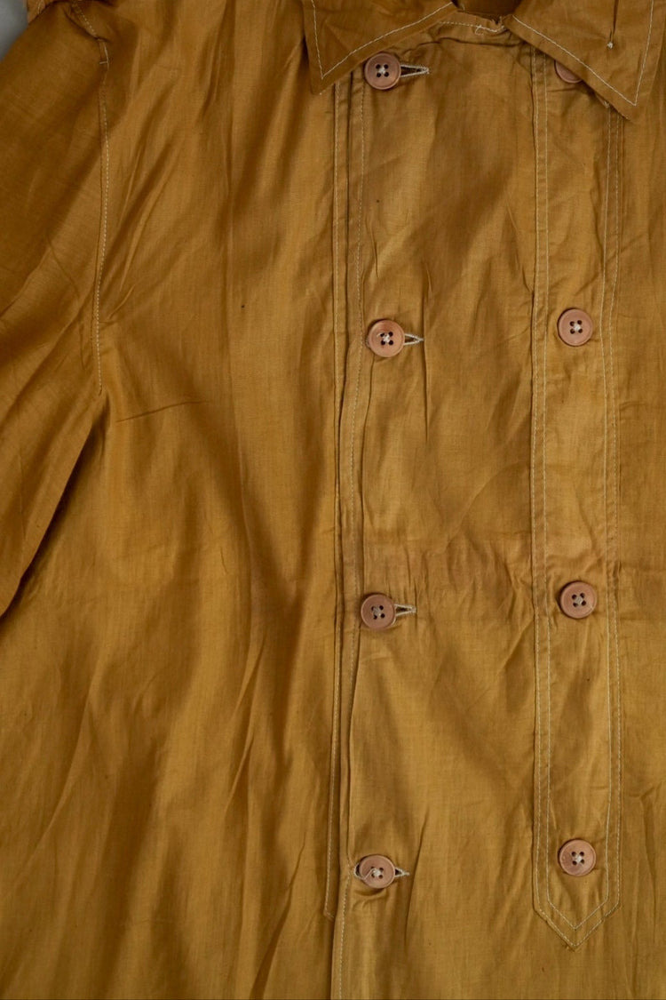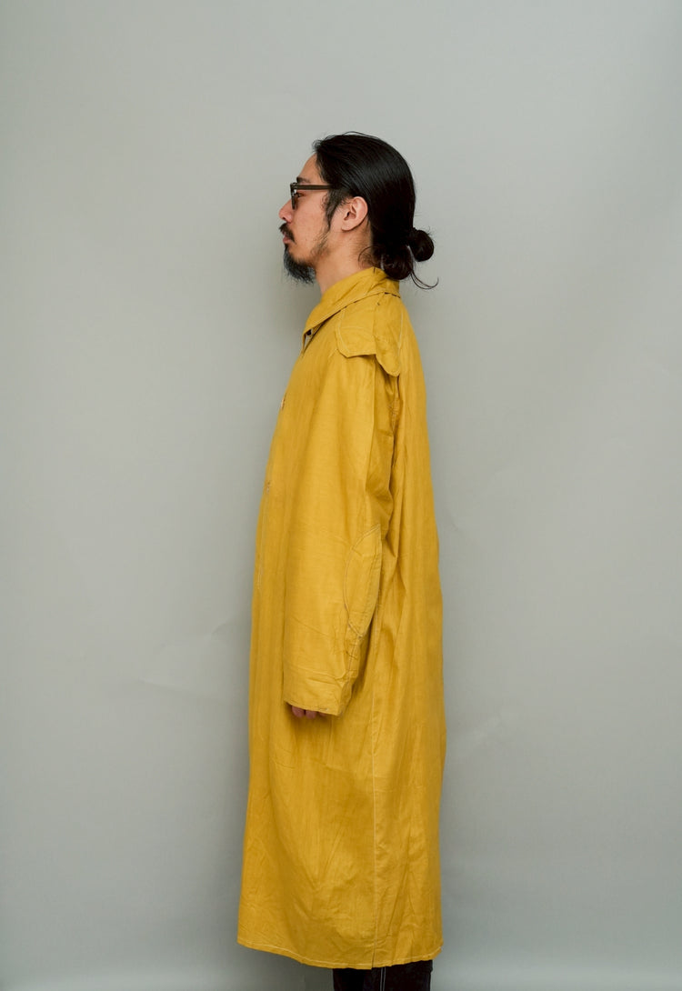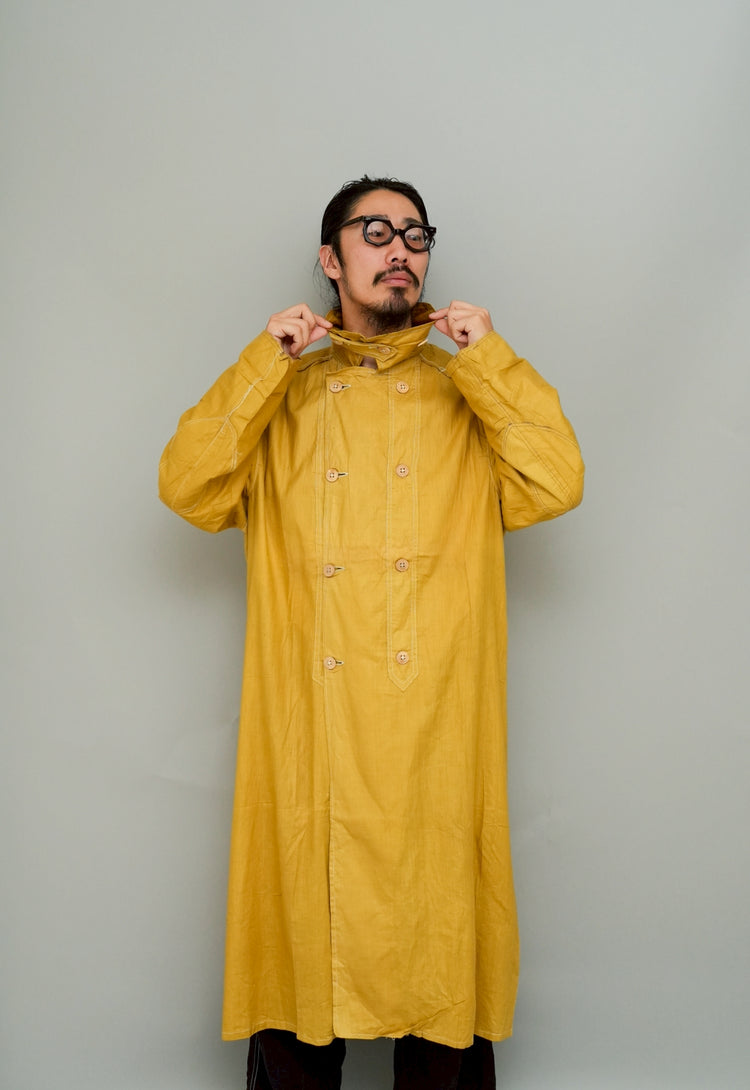 このダスターコートは、コットンとリネンを混紡した生地で仕立てられています。リネン特有のハリと通気性に、コットンの柔らかさが加わったテクスチャーは、長い時を経てもなお健在。しなやかで軽やかな着心地はもちろん、表面に浮かぶ微かな光沢が100年前の服飾文化を静かに物語ります。色合いは鮮やかでありながら深みのあるマスタードイエロー。大地や収穫を連想させるトーンは、実用服でありながらもどこか温かみと洗練を兼ね備えています。