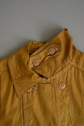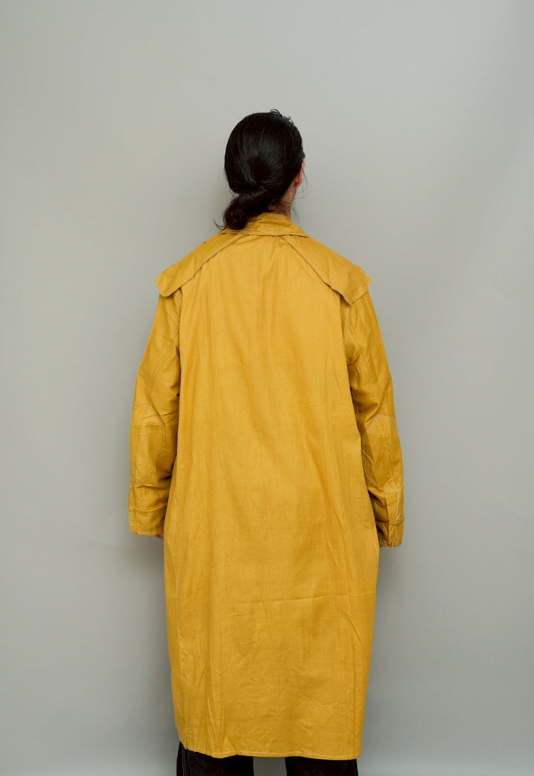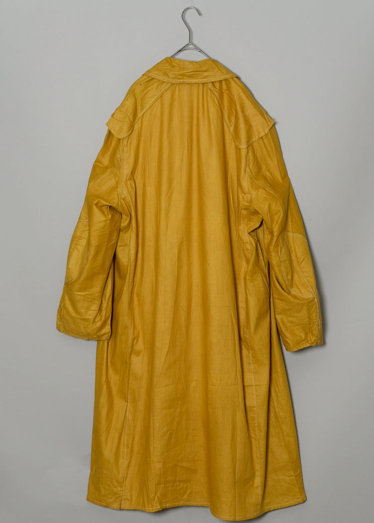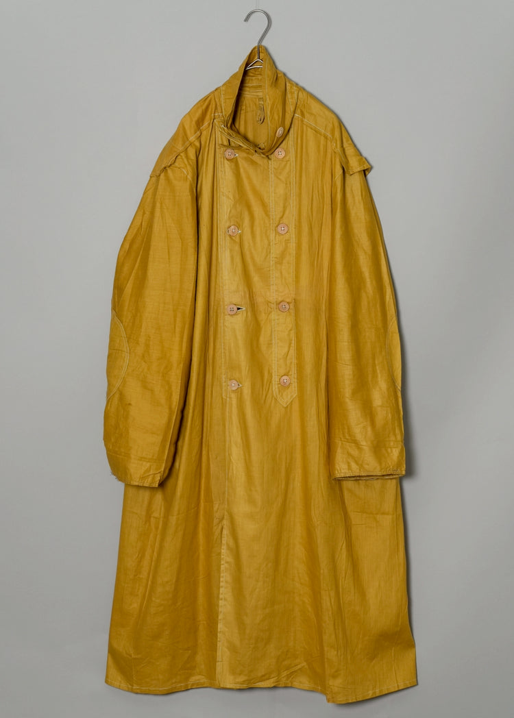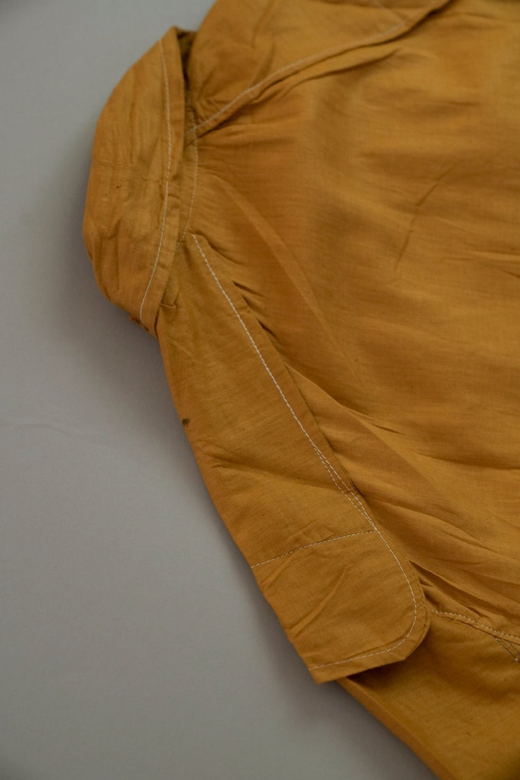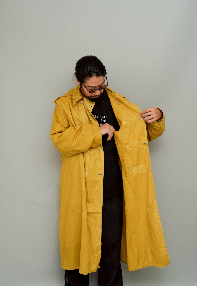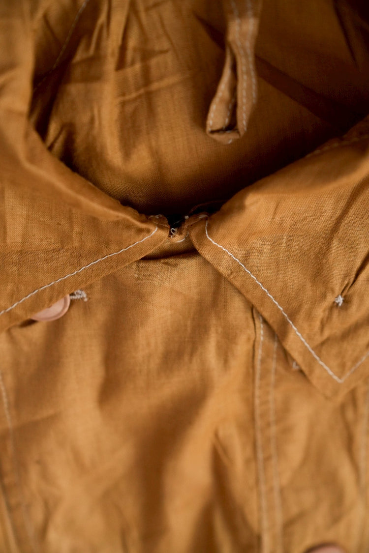 このダスターコートは、コットンとリネンを混紡した生地で仕立てられています。リネン特有のハリと通気性に、コットンの柔らかさが加わったテクスチャーは、長い時を経てもなお健在。しなやかで軽やかな着心地はもちろん、表面に浮かぶ微かな光沢が100年前の服飾文化を静かに物語ります。色合いは鮮やかでありながら深みのあるマスタードイエロー。大地や収穫を連想させるトーンは、実用服でありながらもどこか温かみと洗練を兼ね備えています。