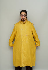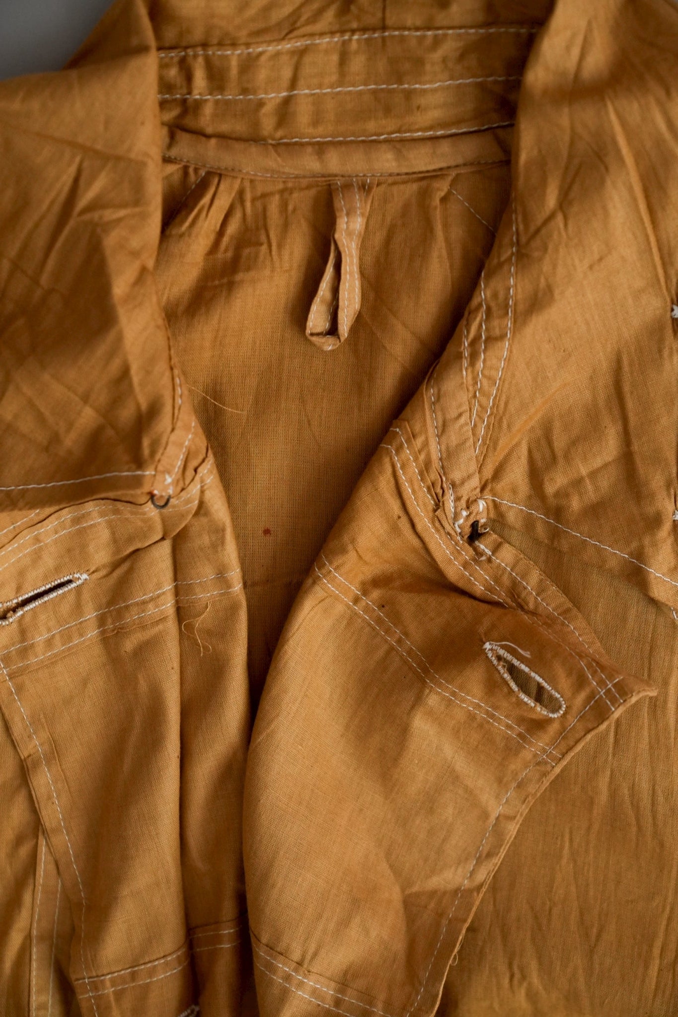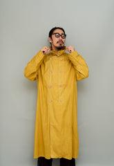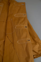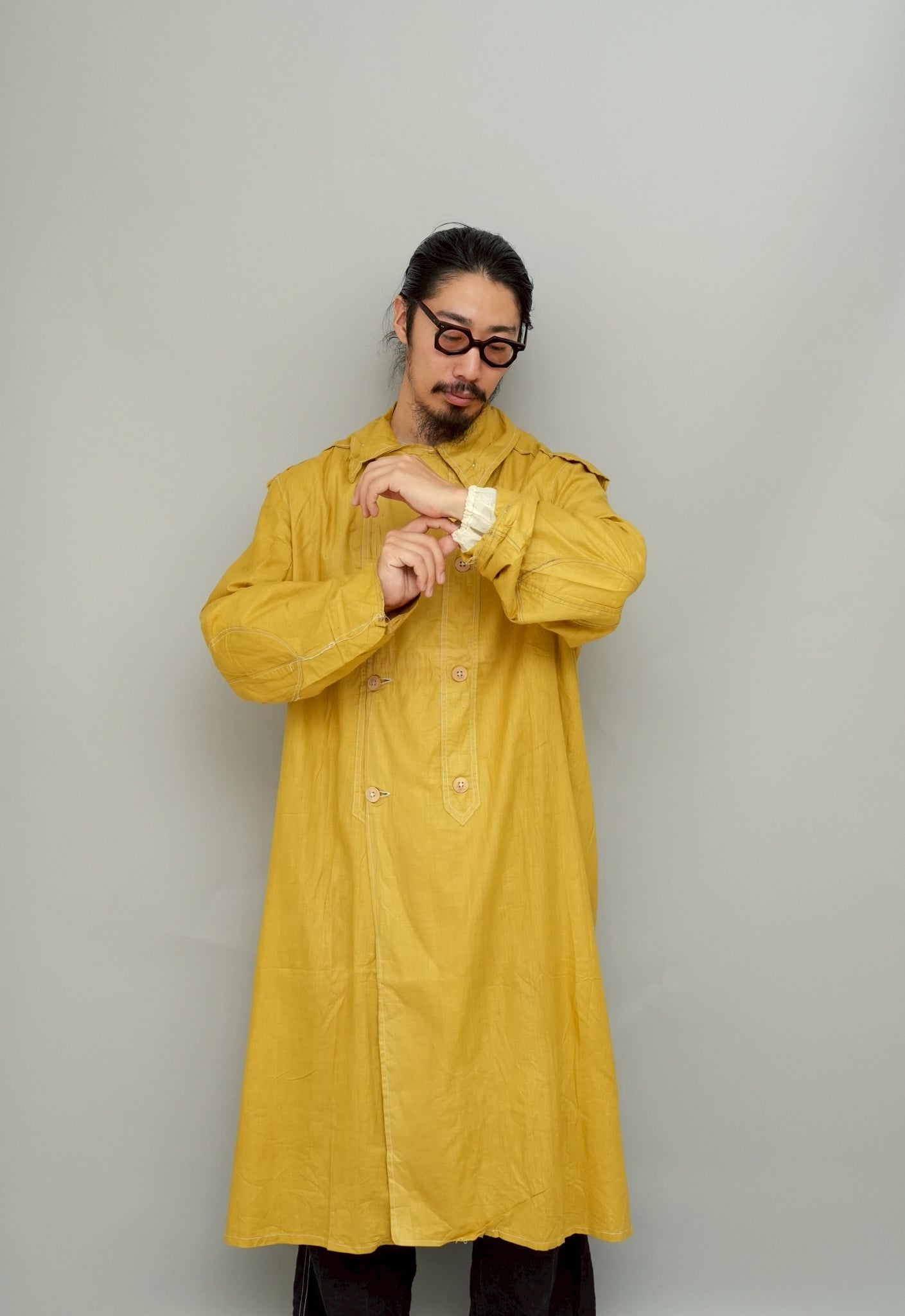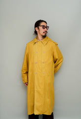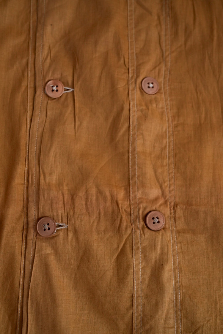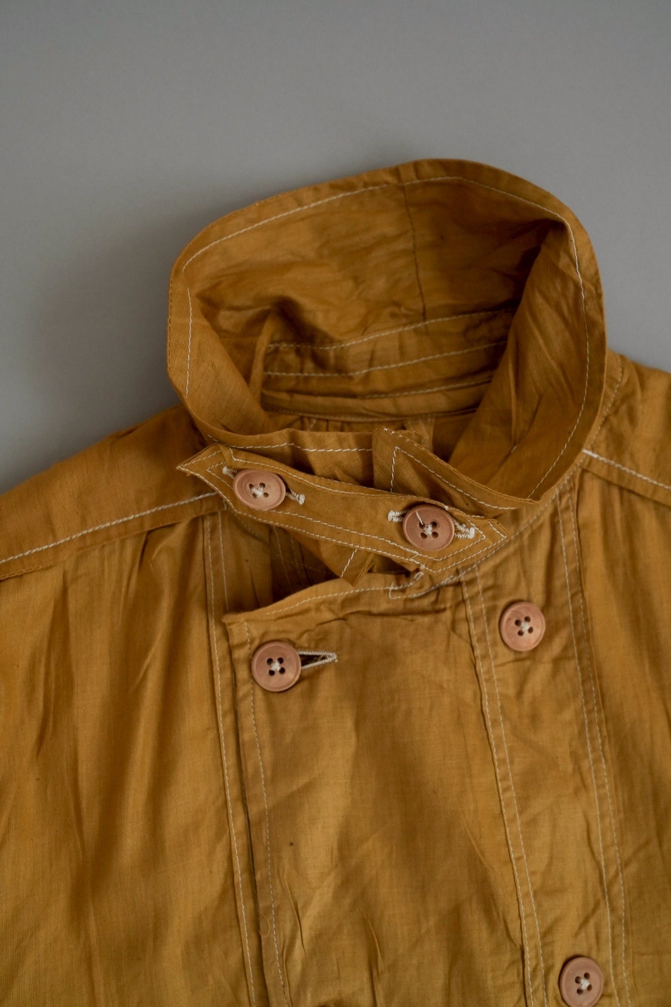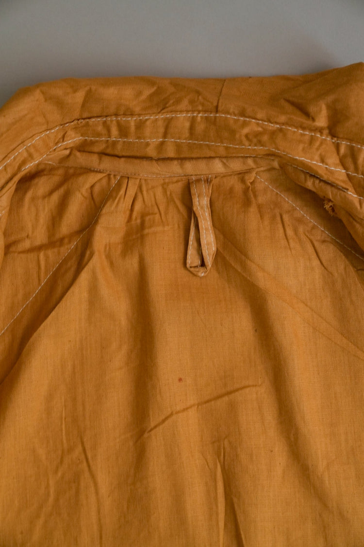 このダスターコートは、コットンとリネンを混紡した生地で仕立てられています。リネン特有のハリと通気性に、コットンの柔らかさが加わったテクスチャーは、長い時を経てもなお健在。しなやかで軽やかな着心地はもちろん、表面に浮かぶ微かな光沢が100年前の服飾文化を静かに物語ります。色合いは鮮やかでありながら深みのあるマスタードイエロー。大地や収穫を連想させるトーンは、実用服でありながらもどこか温かみと洗練を兼ね備えています。