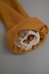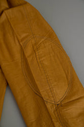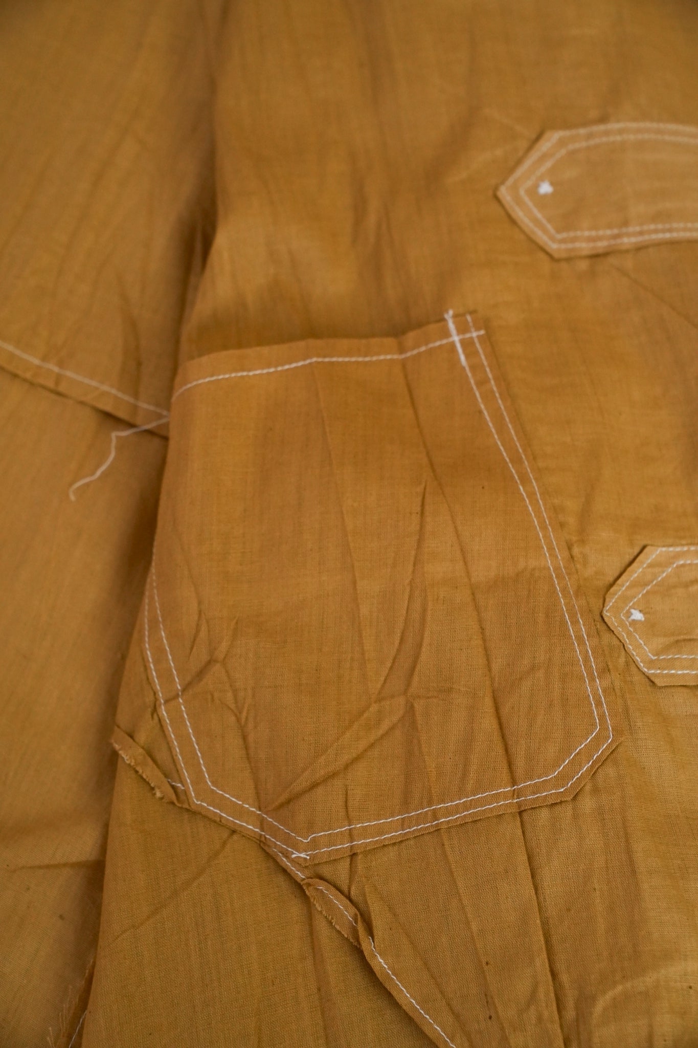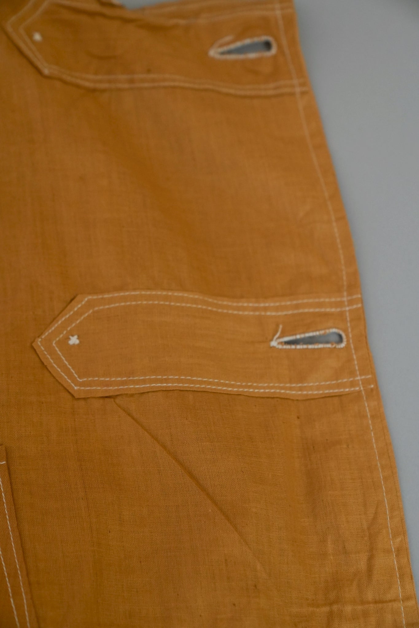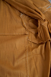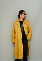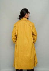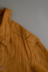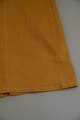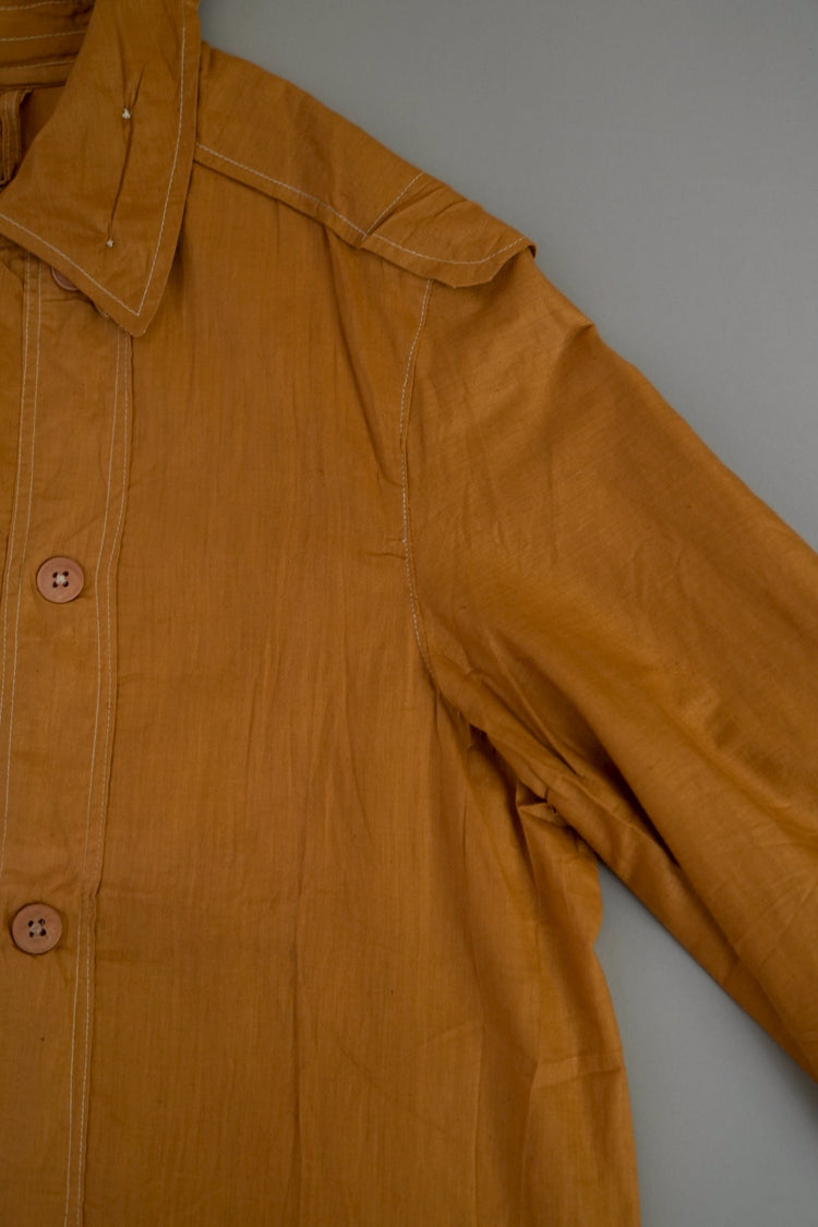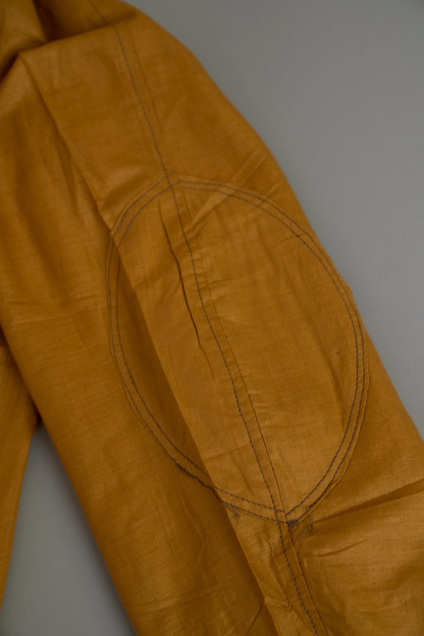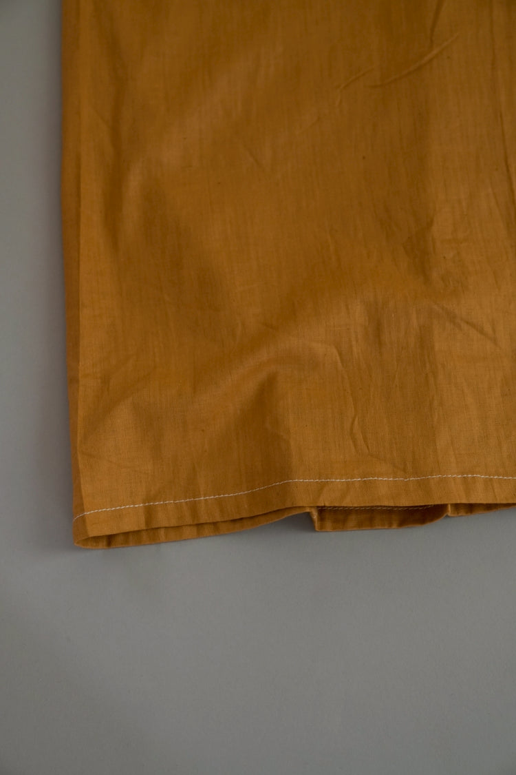 このダスターコートは、コットンとリネンを混紡した生地で仕立てられています。リネン特有のハリと通気性に、コットンの柔らかさが加わったテクスチャーは、長い時を経てもなお健在。しなやかで軽やかな着心地はもちろん、表面に浮かぶ微かな光沢が100年前の服飾文化を静かに物語ります。色合いは鮮やかでありながら深みのあるマスタードイエロー。大地や収穫を連想させるトーンは、実用服でありながらもどこか温かみと洗練を兼ね備えています。
