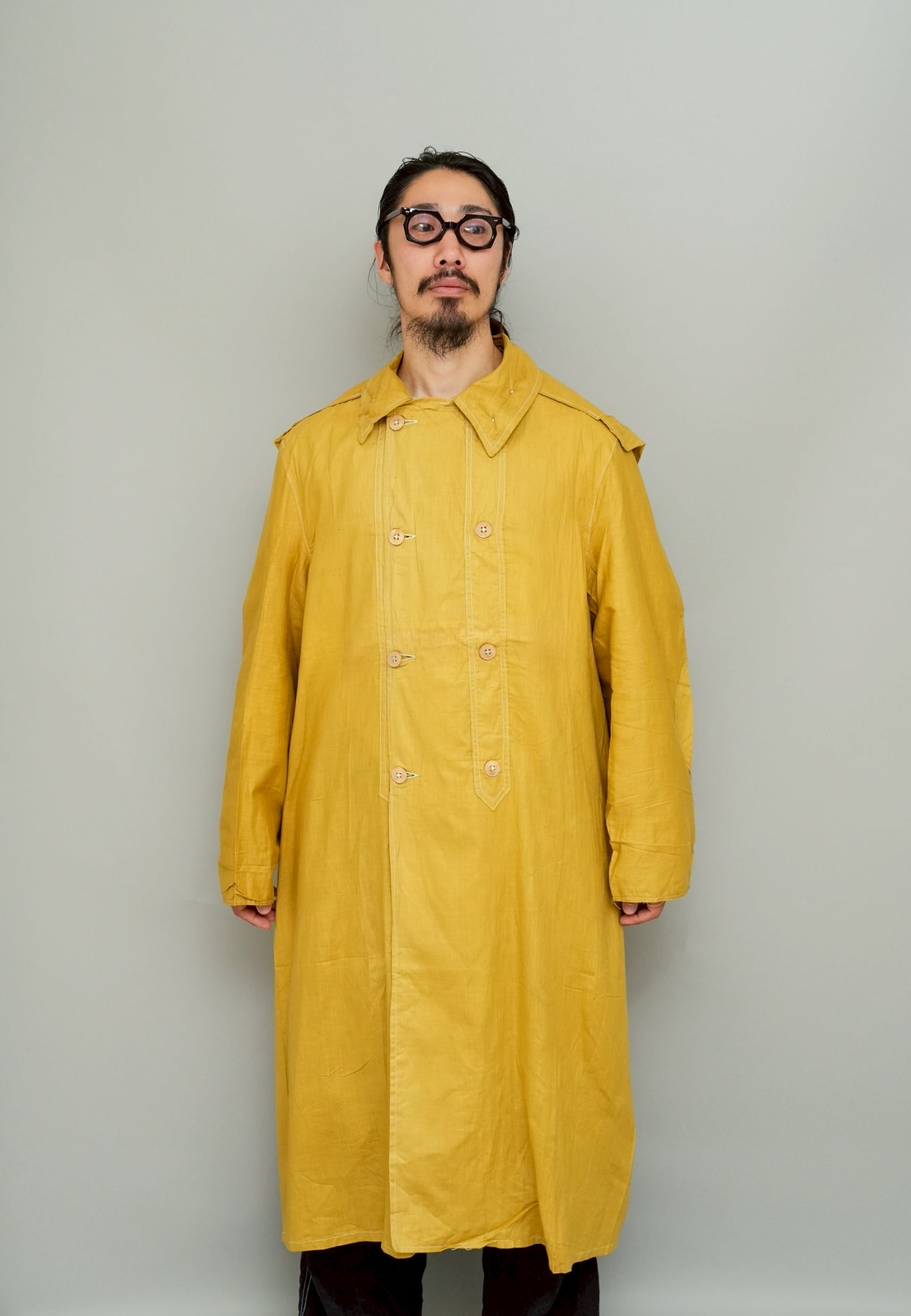 総じて、この1910〜1920年代のフレンチ・ダスターコートは、単なる古着ではなく「歴史を纏う衣服」であり、同時に資料的価値を持つアーカイブピースです。自動車社会の黎明期、埃舞う街道を疾走する人々の生活を守ったこのコートは、100年の時を超え、今再び私たちの手に届きました。その存在は、当時の産業・文化・美意識を凝縮した証であり、まさに「着ることのできる歴史資料」と言えるでしょう。