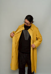 デザインの要点は、クラシカルなダブルブレストの前合わせと、襟元に備えられたチンストラップ。これは風や埃の侵入を防ぐための実用的なディテールであり、同時代のワークウェアやミリタリーコートにも通じる機能性を示しています。ゆったりと広がるシルエットは、当時スーツやドレスの上から羽織ることを前提として設計されており、現代においてはオーバーサイズのアウターとして抜群の存在感を放ちます。袖や肩のカッティングにも独特の立体感があり、機能性だけでなく造形美としての完成度も際立っています。