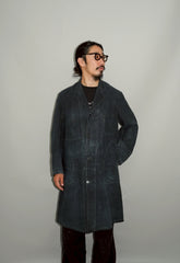 1930〜40年代に製造された、フランスの老舗ワークウェアブランド「AU MOLINEL」によるインディゴリネン製マキニョンコート。農村や市場で家畜の仲介人として働いていた「マキニョン(Maquignon)」が着用した作業着の一種であり、その中でも特に珍しいコートタイプの仕様となっています。通常のマキニョンはスモック状のプルオーバーが一般的で、前開きのロングコート型は極めて希少な存在です。