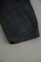 素材にはインディゴ染めのリネンを用いています。フレンチワークのリネンは使い込まれることで柔らかさを増し、独特の深みある色合いを見せますが、本品はまだ色が濃く残っており、強い褪色や荒れた色落ちは見られません。むしろインディゴ特有の奥行きと深さをたたえ、光の加減によって豊かな表情を見せるコンディションが保たれています。今日、このような色残りの良い状態で現存すること自体が非常に稀と言えるでしょう。
