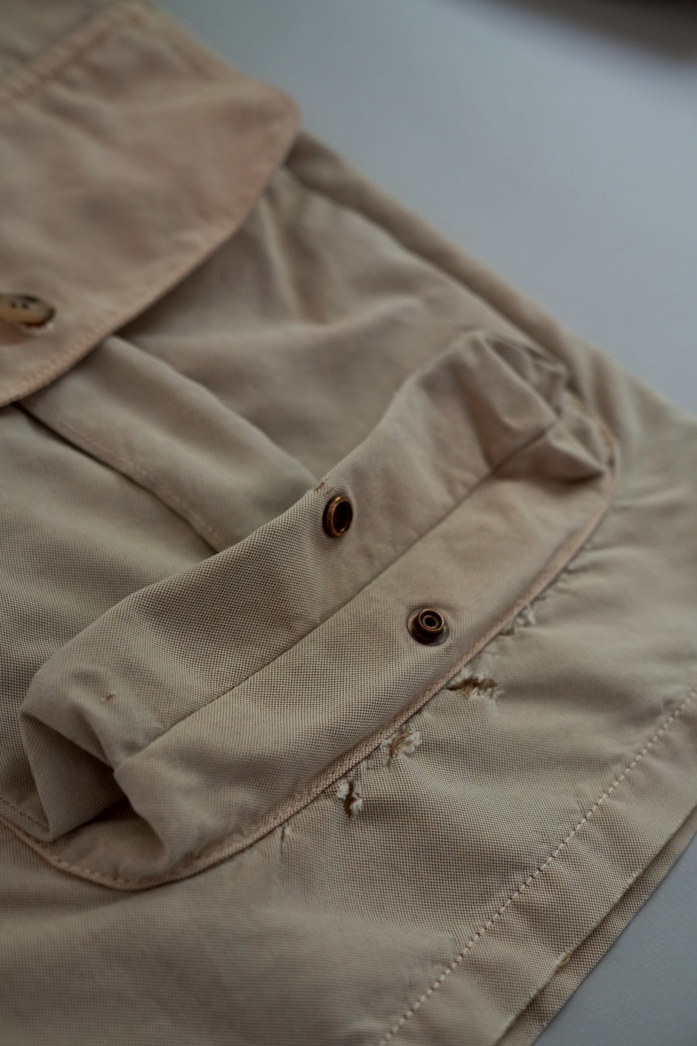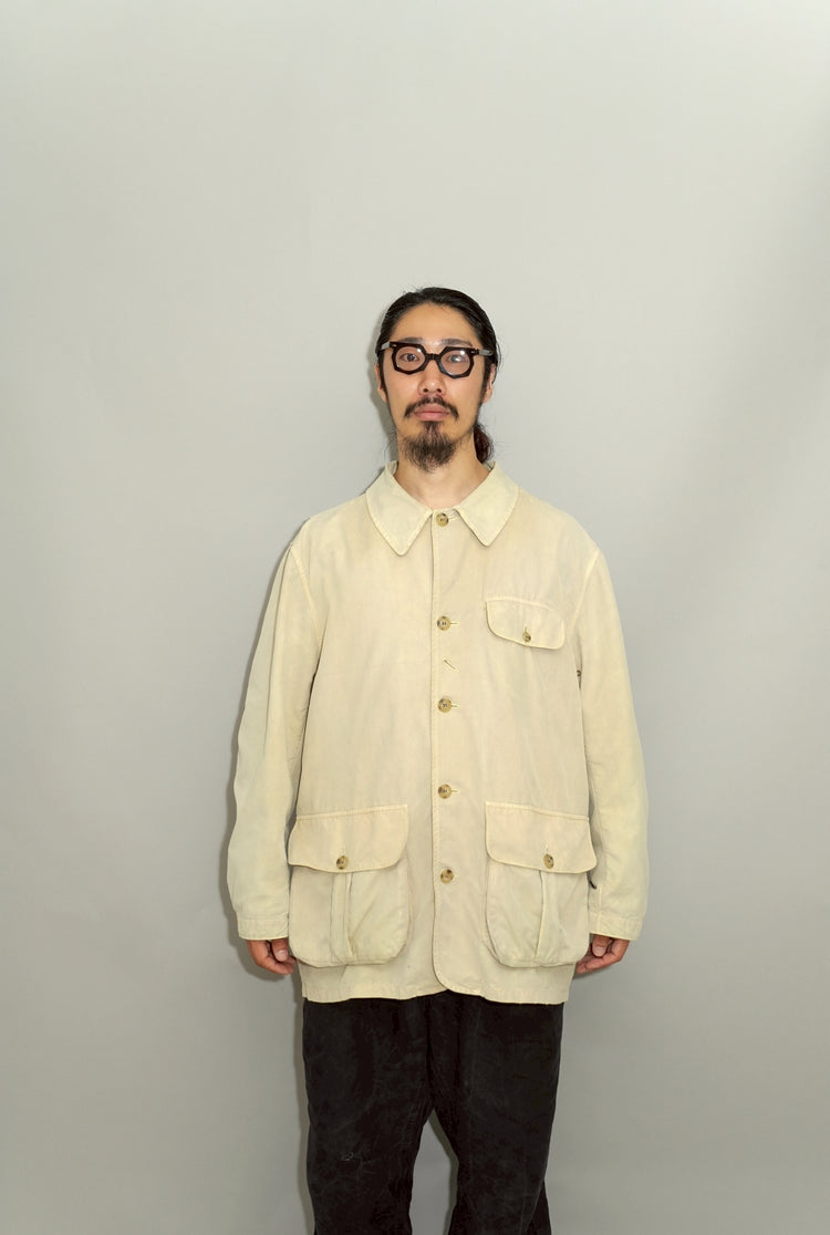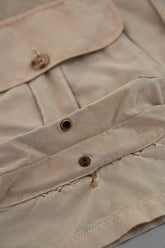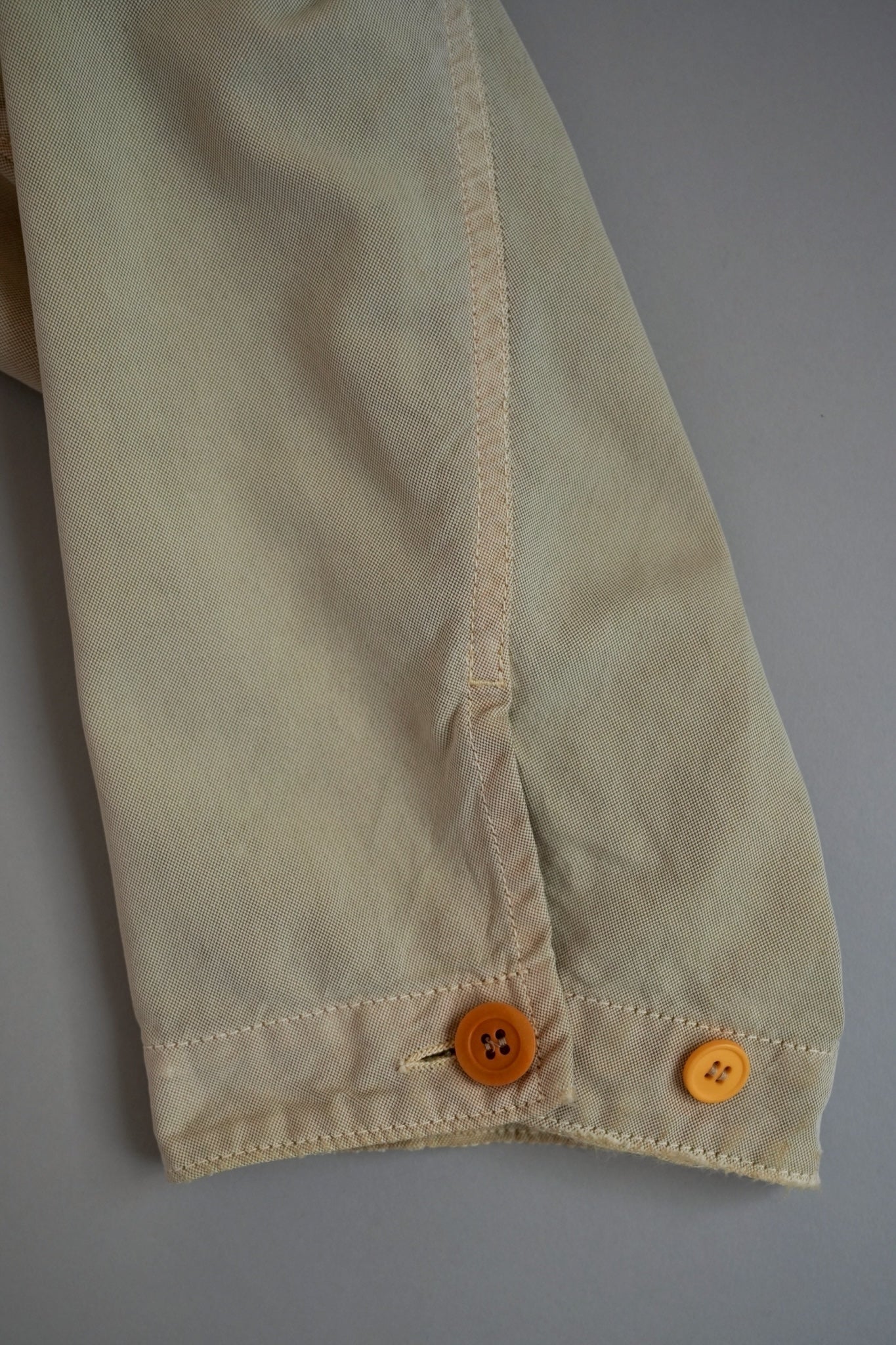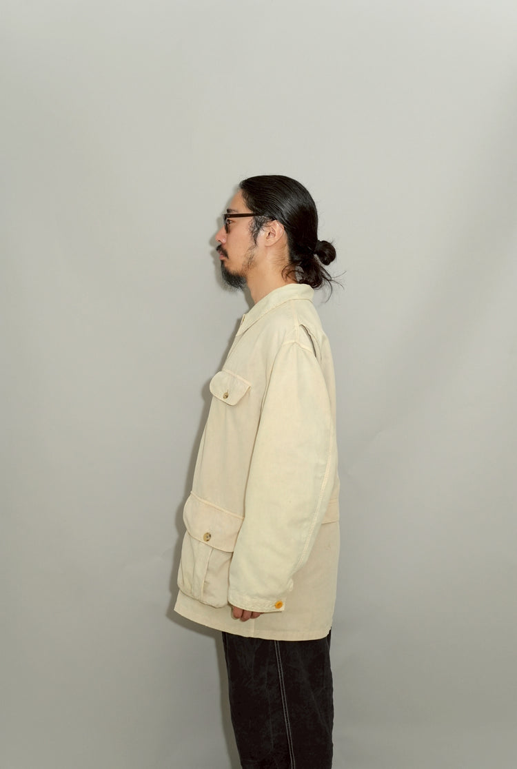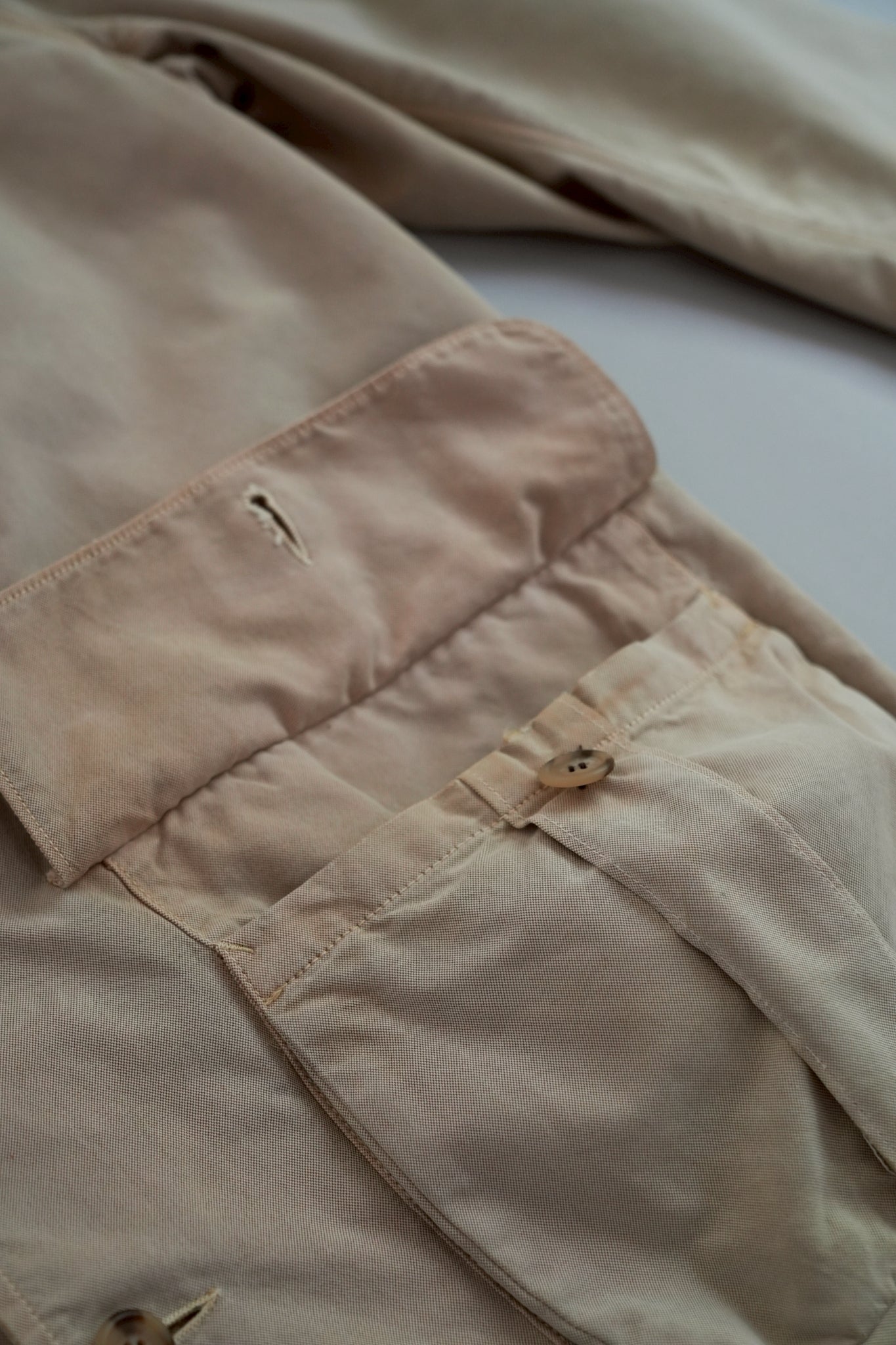 カラーは淡いベージュ。これはフィールドジャケットやハンティングウェアにルーツを持つトーンですが、オスティの手にかかることで土臭さが抑えられ、むしろ洗練された都会的なニュアンスを帯びています。光の加減によって柔らかな陰影を見せるこの色調は、経年変化によってさらに深みを増し、ヴィンテージとしての魅力を強めていきます。現存する個体の多くは色褪せやダメージが見られる中、本品はコンディションも抜群に良好で、当時の雰囲気をそのまま纏うことができる点も大きな価値の一つです。