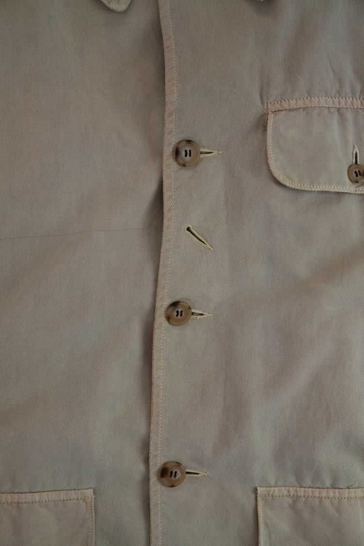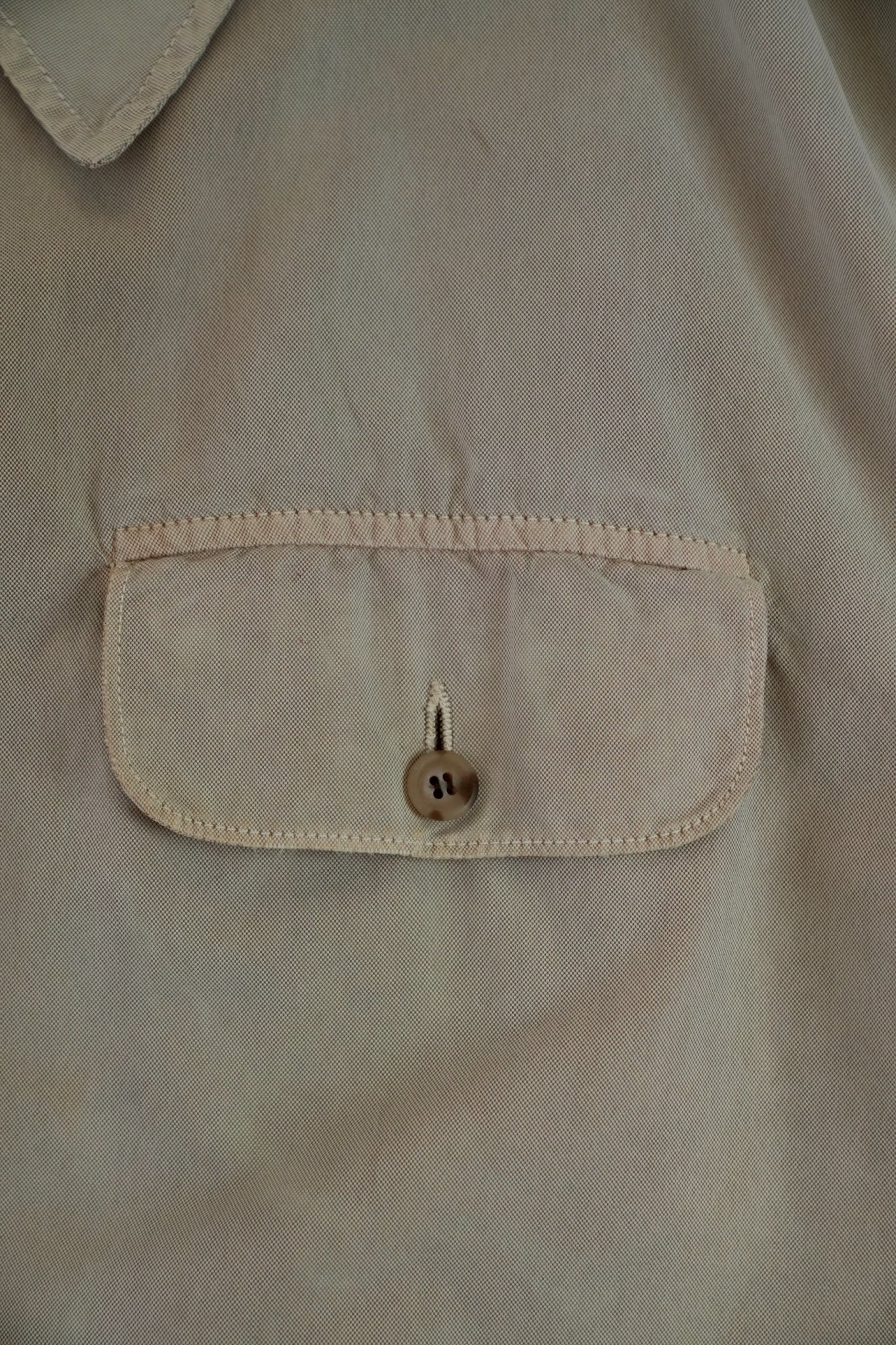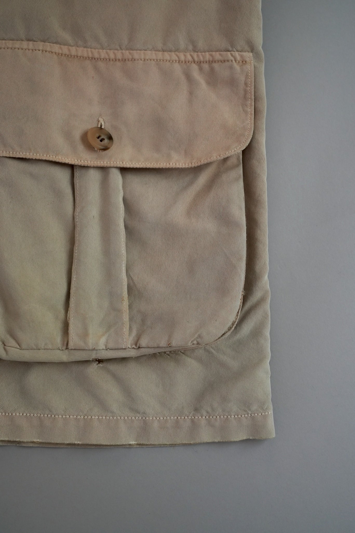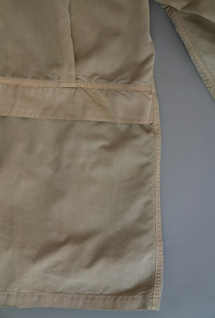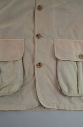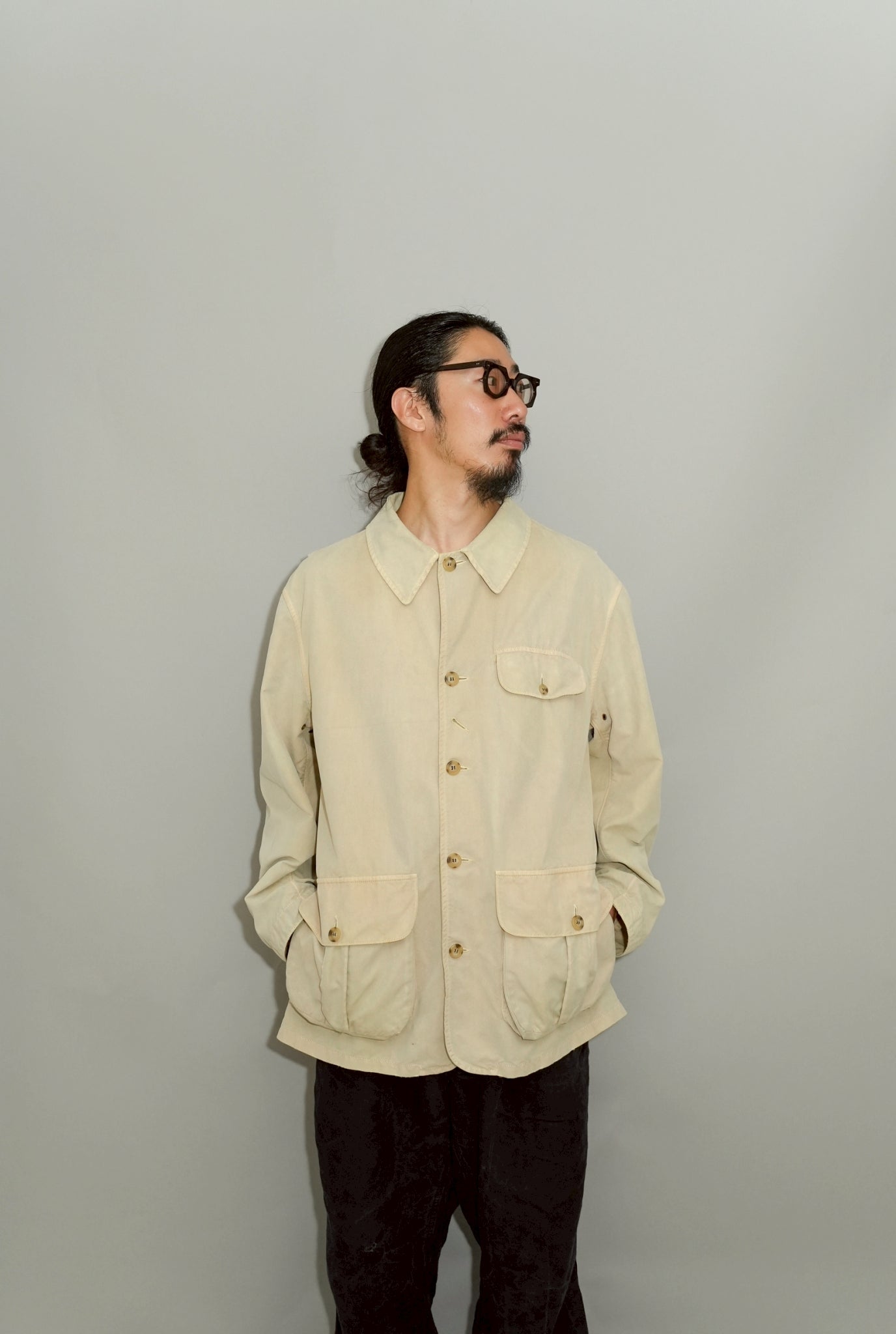 カラーは淡いベージュ。これはフィールドジャケットやハンティングウェアにルーツを持つトーンですが、オスティの手にかかることで土臭さが抑えられ、むしろ洗練された都会的なニュアンスを帯びています。光の加減によって柔らかな陰影を見せるこの色調は、経年変化によってさらに深みを増し、ヴィンテージとしての魅力を強めていきます。現存する個体の多くは色褪せやダメージが見られる中、本品はコンディションも抜群に良好で、当時の雰囲気をそのまま纏うことができる点も大きな価値の一つです。