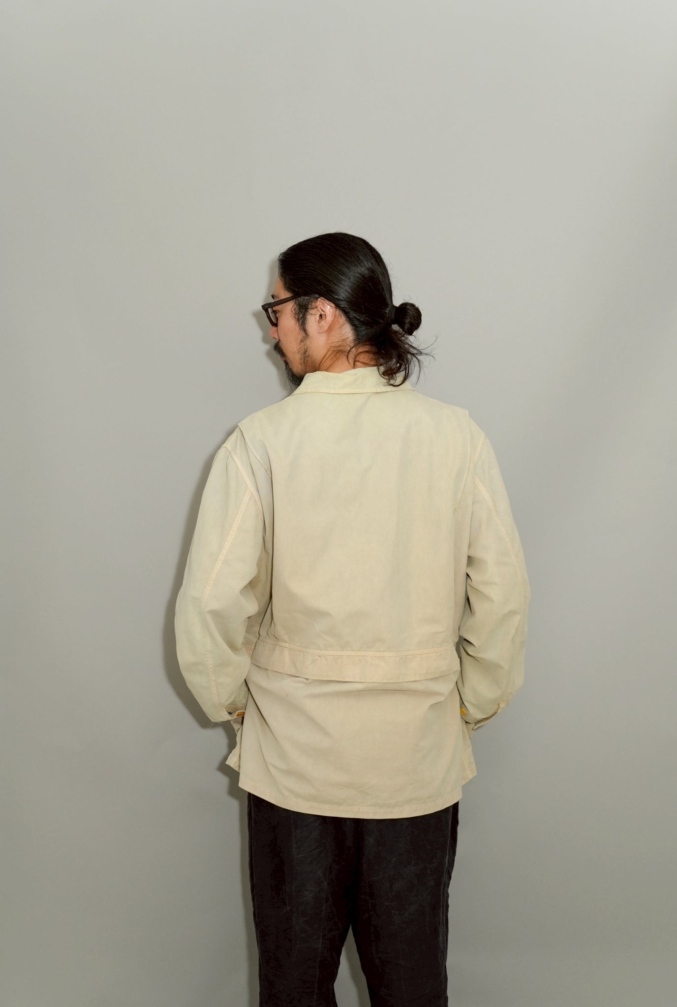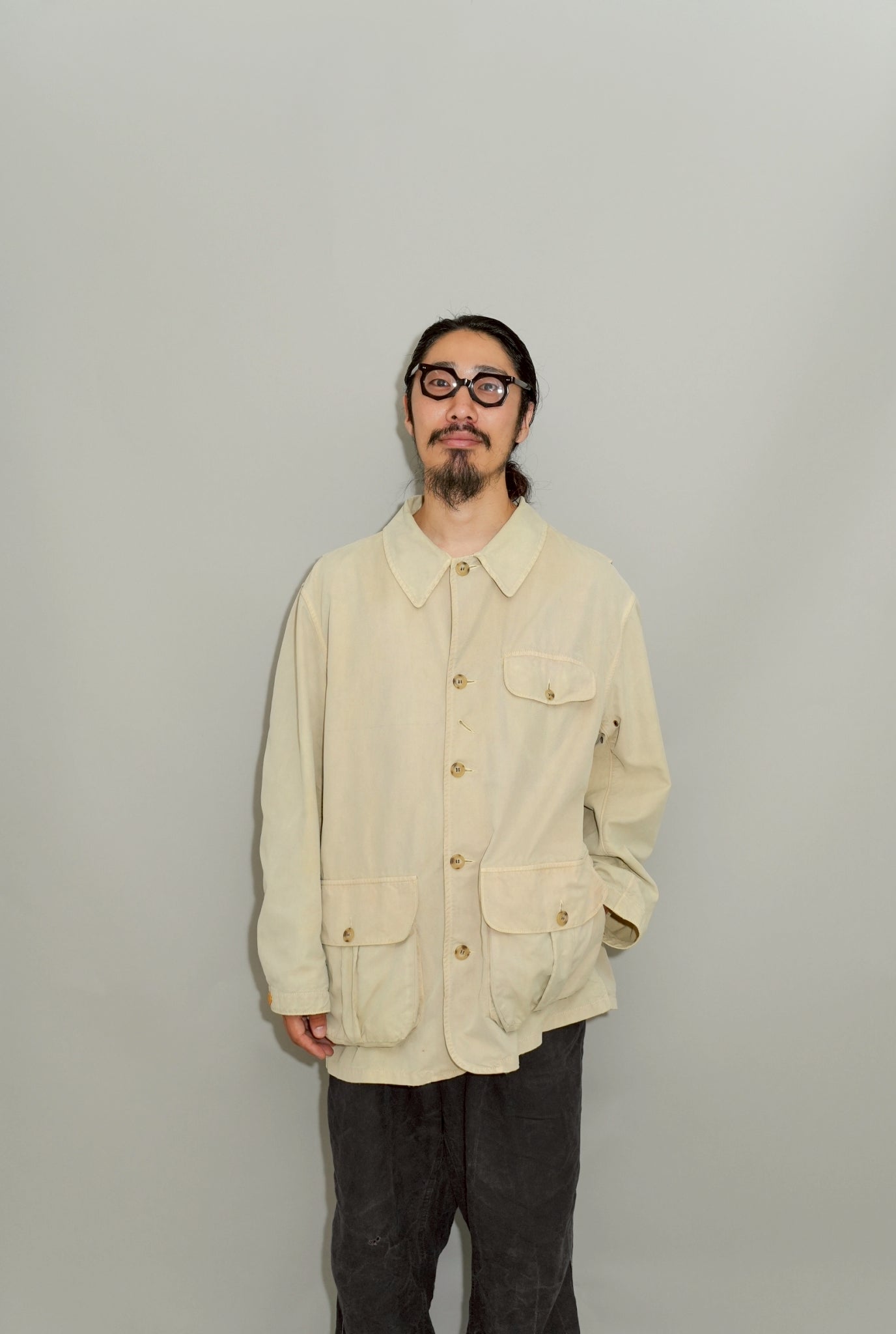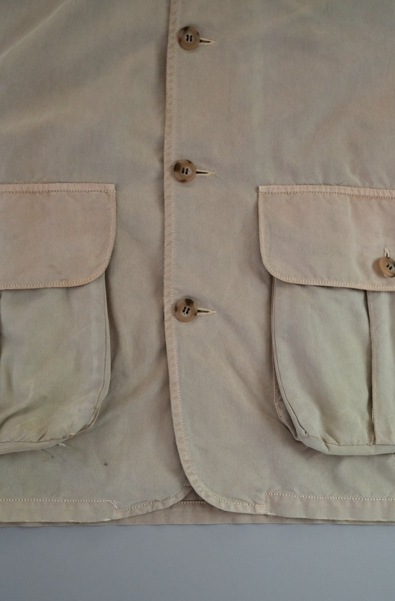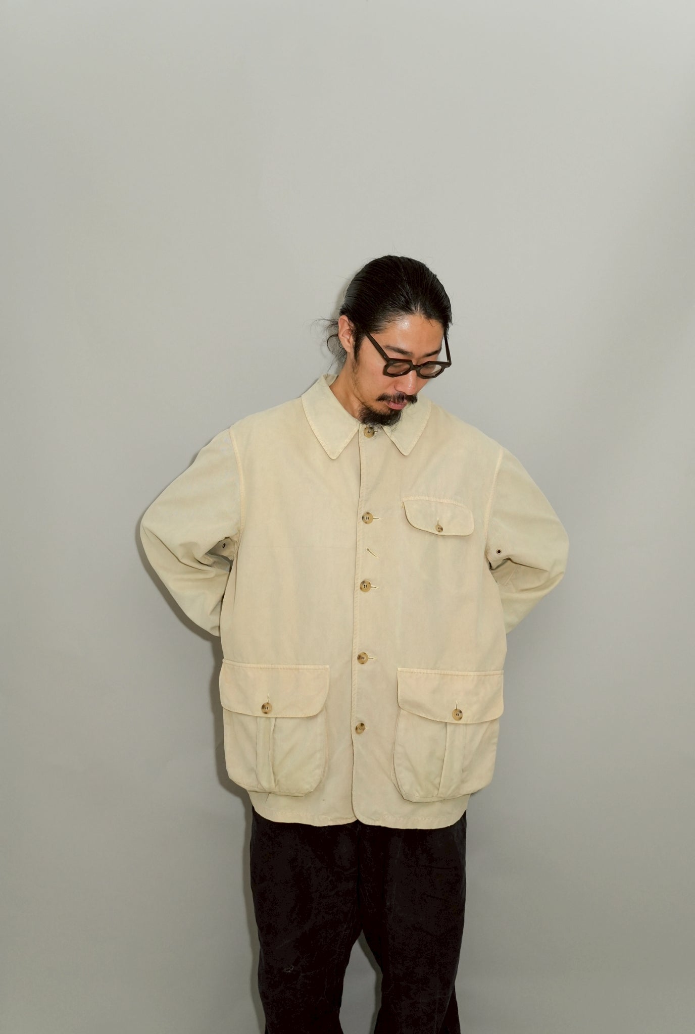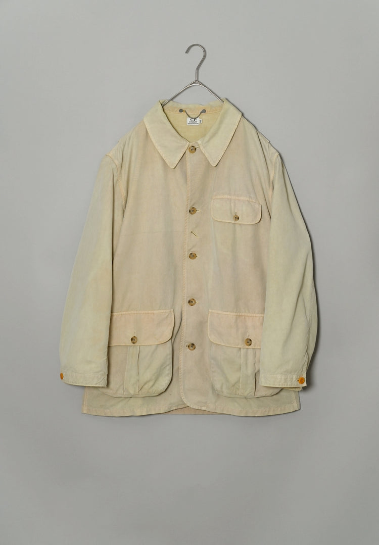 カラーは淡いベージュ。これはフィールドジャケットやハンティングウェアにルーツを持つトーンですが、オスティの手にかかることで土臭さが抑えられ、むしろ洗練された都会的なニュアンスを帯びています。光の加減によって柔らかな陰影を見せるこの色調は、経年変化によってさらに深みを増し、ヴィンテージとしての魅力を強めていきます。現存する個体の多くは色褪せやダメージが見られる中、本品はコンディションも抜群に良好で、当時の雰囲気をそのまま纏うことができる点も大きな価値の一つです。