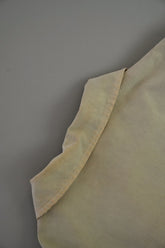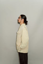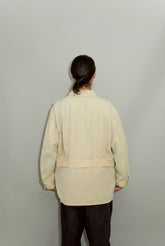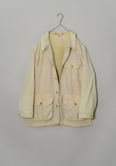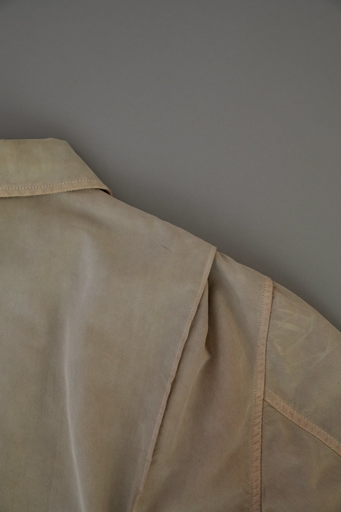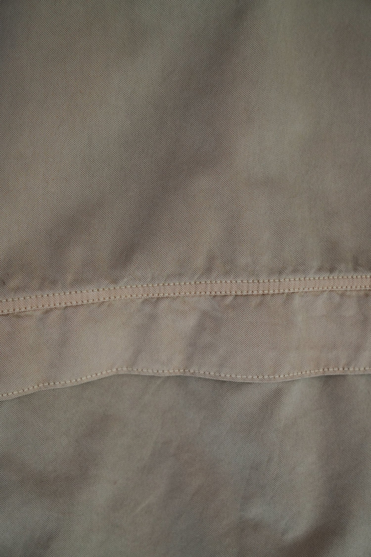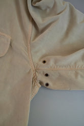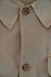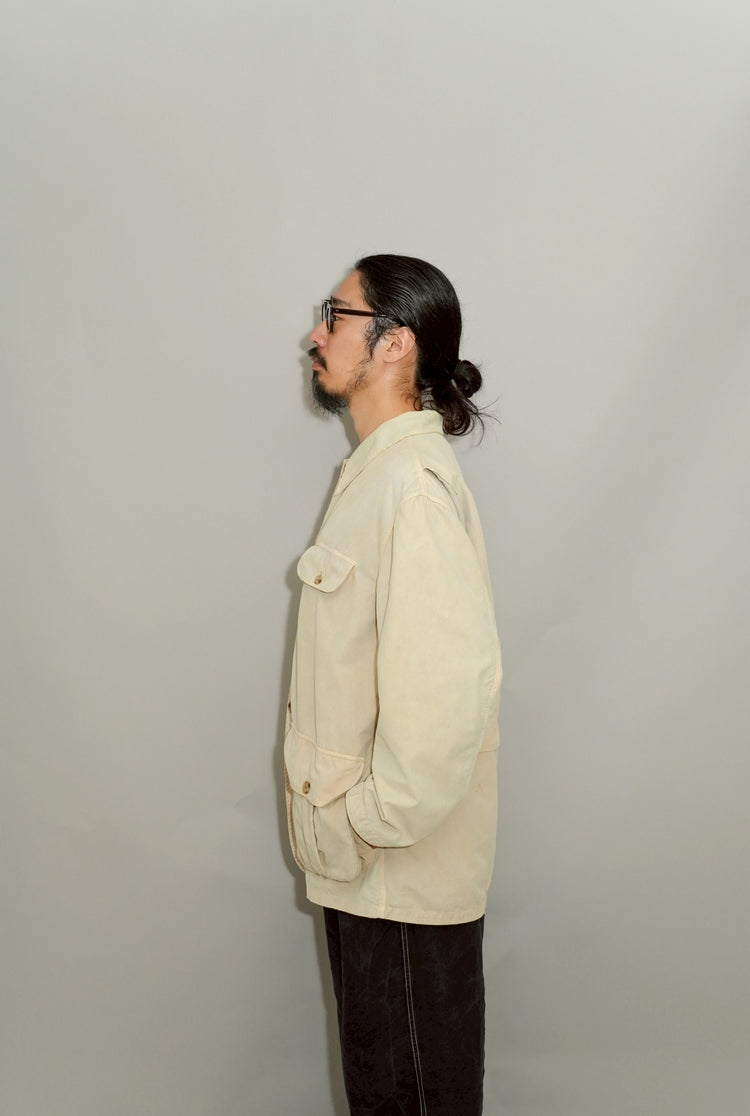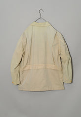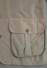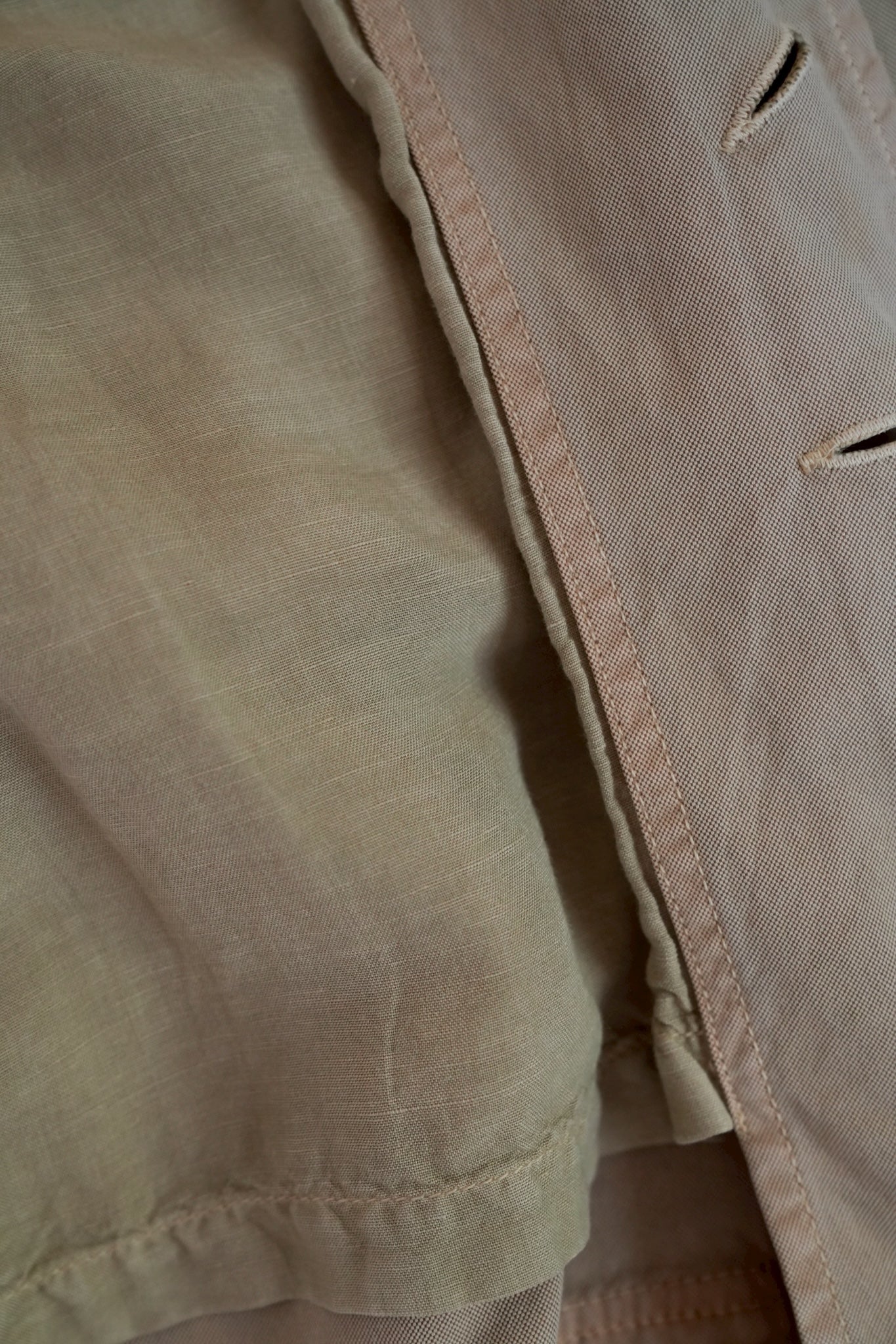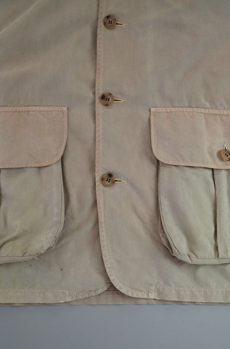 カラーは淡いベージュ。これはフィールドジャケットやハンティングウェアにルーツを持つトーンですが、オスティの手にかかることで土臭さが抑えられ、むしろ洗練された都会的なニュアンスを帯びています。光の加減によって柔らかな陰影を見せるこの色調は、経年変化によってさらに深みを増し、ヴィンテージとしての魅力を強めていきます。現存する個体の多くは色褪せやダメージが見られる中、本品はコンディションも抜群に良好で、当時の雰囲気をそのまま纏うことができる点も大きな価値の一つです。