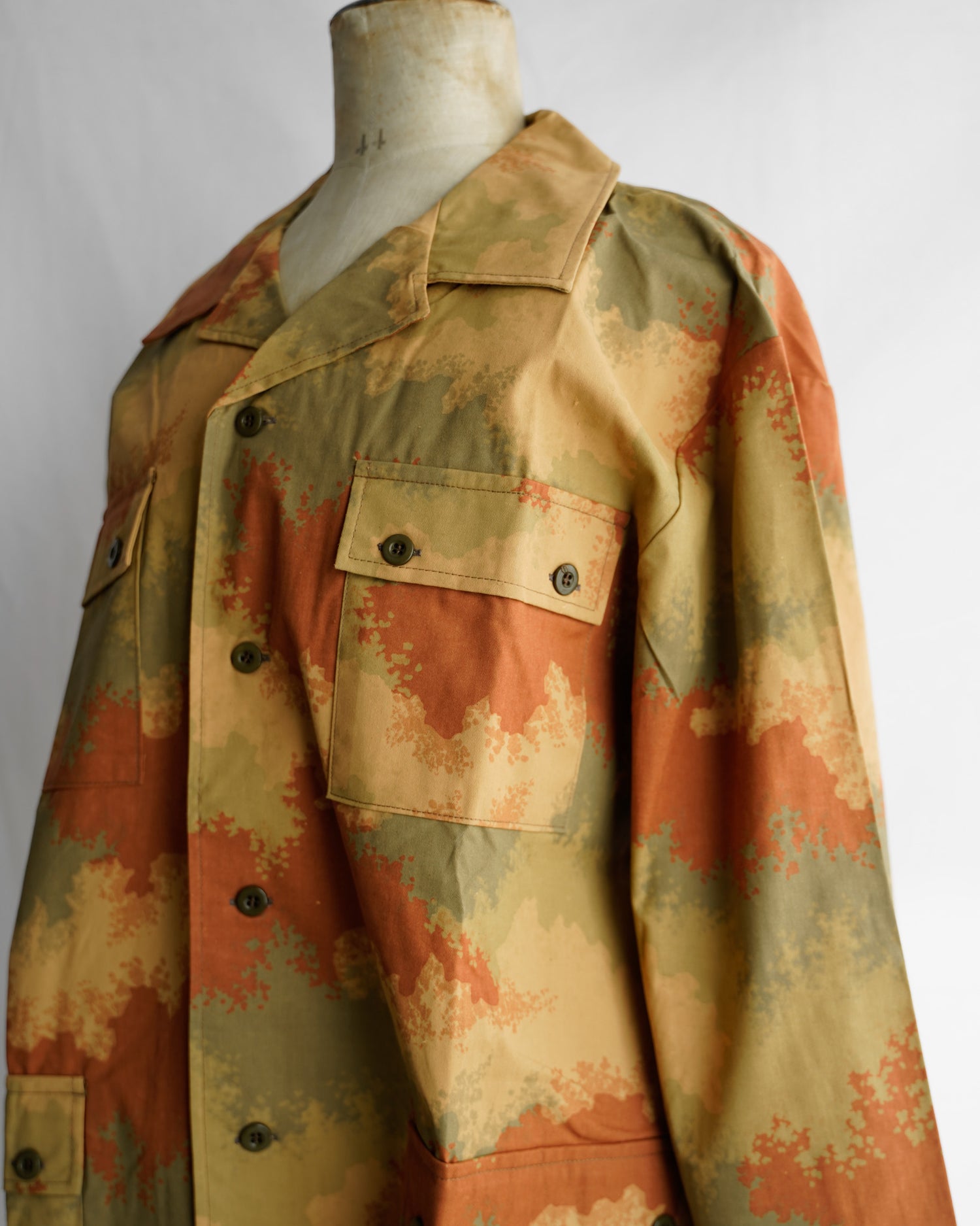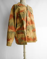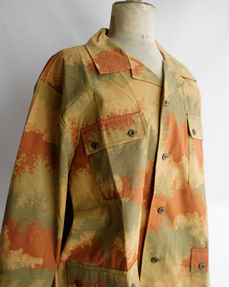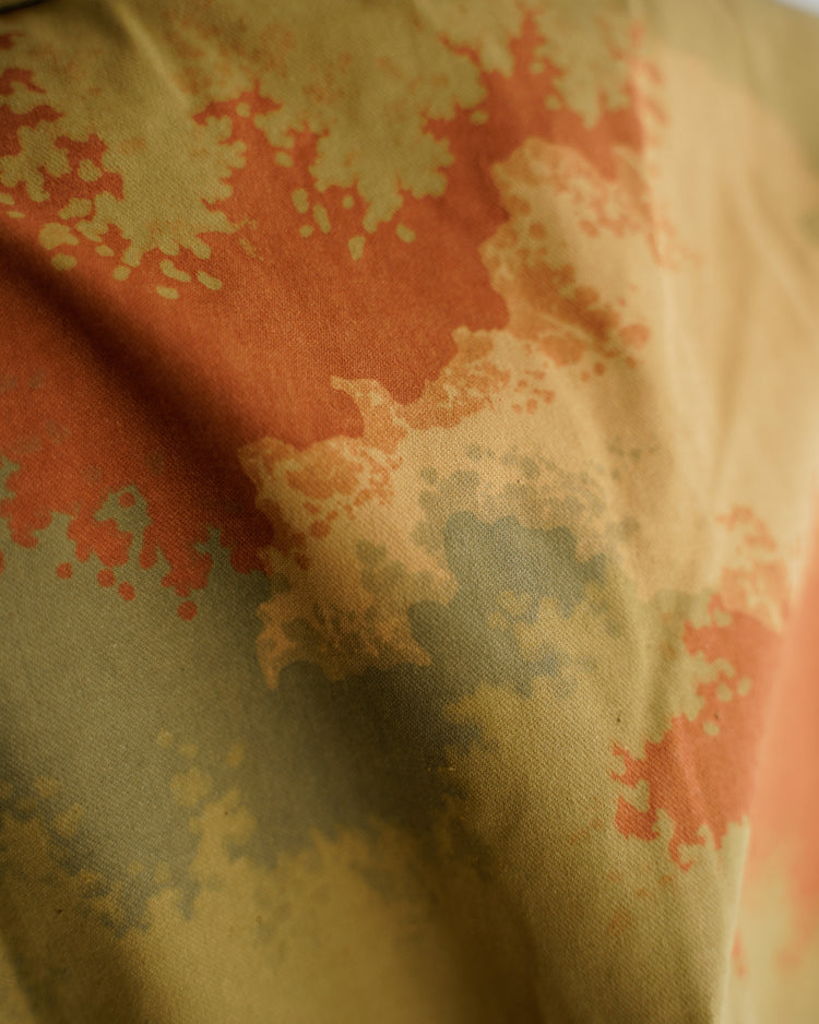 通称 : EXPERIMENTAL DESERT CAMO(エクスペリメンタルデザートカモ)と呼ばれる、5色からなるまるでスプレーで描かれたような、独特の色合いのデザートカモパターンになっており、通年使用可能なコットン素材に落とし込まれております。実質1990年〜91年の一年間のみ製作された、いわゆるテストサンプルのカモ柄です。