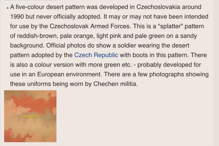 こちらはチェコスロバキア共和国時代の、チェコスロバキア人民解放軍(CSLA=Ceskoslovenska Lidov Armada)の兵士達の為に開発された迷彩パターンのライト目なアウターです。