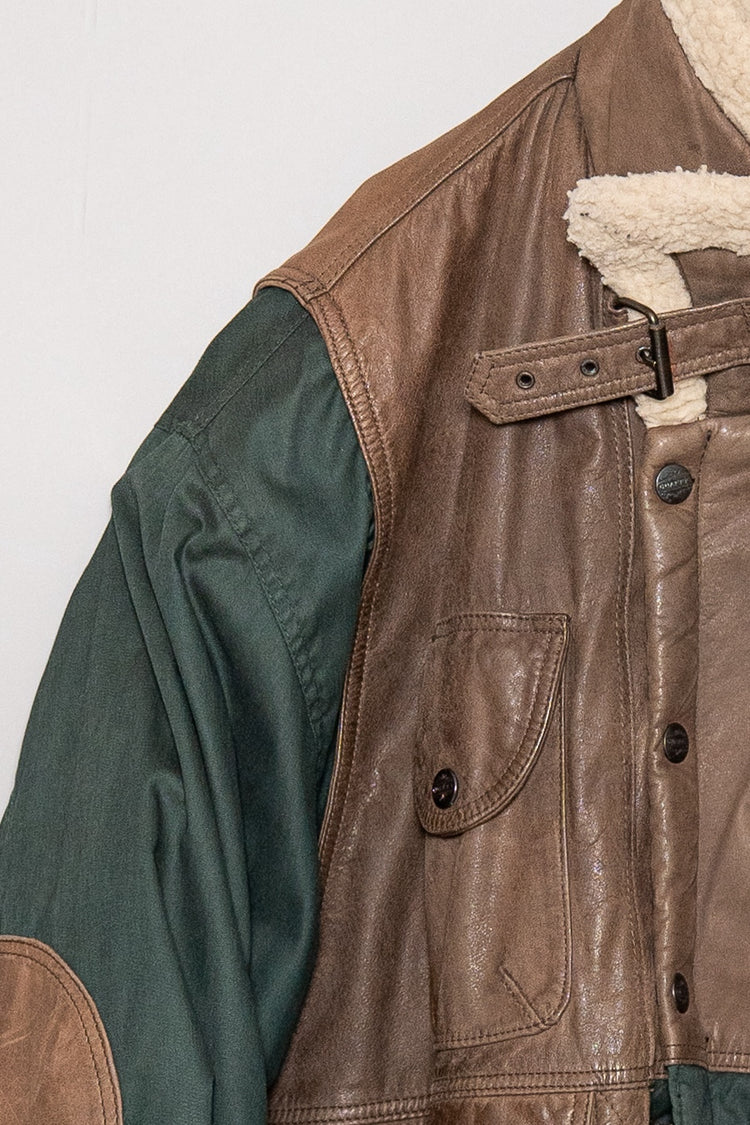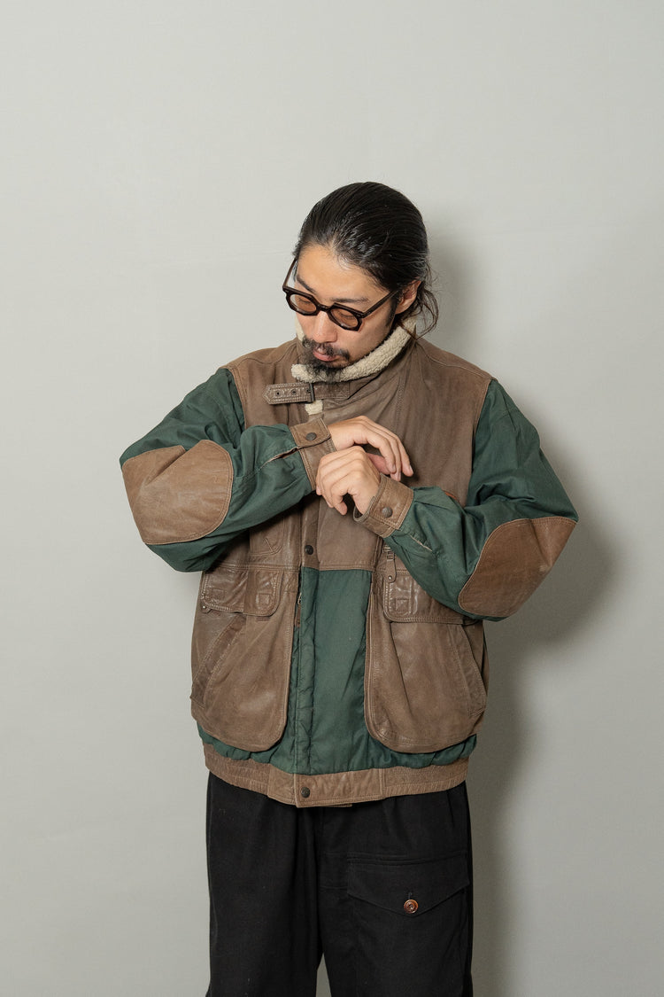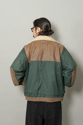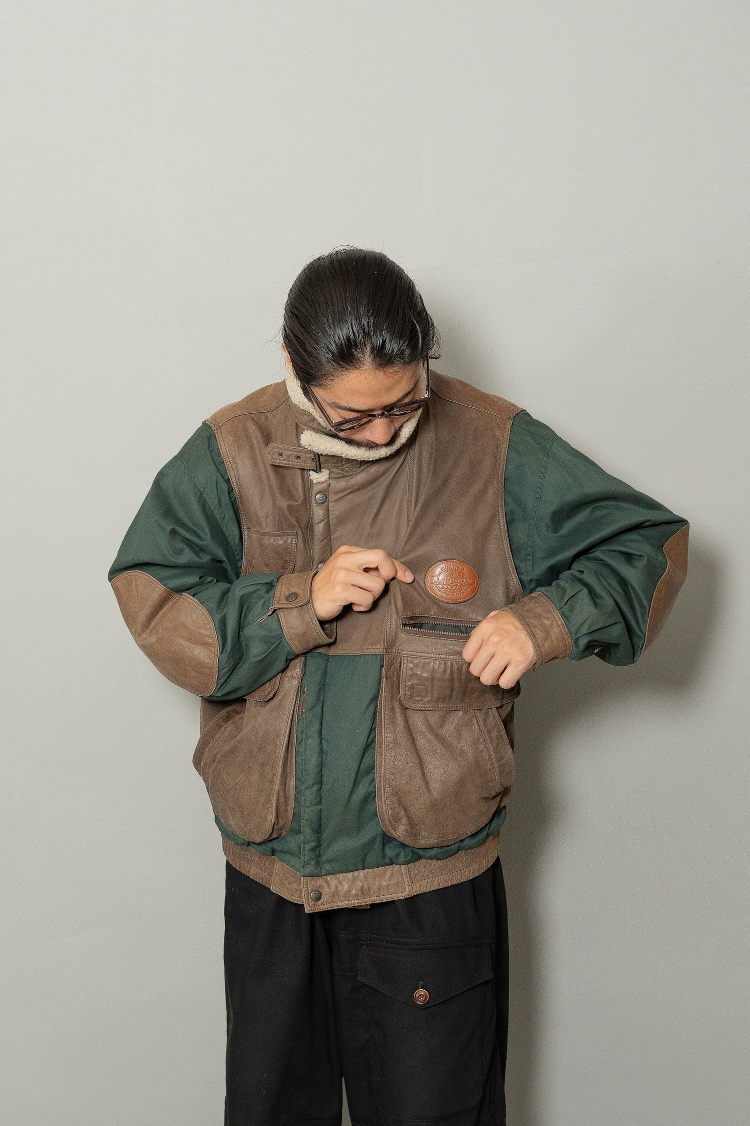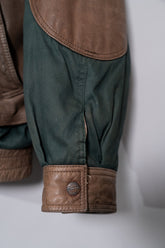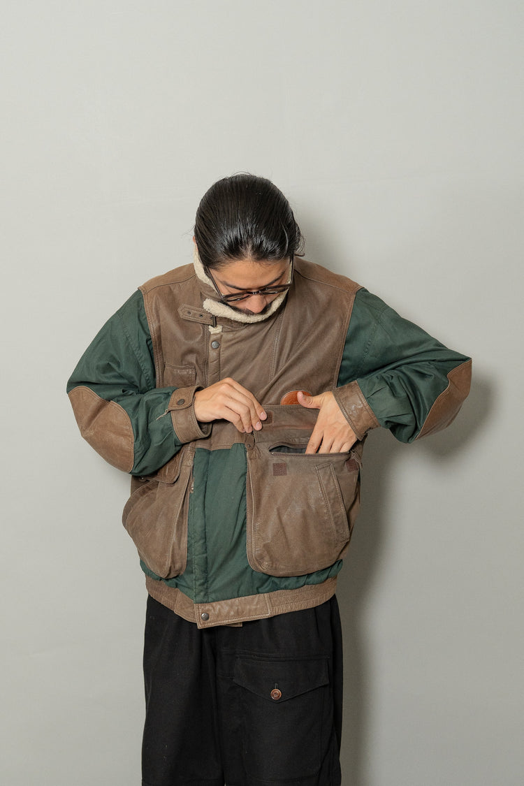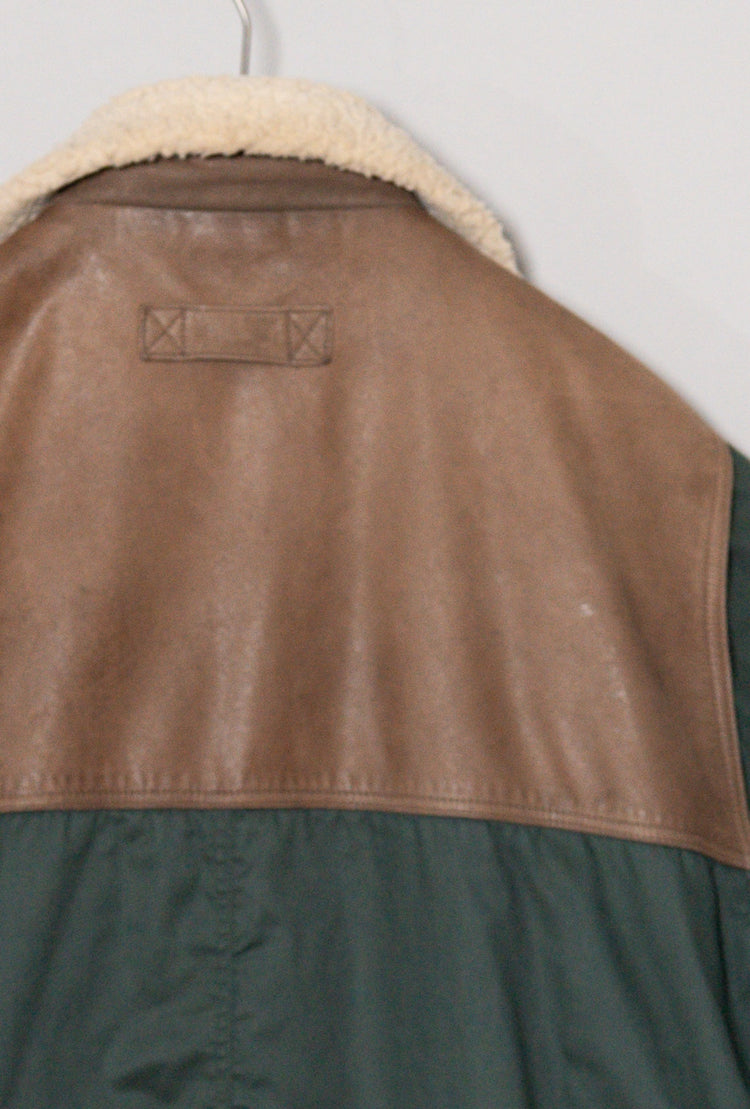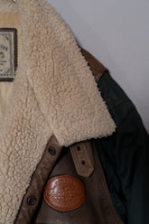 この「Leather & Nylon Boa Flight Jacket」は、その名の通り、フライトジャケットをベースとしながら、素材の切り替えやディテールによってオリジナルな存在感を放っています。まず目を引くのは、ボディ前面に大胆に配されたブラウンのレザーと、袖や背面を覆う深緑のナイロンとの切り替えです。ナイロンの軽快さとレザーの重厚さが共存することで、実用性とラグジュアリー感が同時に表現されています。