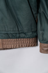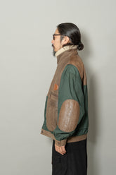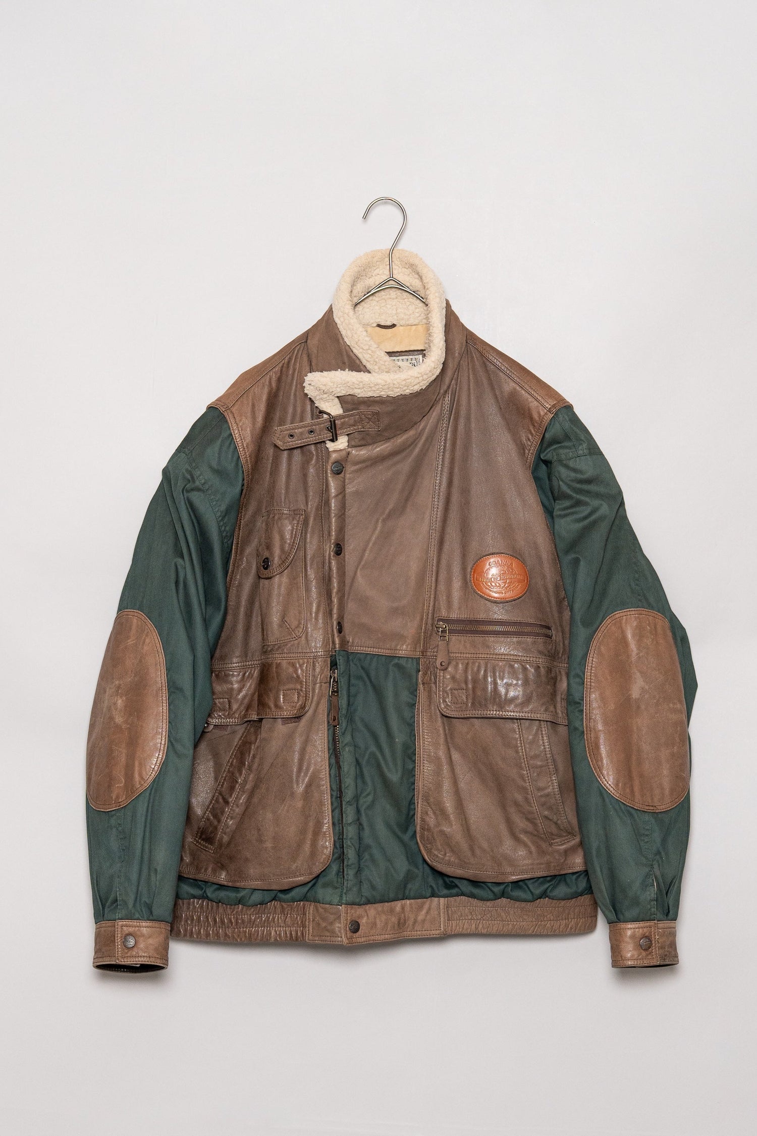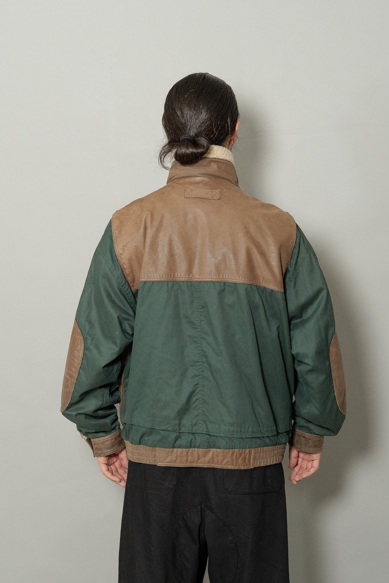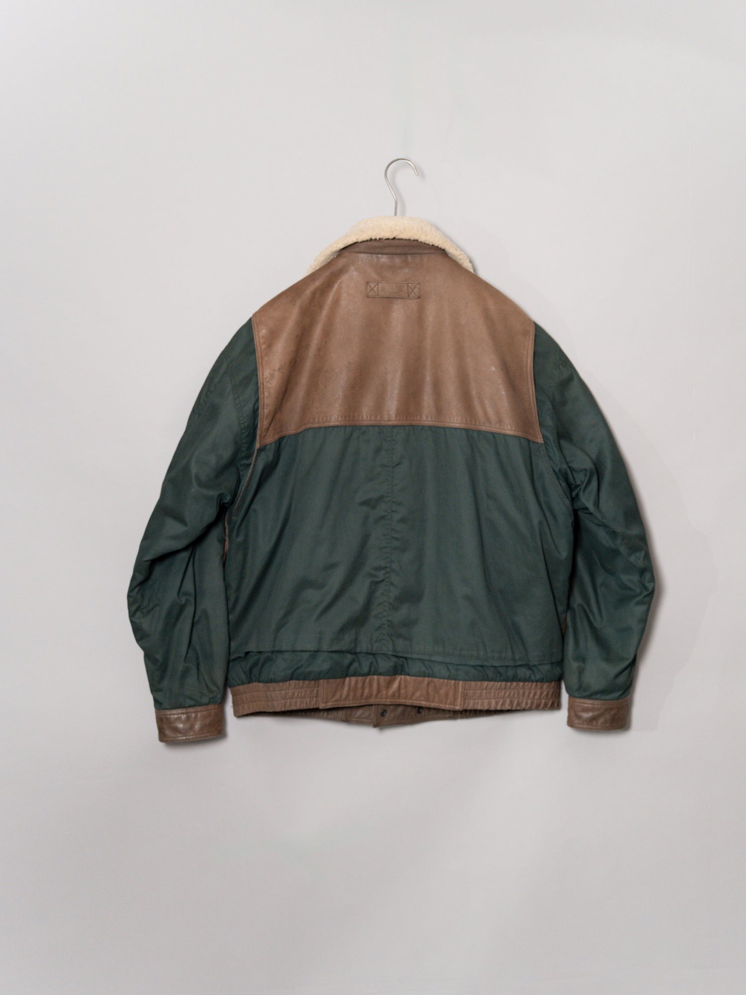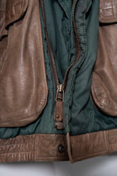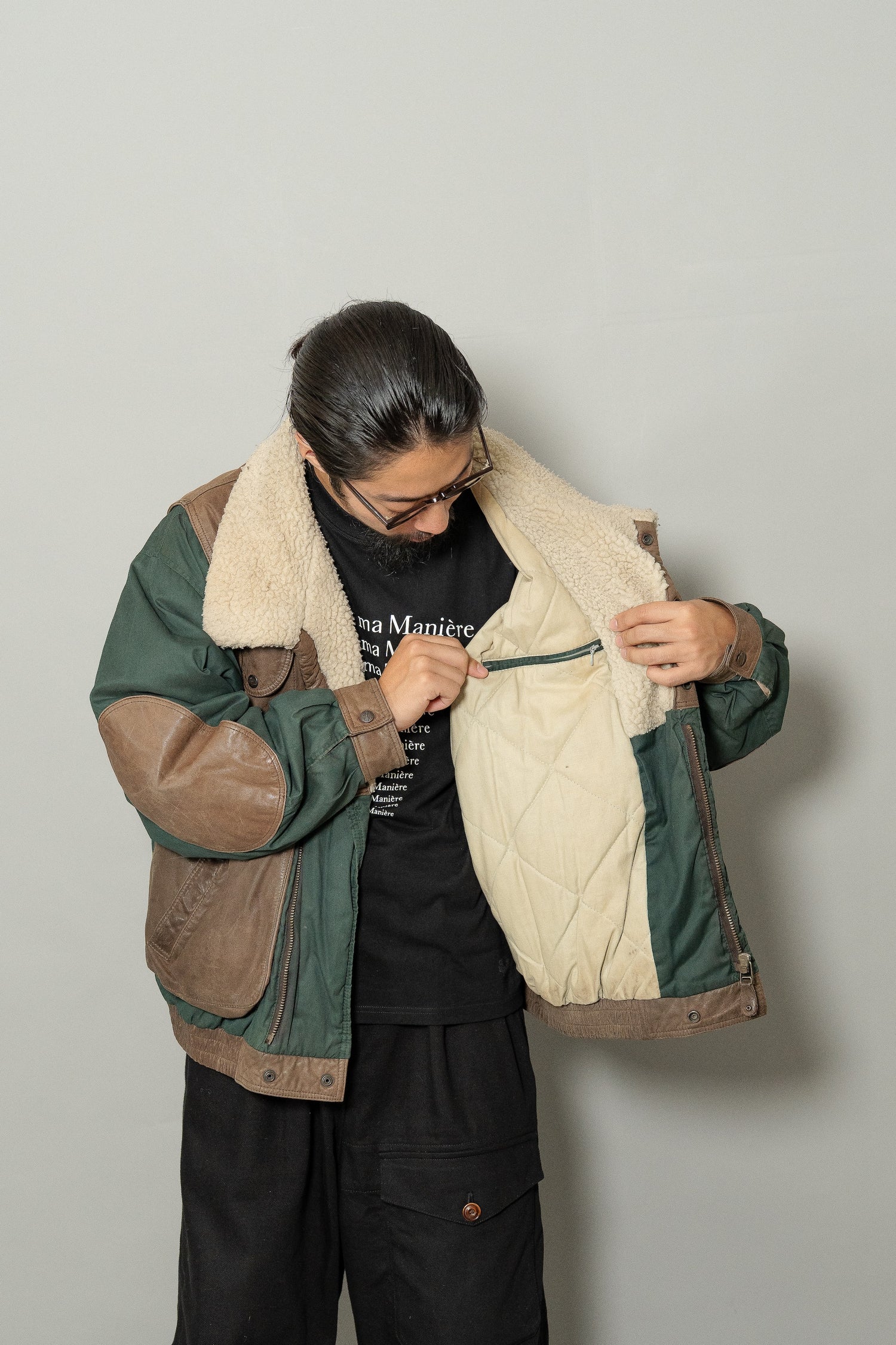 この「Leather & Nylon Boa Flight Jacket」は、その名の通り、フライトジャケットをベースとしながら、素材の切り替えやディテールによってオリジナルな存在感を放っています。まず目を引くのは、ボディ前面に大胆に配されたブラウンのレザーと、袖や背面を覆う深緑のナイロンとの切り替えです。ナイロンの軽快さとレザーの重厚さが共存することで、実用性とラグジュアリー感が同時に表現されています。