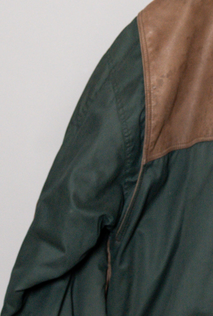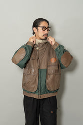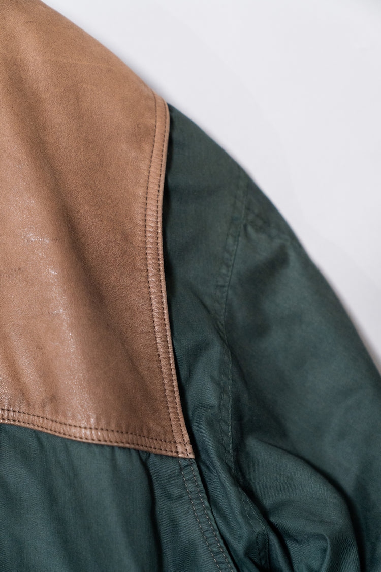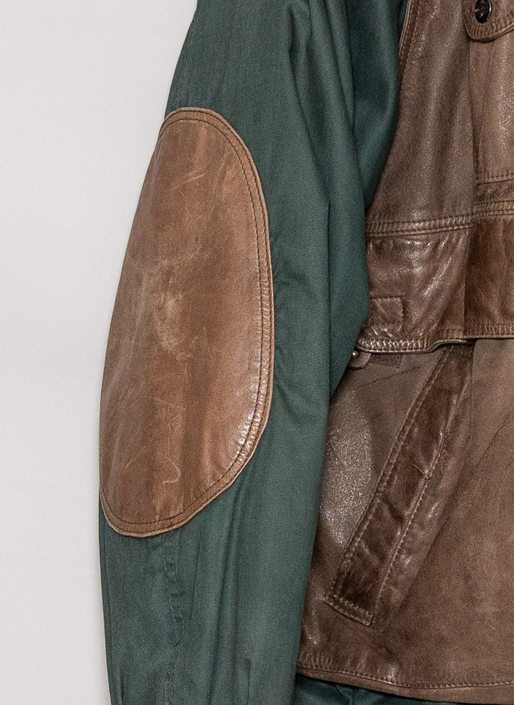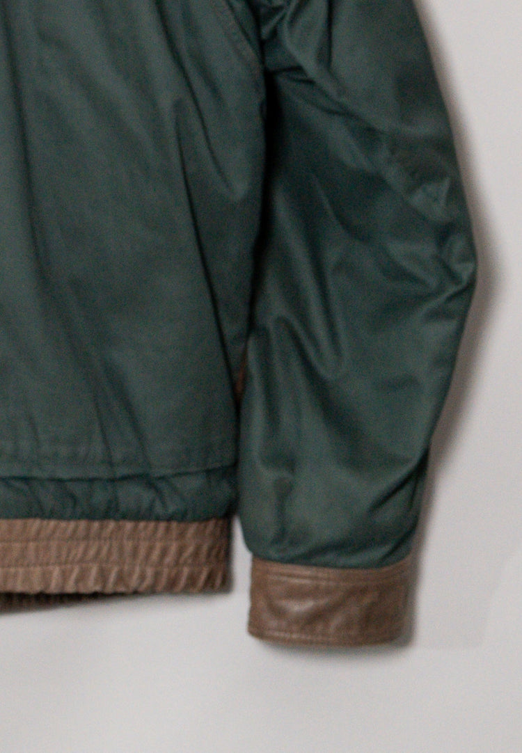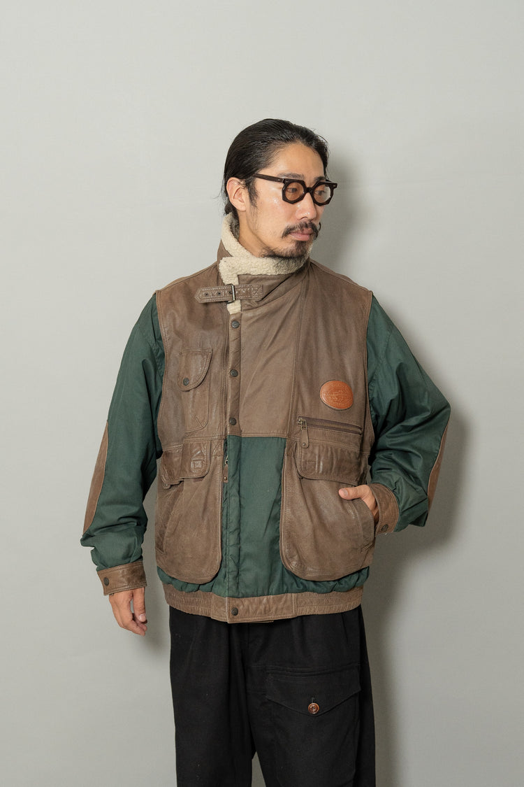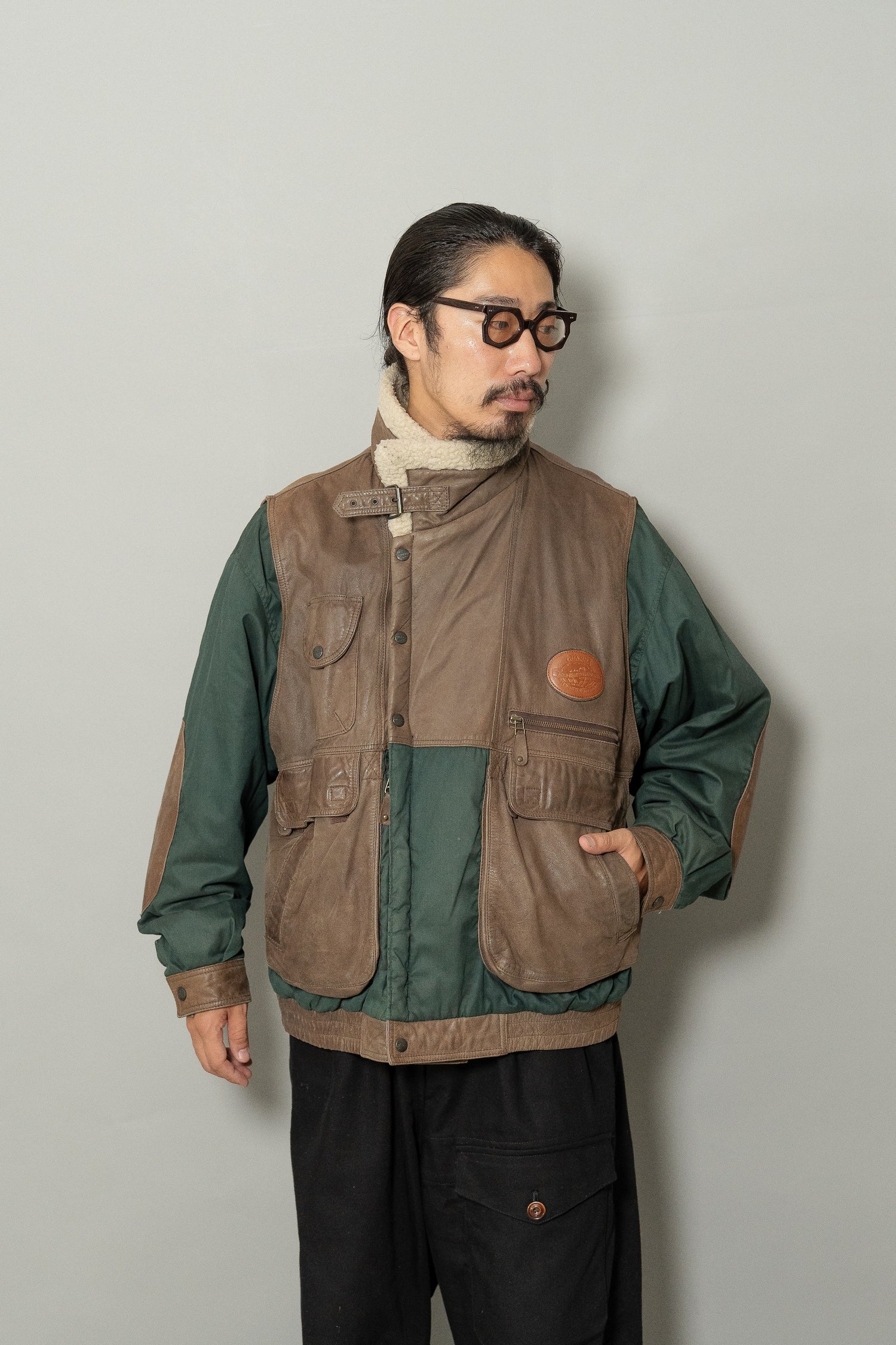 この「Leather & Nylon Boa Flight Jacket」は、その名の通り、フライトジャケットをベースとしながら、素材の切り替えやディテールによってオリジナルな存在感を放っています。まず目を引くのは、ボディ前面に大胆に配されたブラウンのレザーと、袖や背面を覆う深緑のナイロンとの切り替えです。ナイロンの軽快さとレザーの重厚さが共存することで、実用性とラグジュアリー感が同時に表現されています。