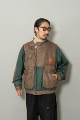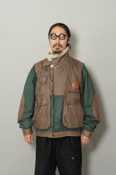 ディテールを見ていくと、フロントには複数のポケットが配され、ジップやフラップ、スナップボタンといった多様な仕様が組み合わされています。これらは収納性を確保する実用的な役割を担うと同時に、視覚的なリズムを生み、全体のデザインに立体感を与えています。さらに袖には大きなエルボーパッチが施されており、摩耗しやすい部分を補強する実用性に加えて、クラシックなハンティングジャケットやアウトドアウェアの雰囲気を漂わせています。